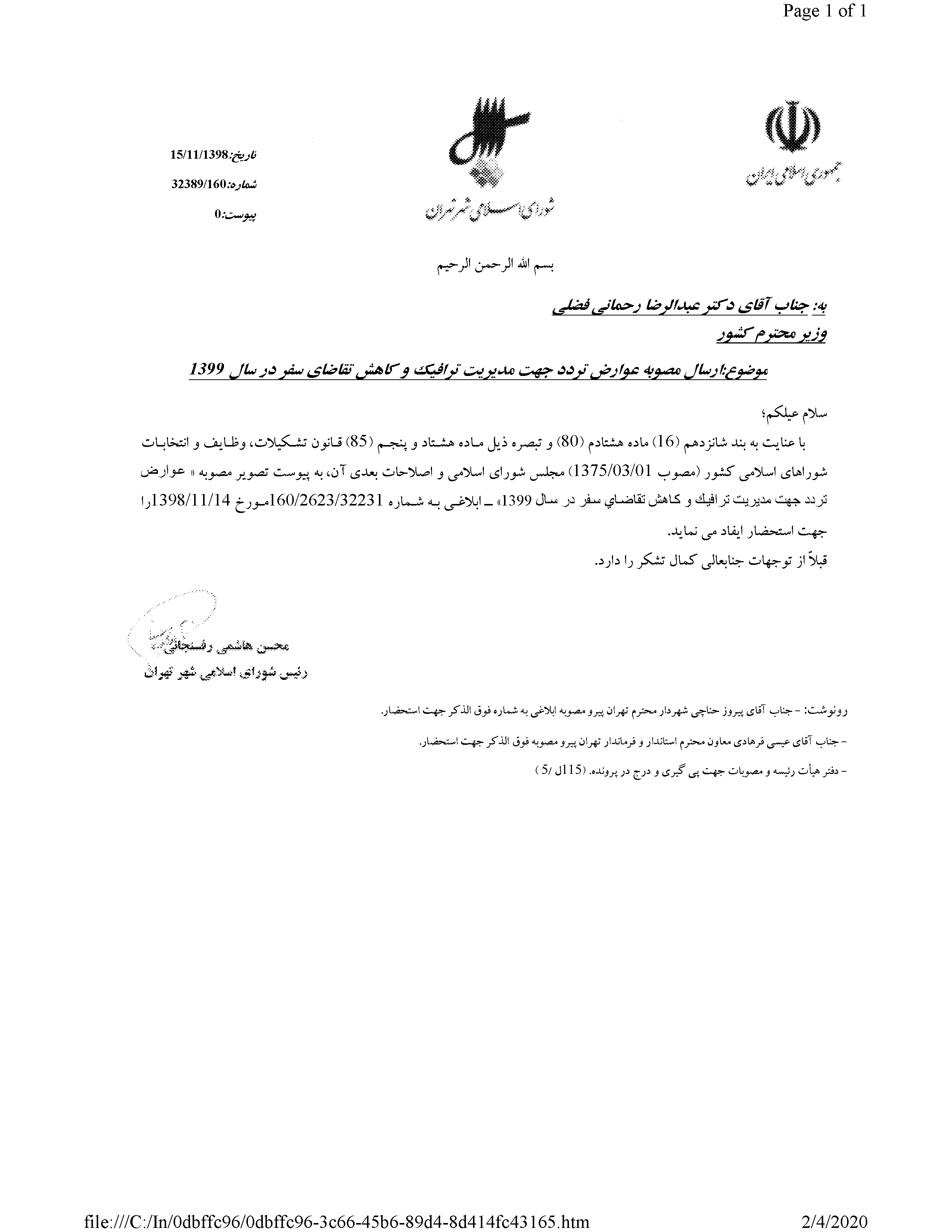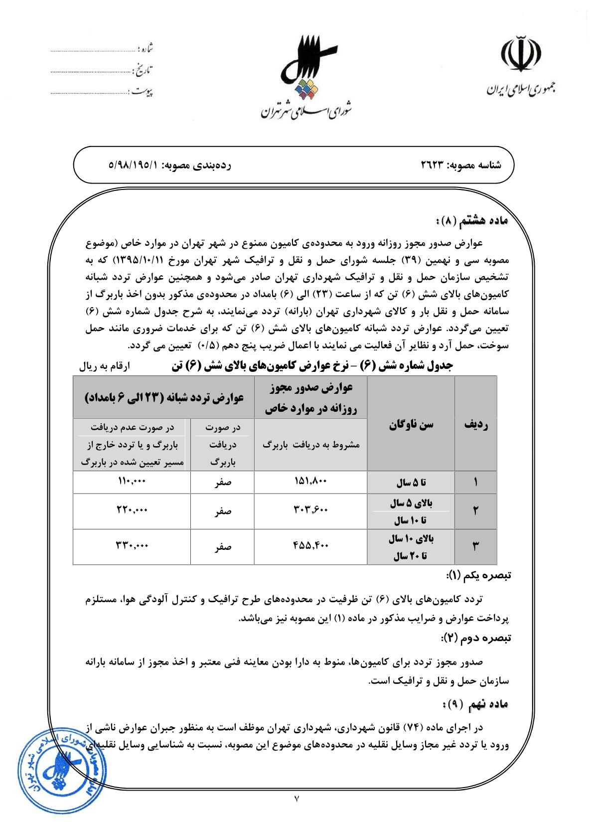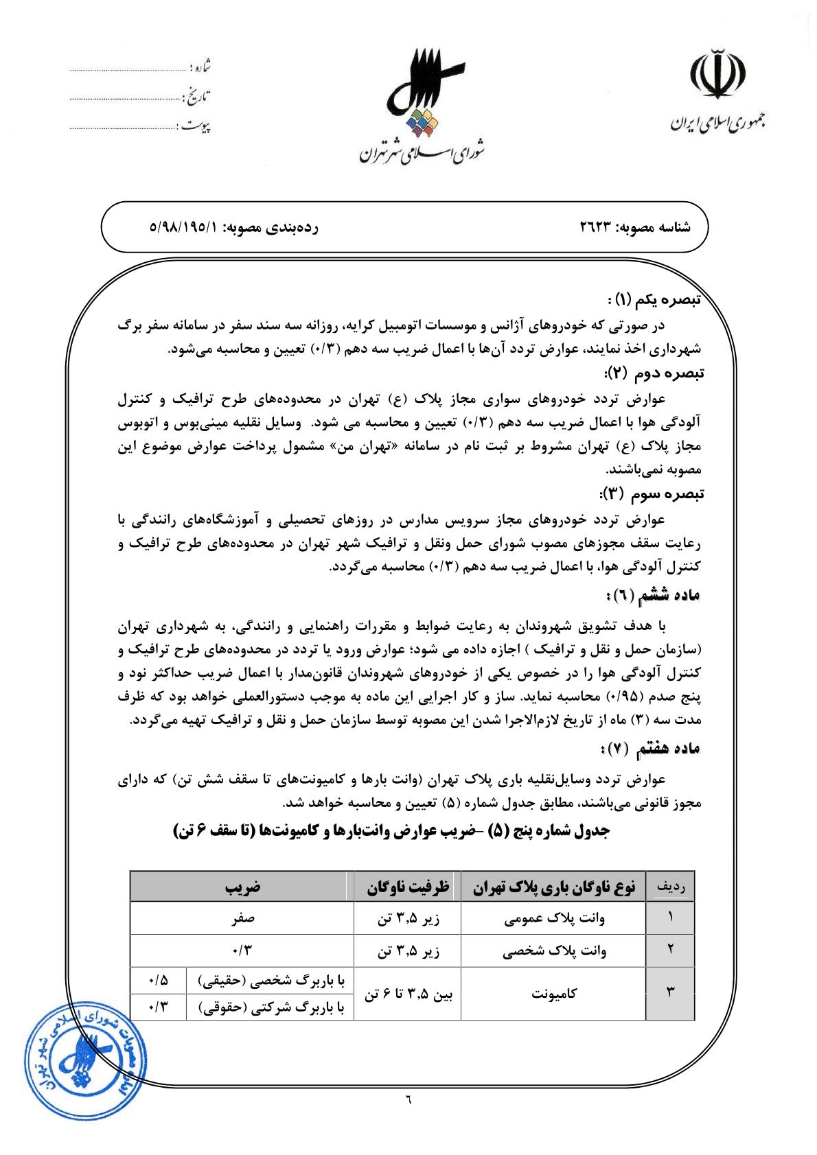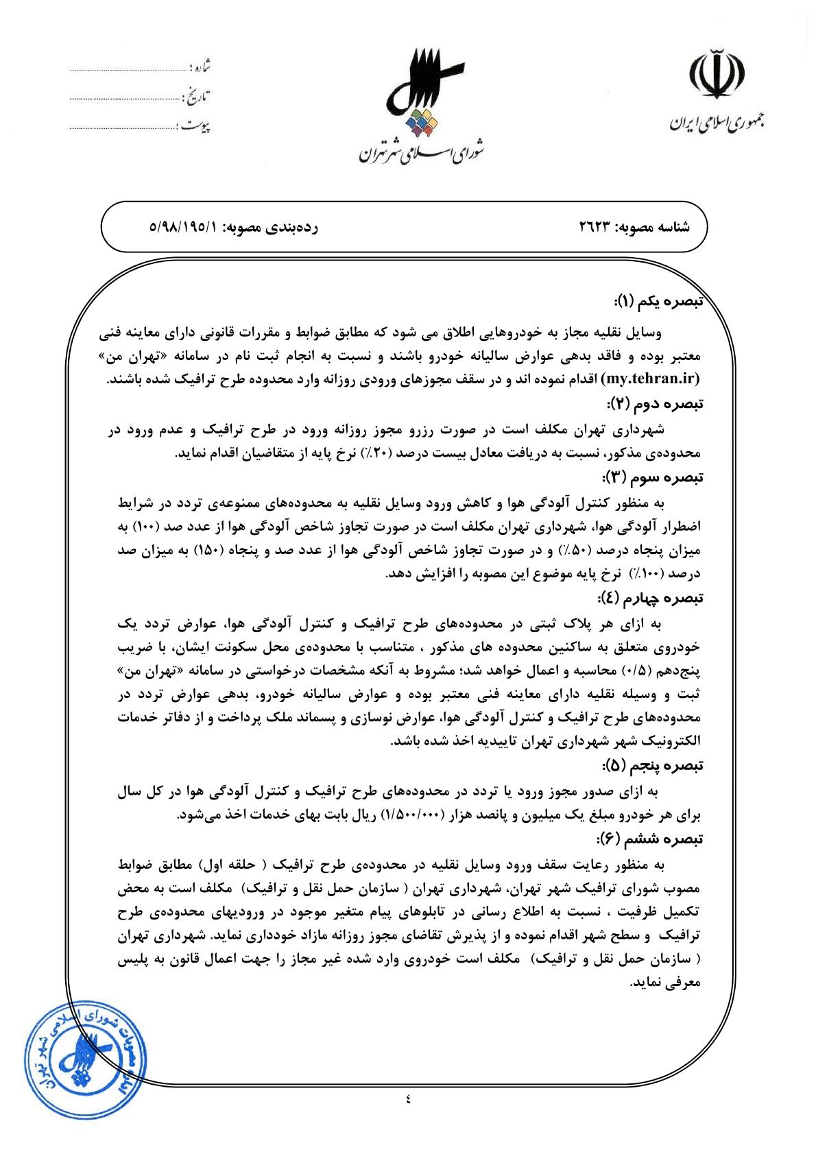 عوارض تردد جهت مديريت ترافيك، كاهش تقاضاي سفر و كنترل آلودگي هوا در سال ۱۳۹۹
