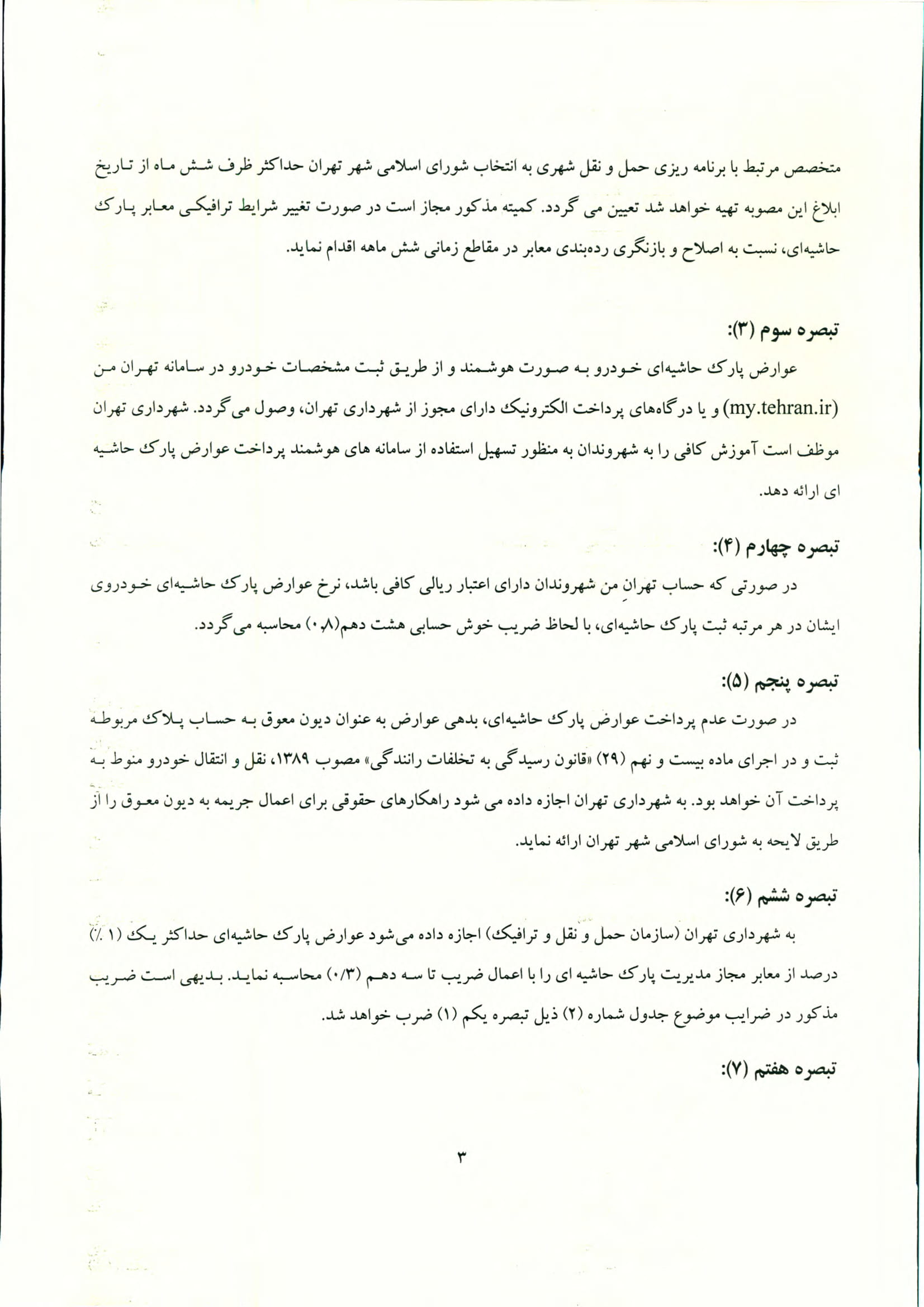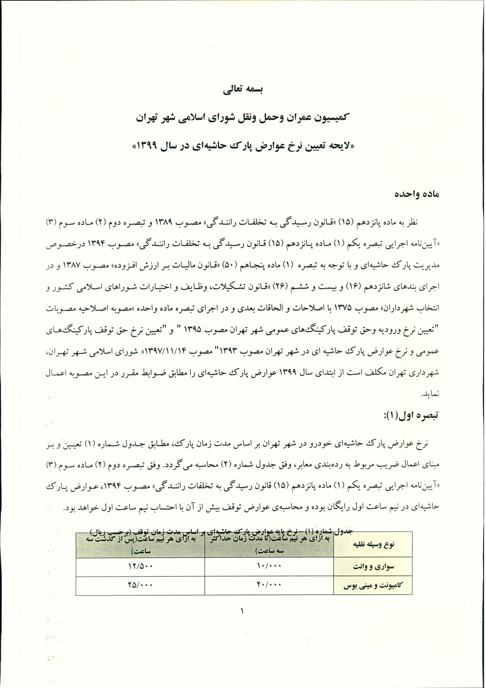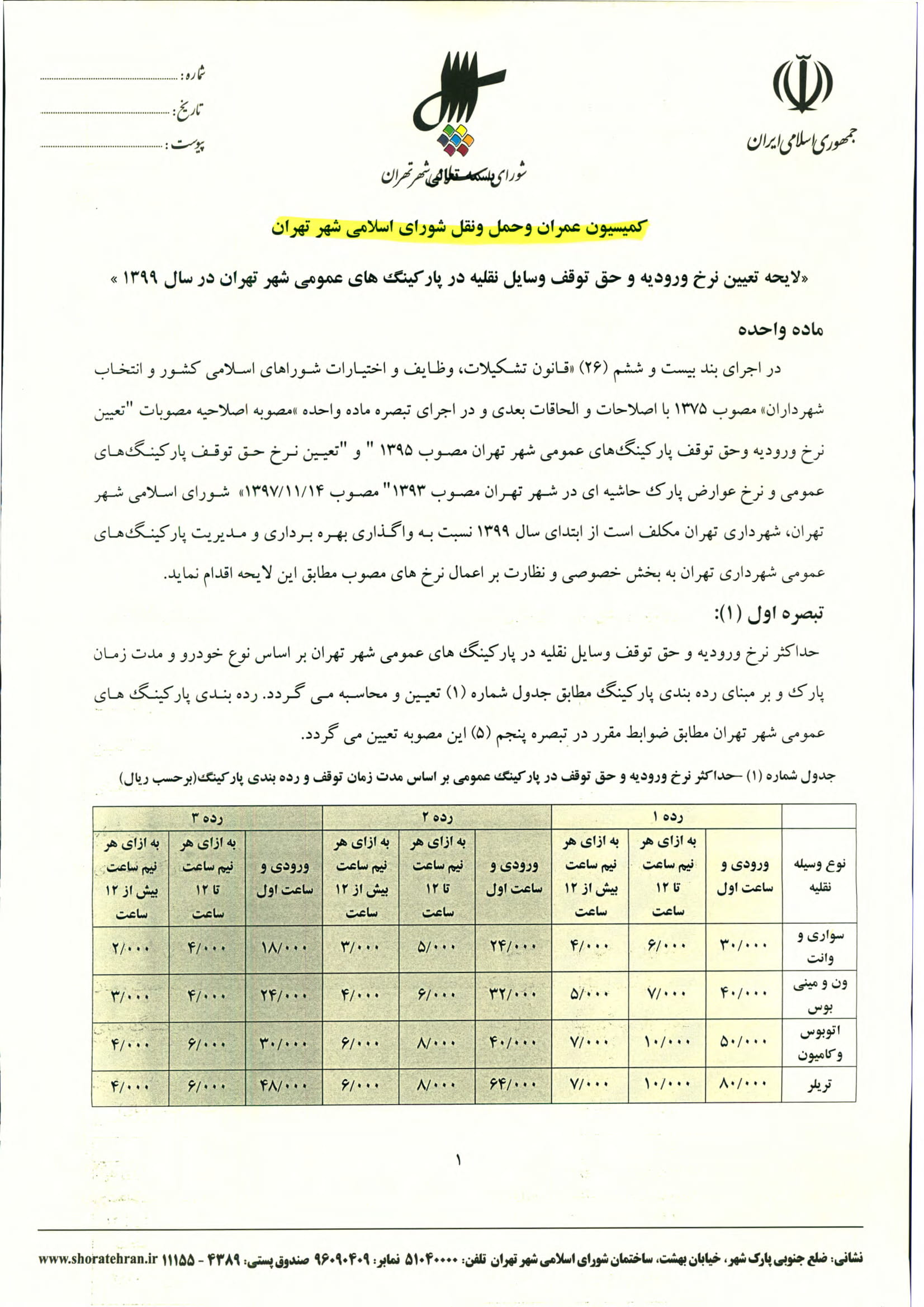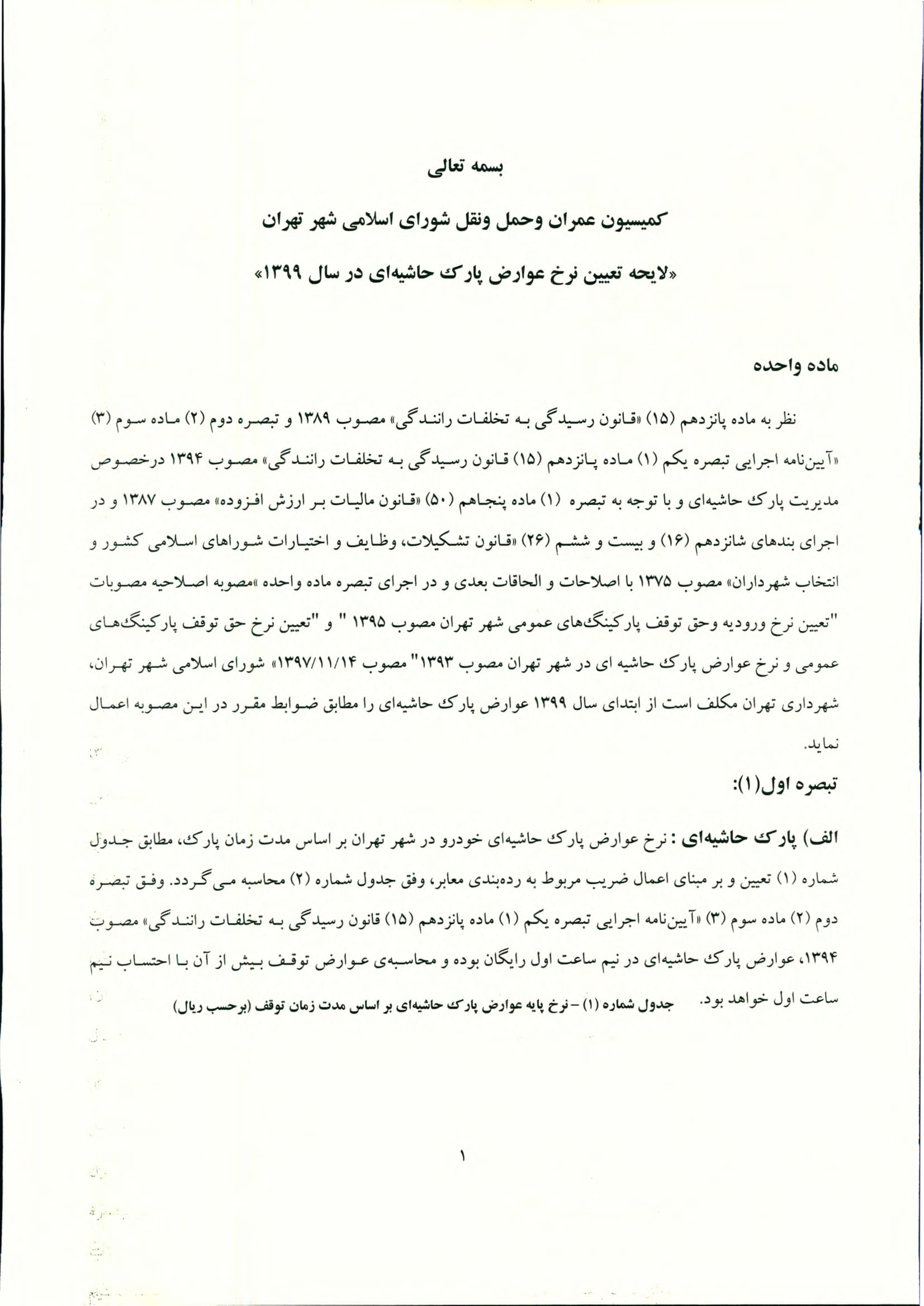 تعيين نرخ عوارض پارك حاشيهاي در سال 1399 و تعيين ضوابط واگذاري بهرهبرداري از پاركينگهاي عمومي شهرداري تهران