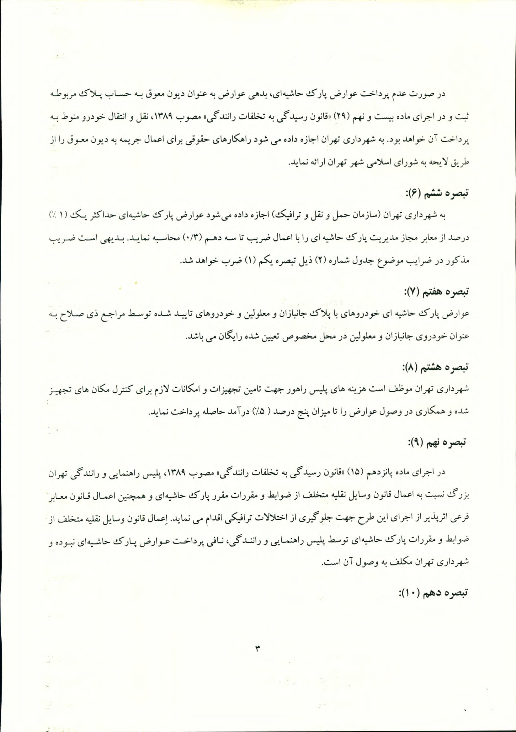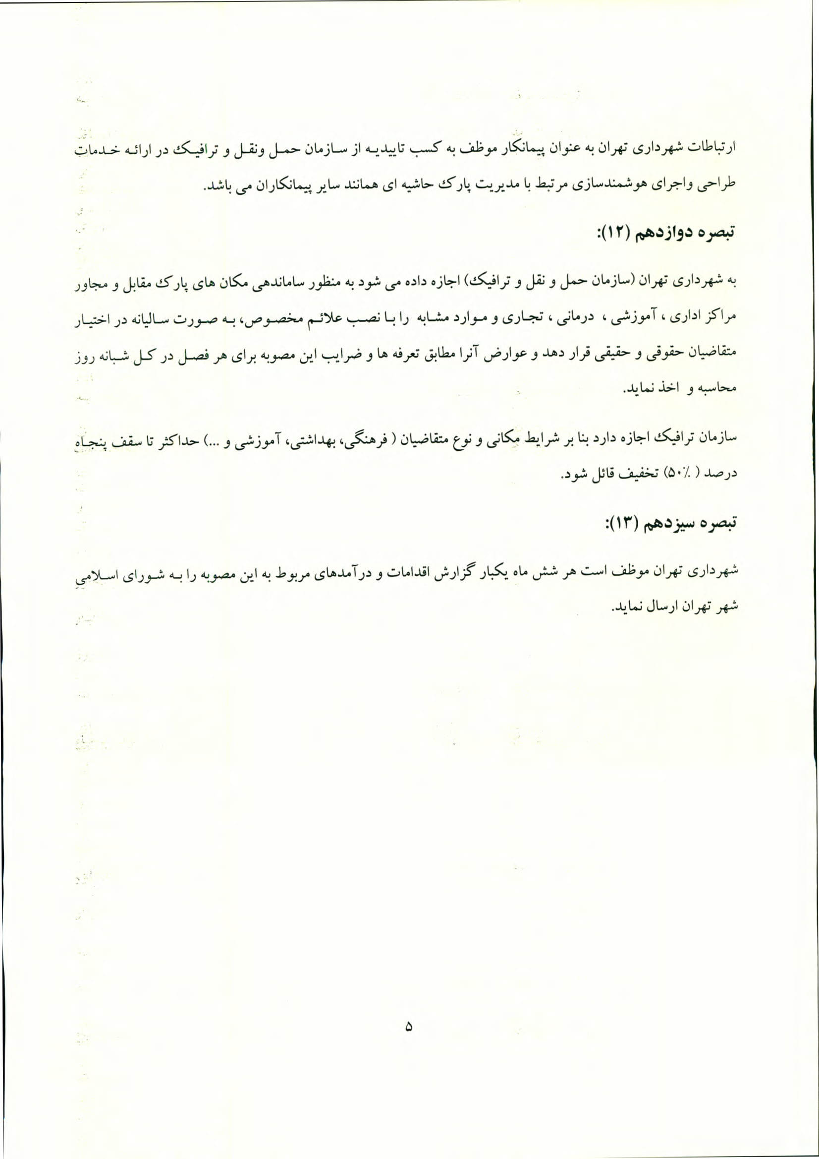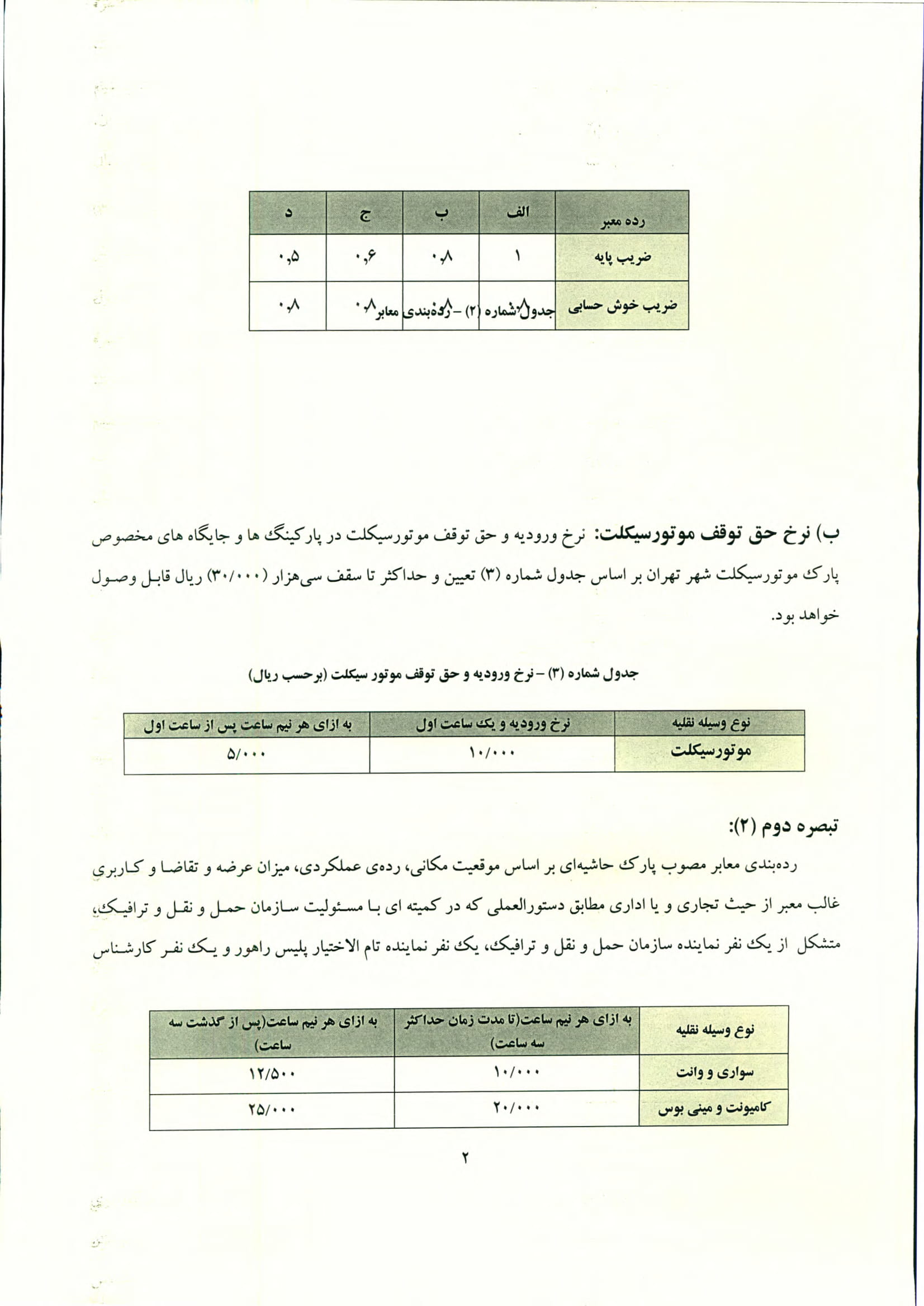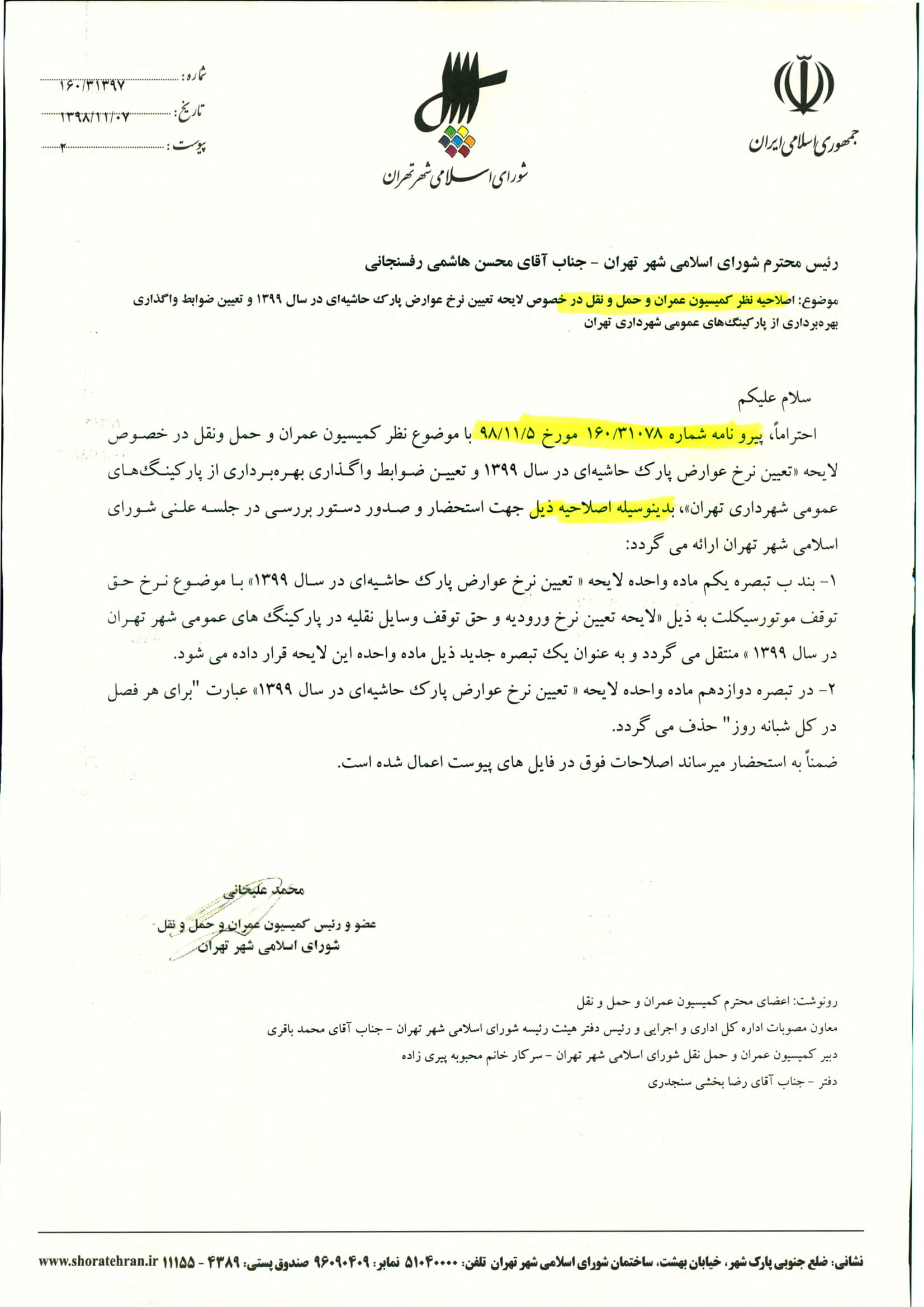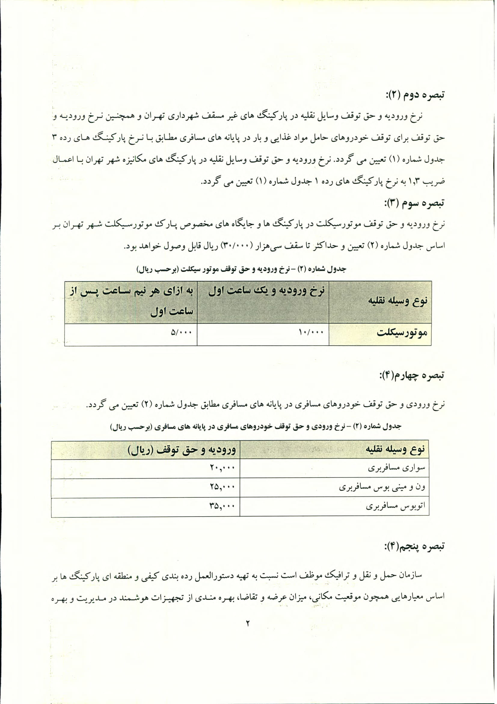 تعيين نرخ عوارض پارك حاشيهاي در سال 1399 و تعيين ضوابط واگذاري بهرهبرداري از پاركينگهاي عمومي شهرداري تهران
