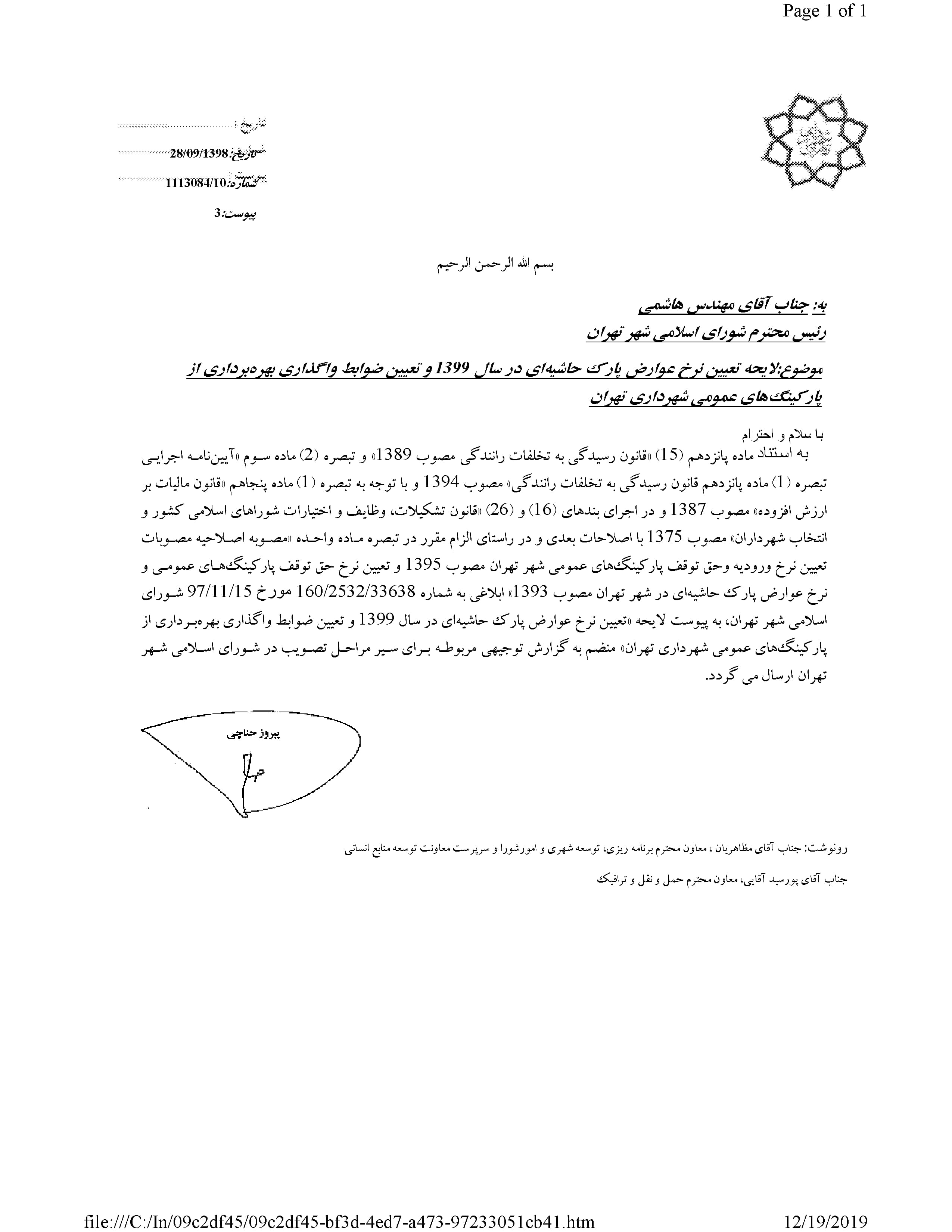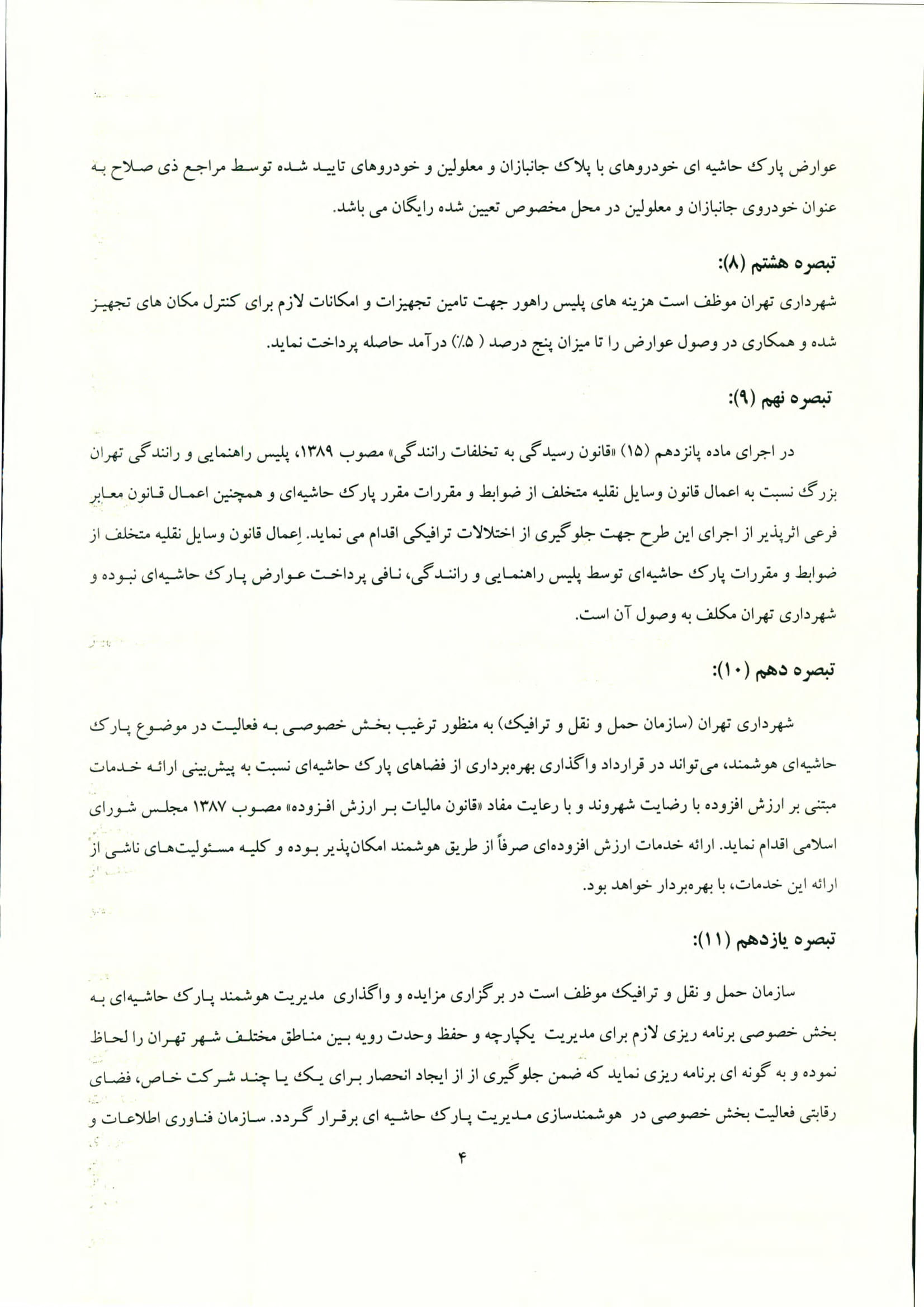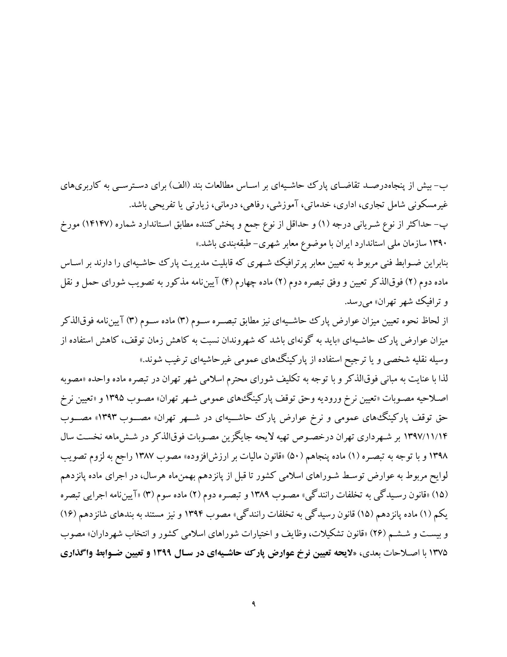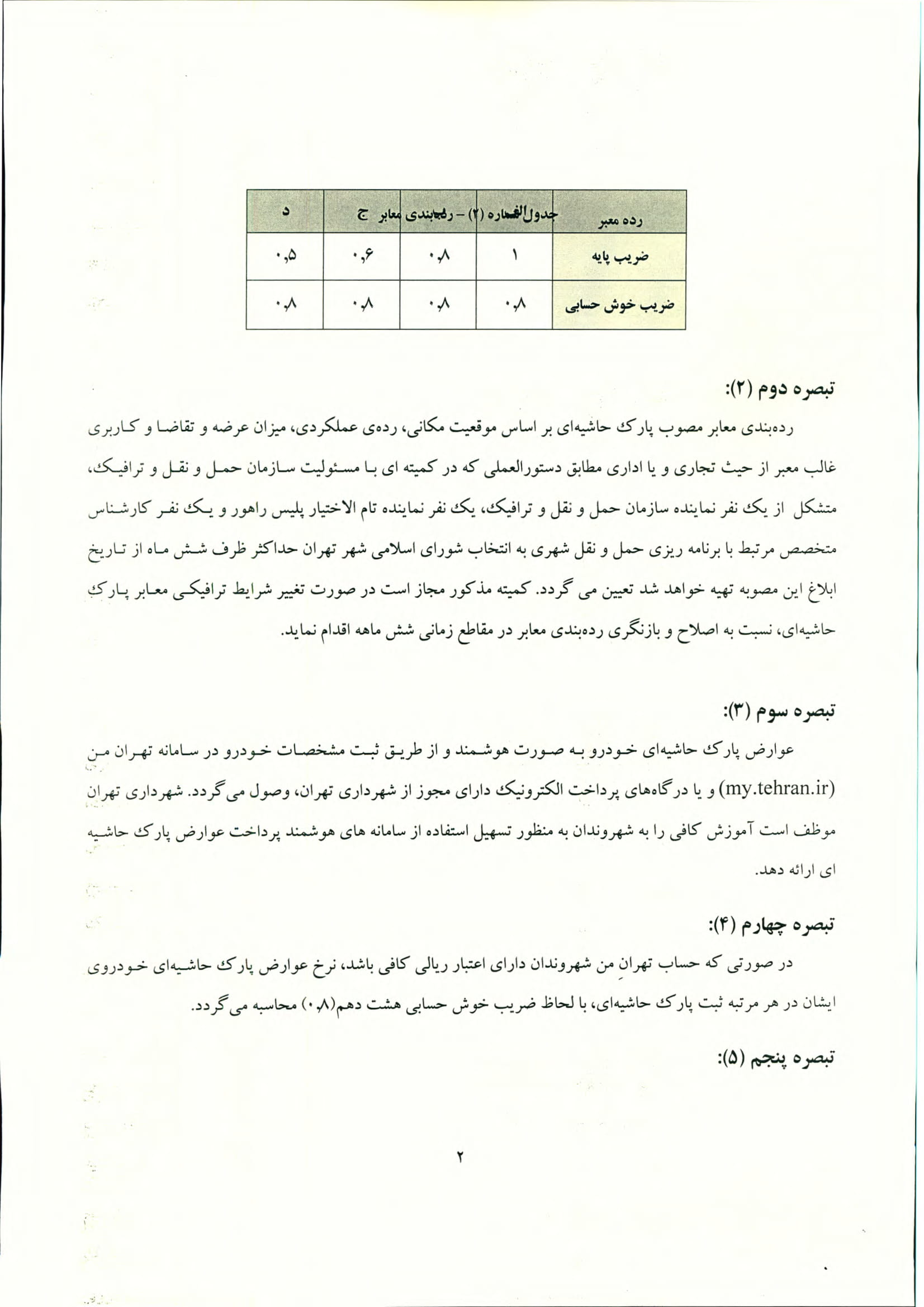 تعيين نرخ عوارض پارك حاشيهاي در سال 1399 و تعيين ضوابط واگذاري بهرهبرداري از پاركينگهاي عمومي شهرداري تهران