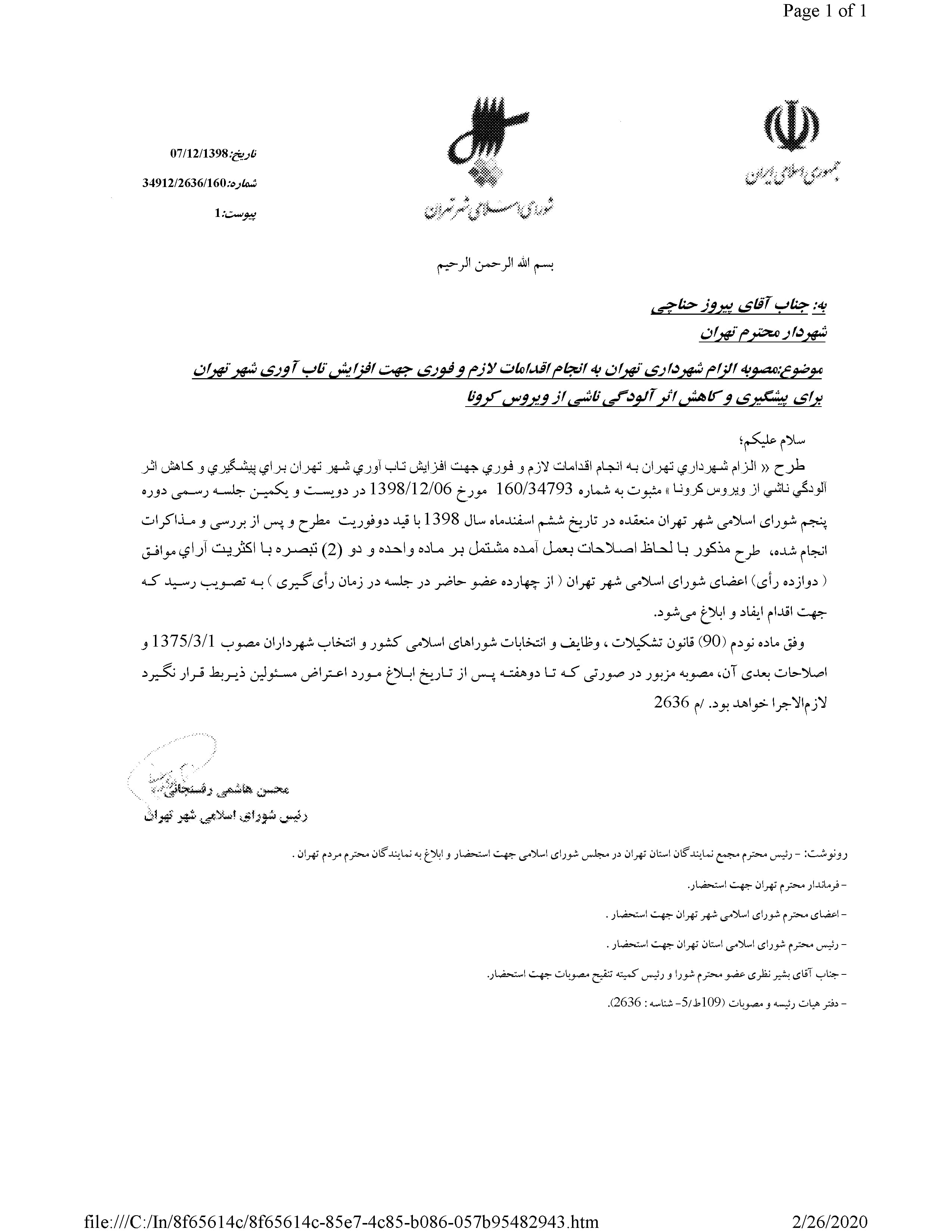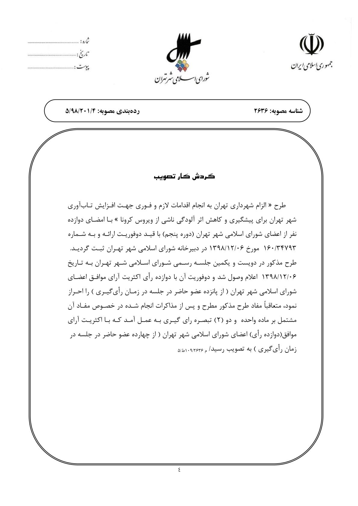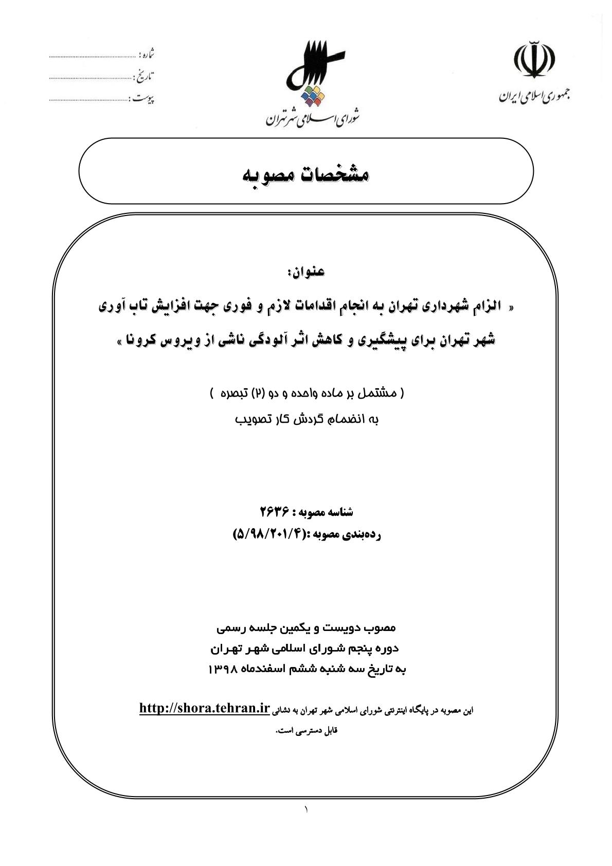 الزام شهرداري تهران به انجام اقدامات لازم و فوري جهت افزايش تاب آوري شهر تهران براي پيشگيري وكاهش اثر آلودگي ناشي از ويروس كرونا