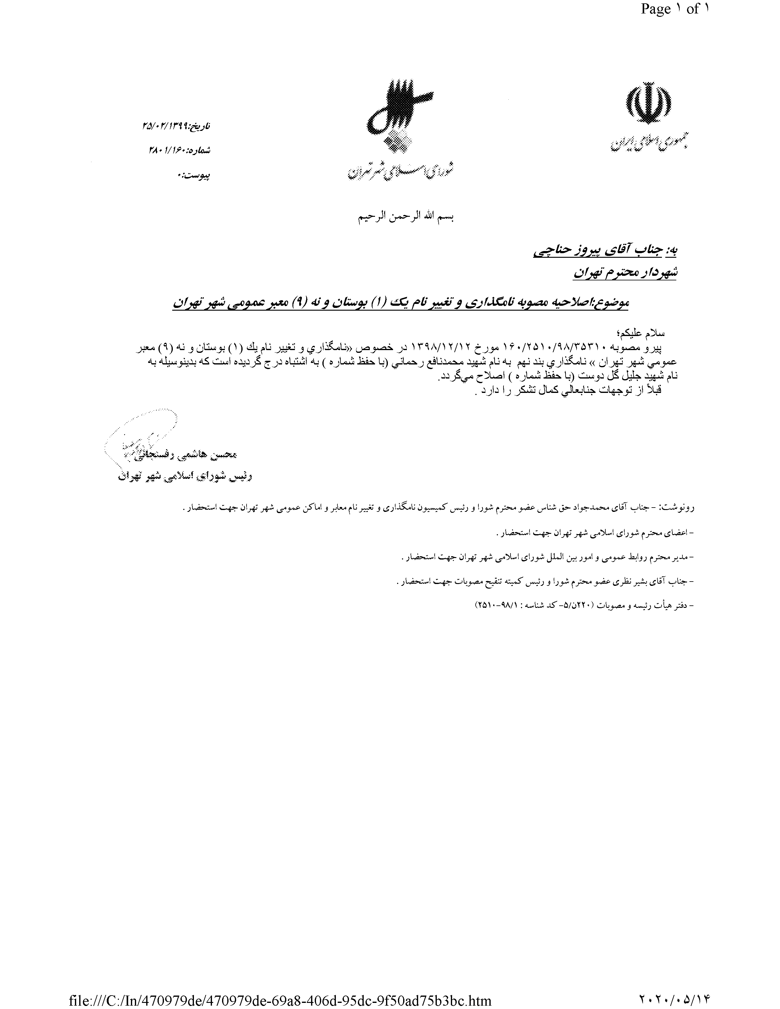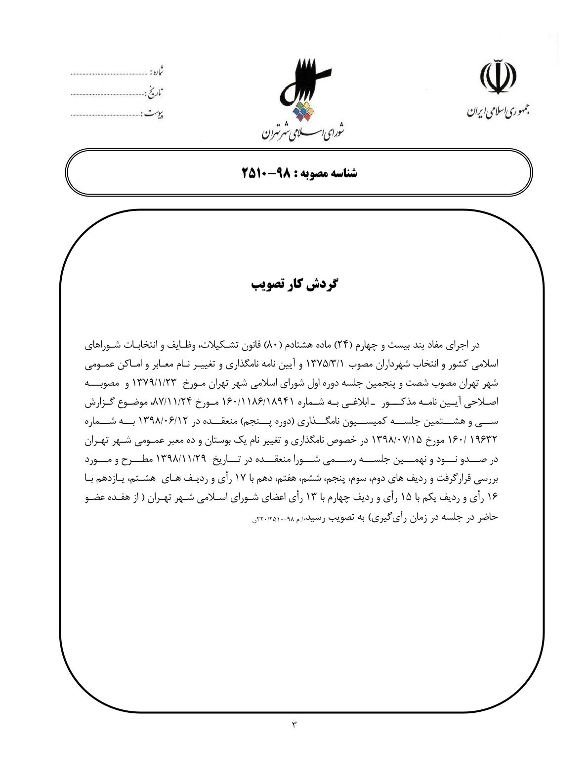 نامگذاري و تغيير نام يك (۱) بوستان و نه (۹) معبر عمومي شهر تهران