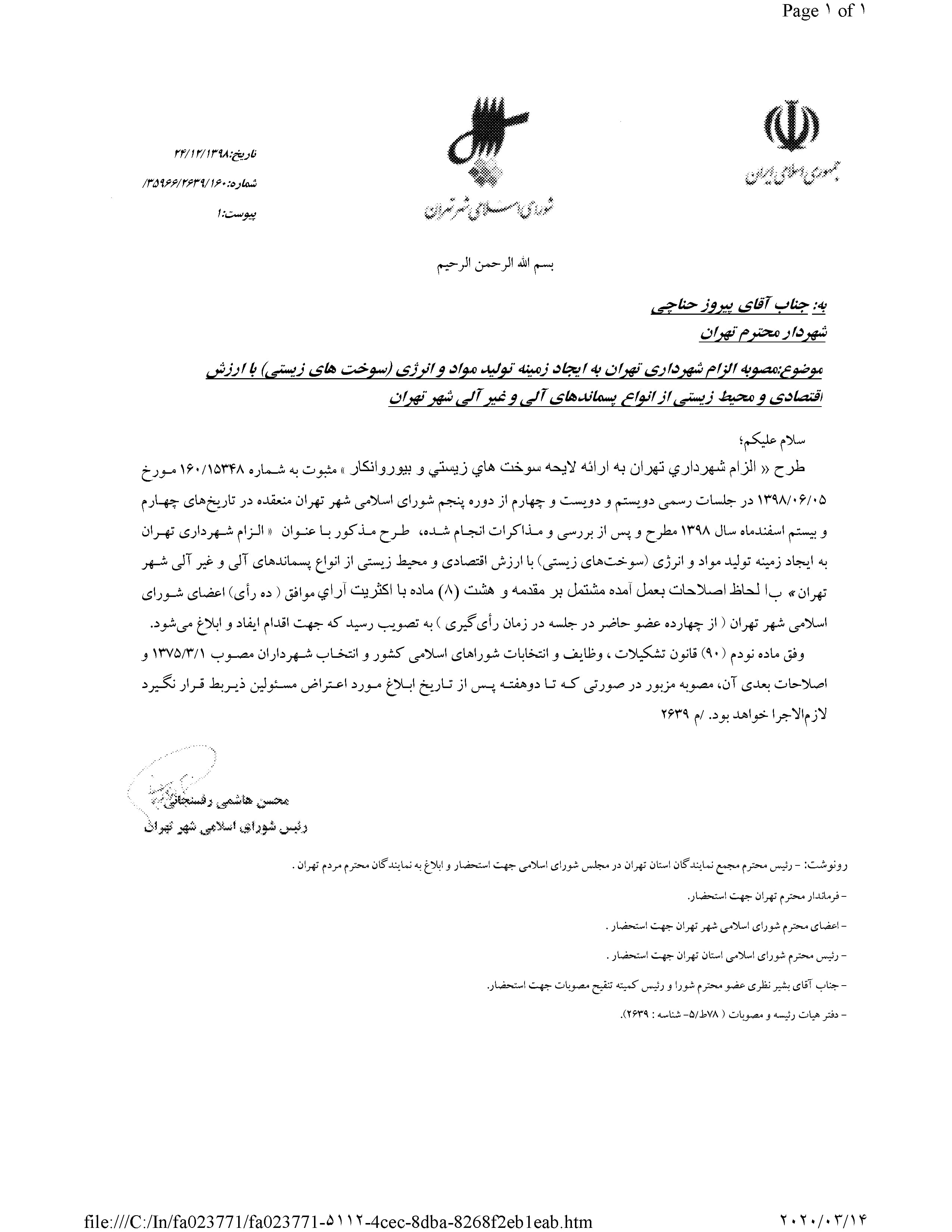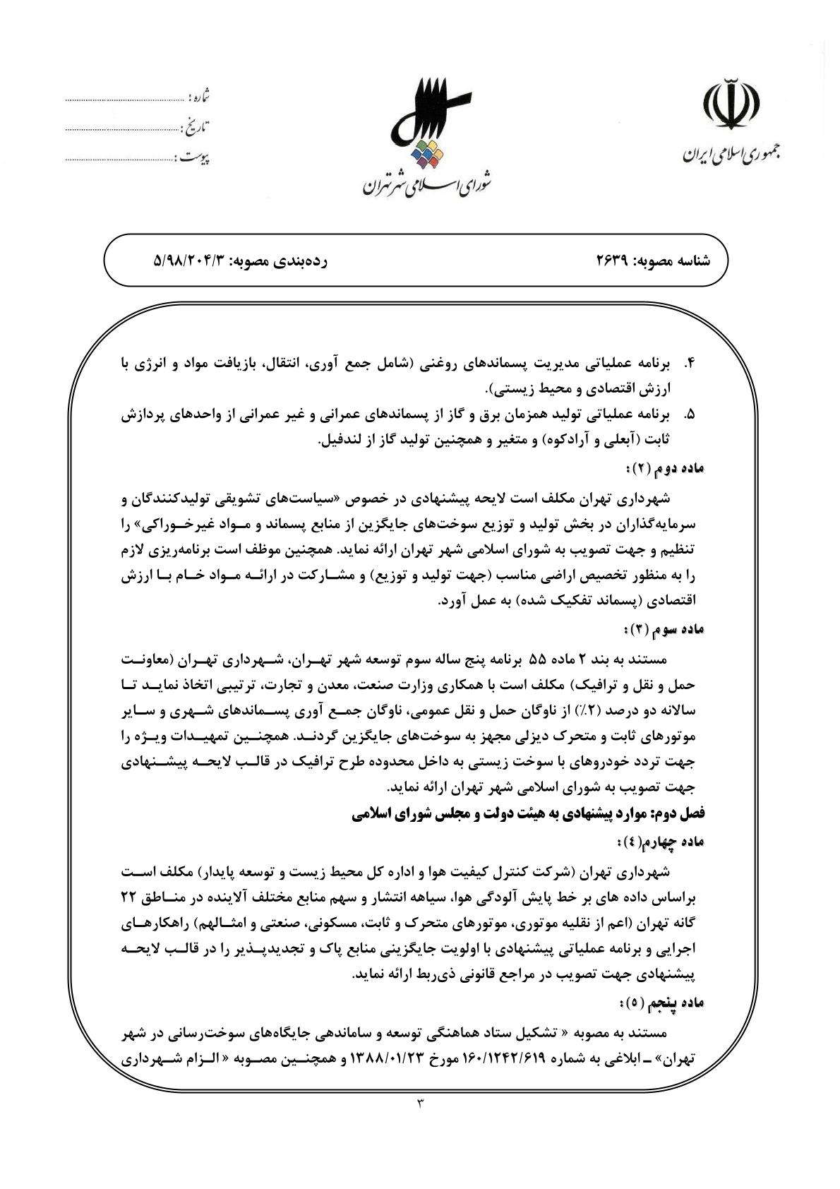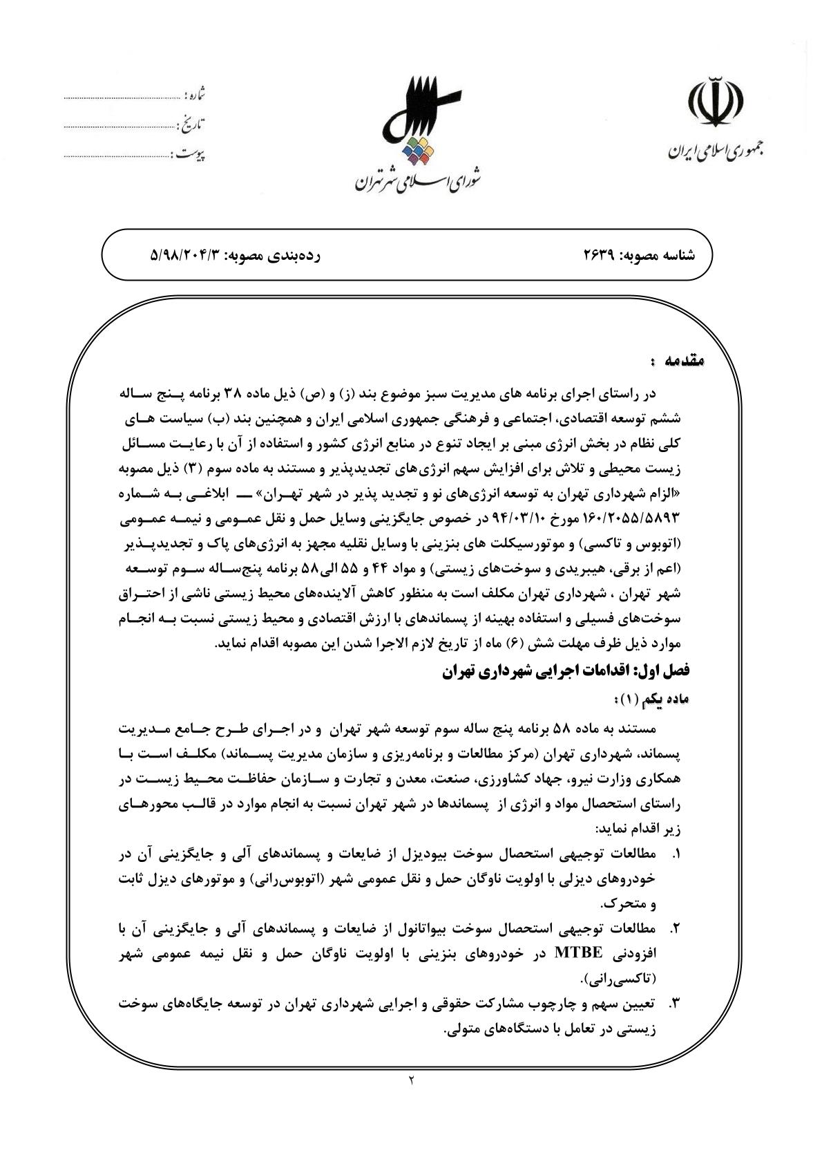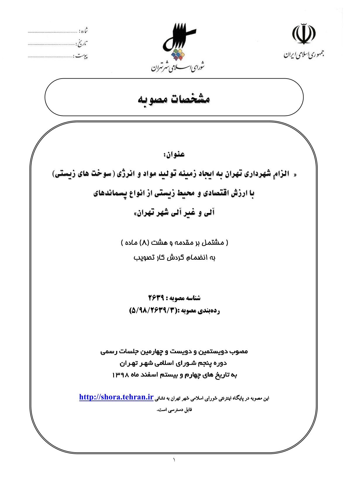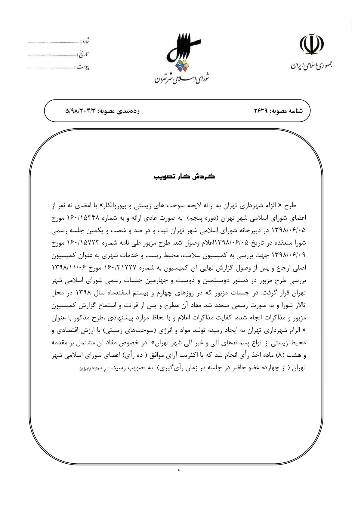 الزام شهرداري تهران به ايجاد زمينه توليد مواد و انرژي (سوختهاي زيستي) با ارزش اقتصادي و محيط زيستي از انواع پسماندهاي آلي و غيرآلي شهر تهران