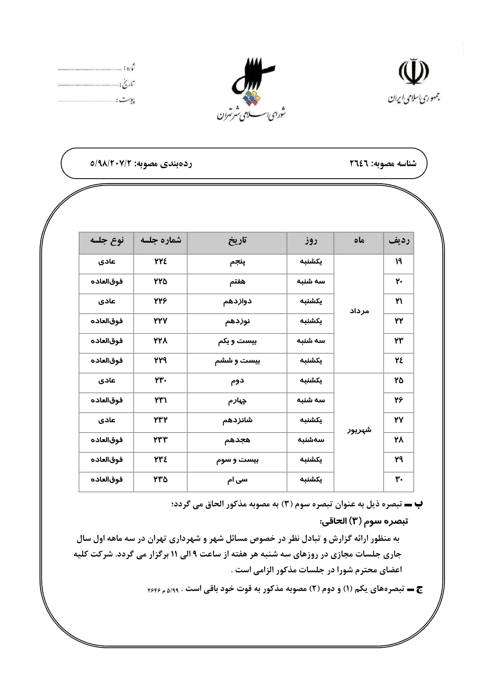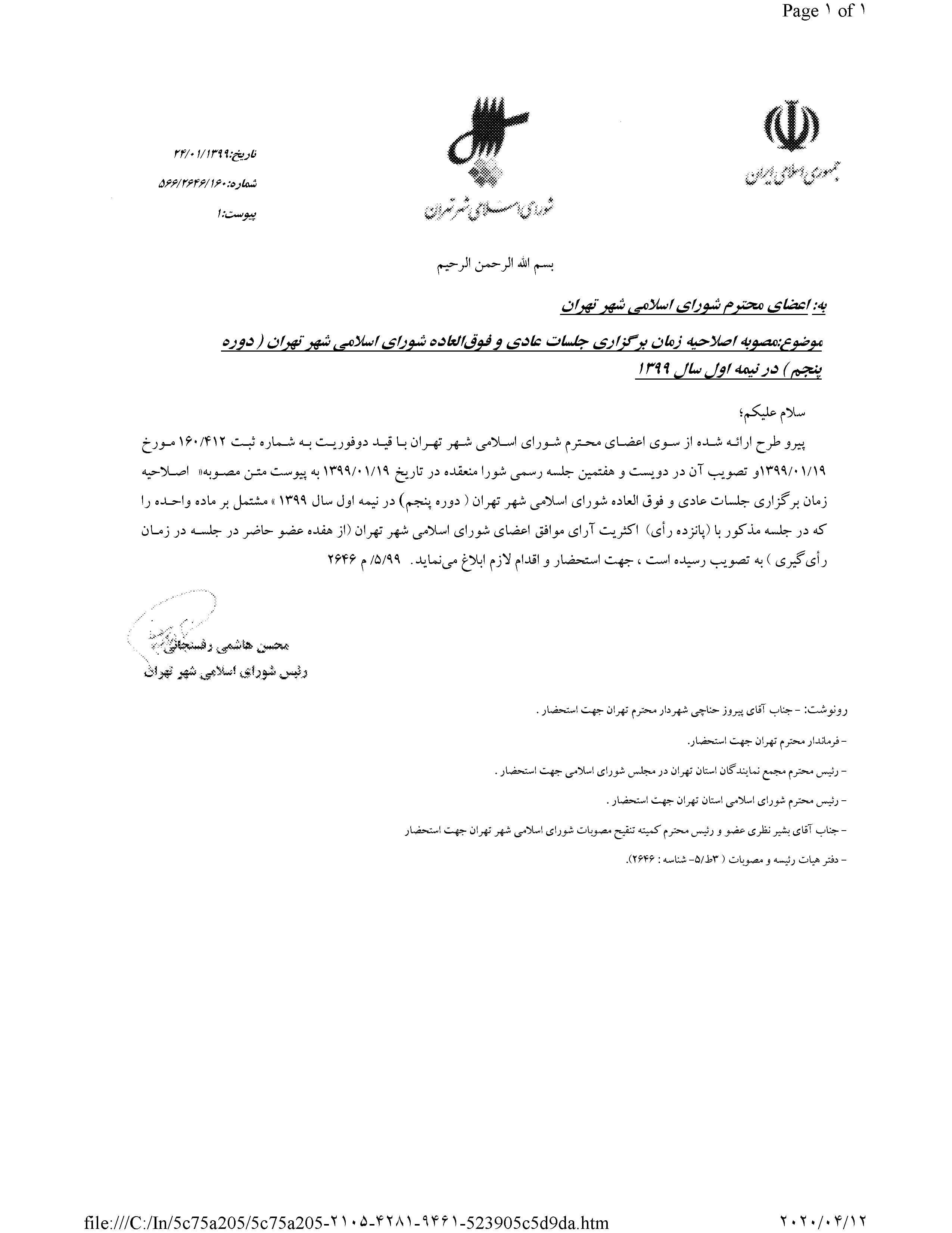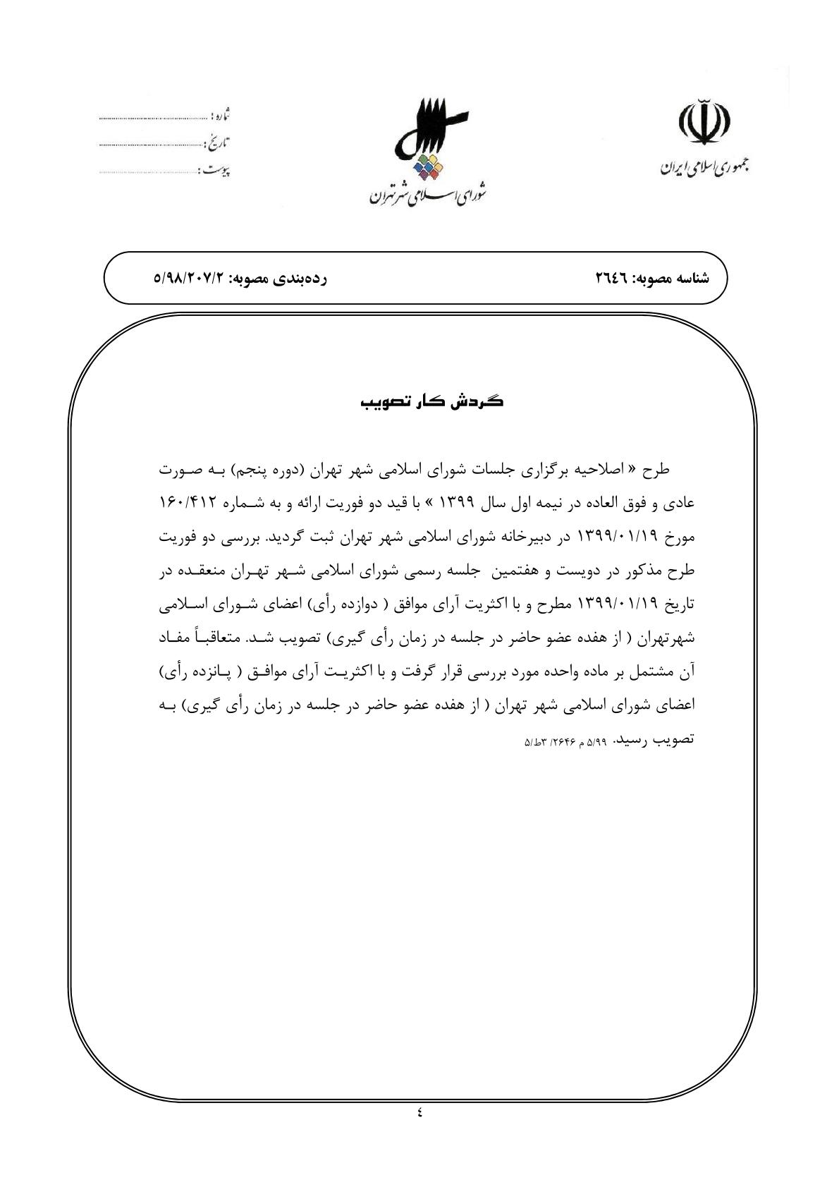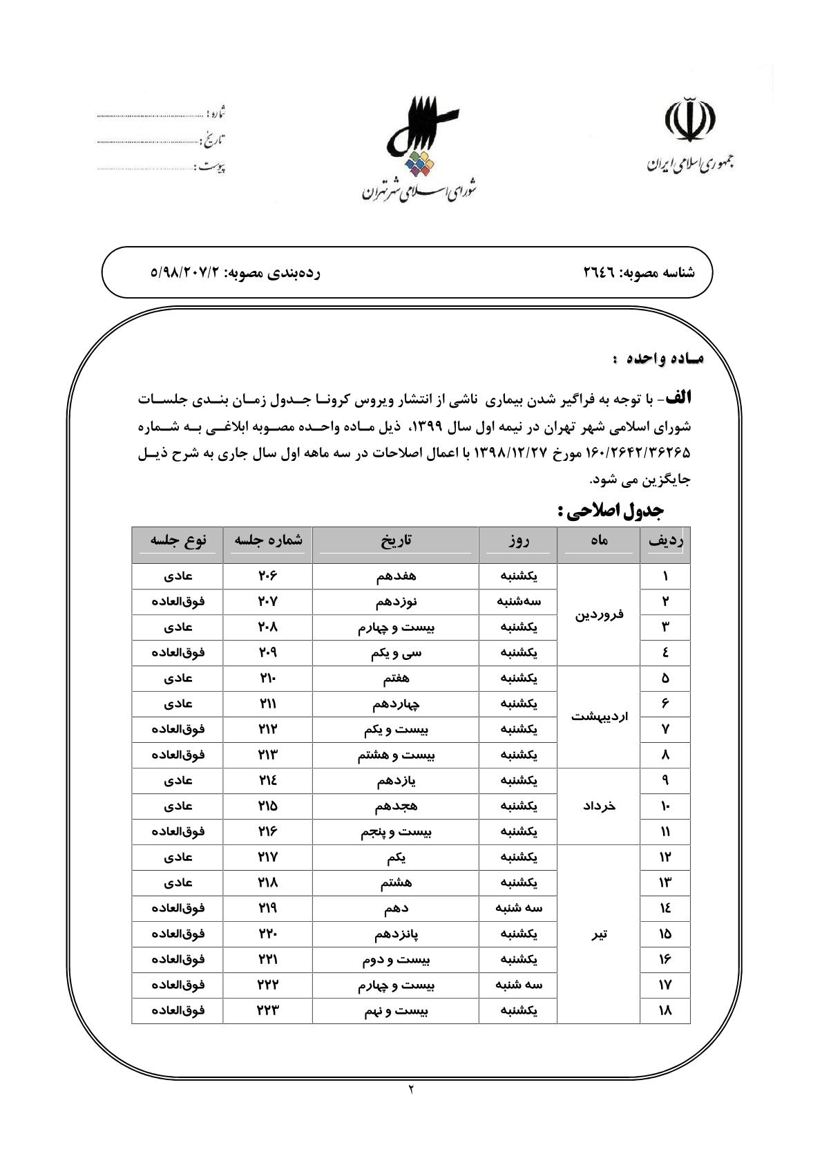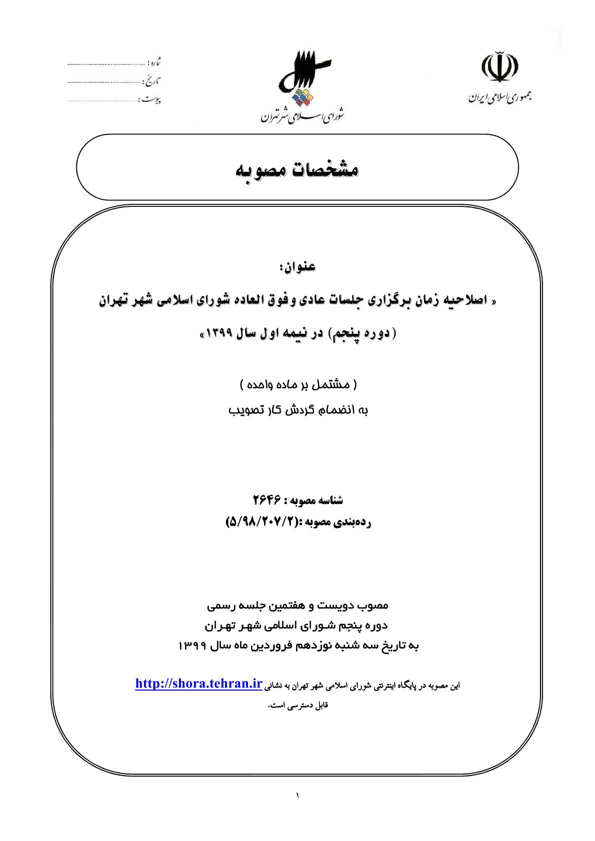 اصلاحيه زمان برگزاري جلسات عادي و فوقالعاده شوراي اسلامي شهر تهران (دور پنجم) در نيمه اول سال 1399