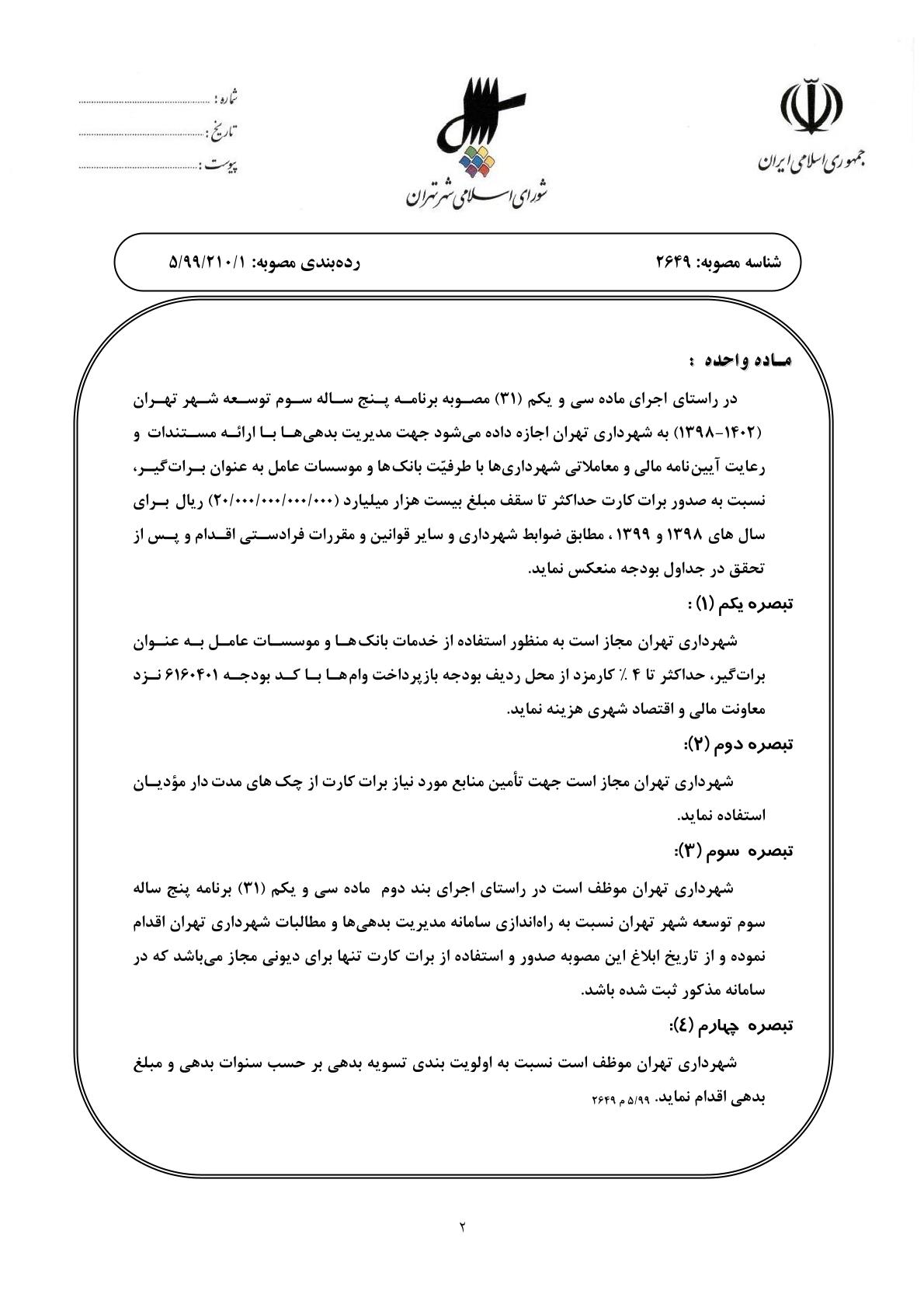 مجوز صدور برات كارت تا سقف بيست هزار و ميليارد (20/000/000/000/000) به منظور مديريت بخشي از بدهيهاي شهرداري تهران
