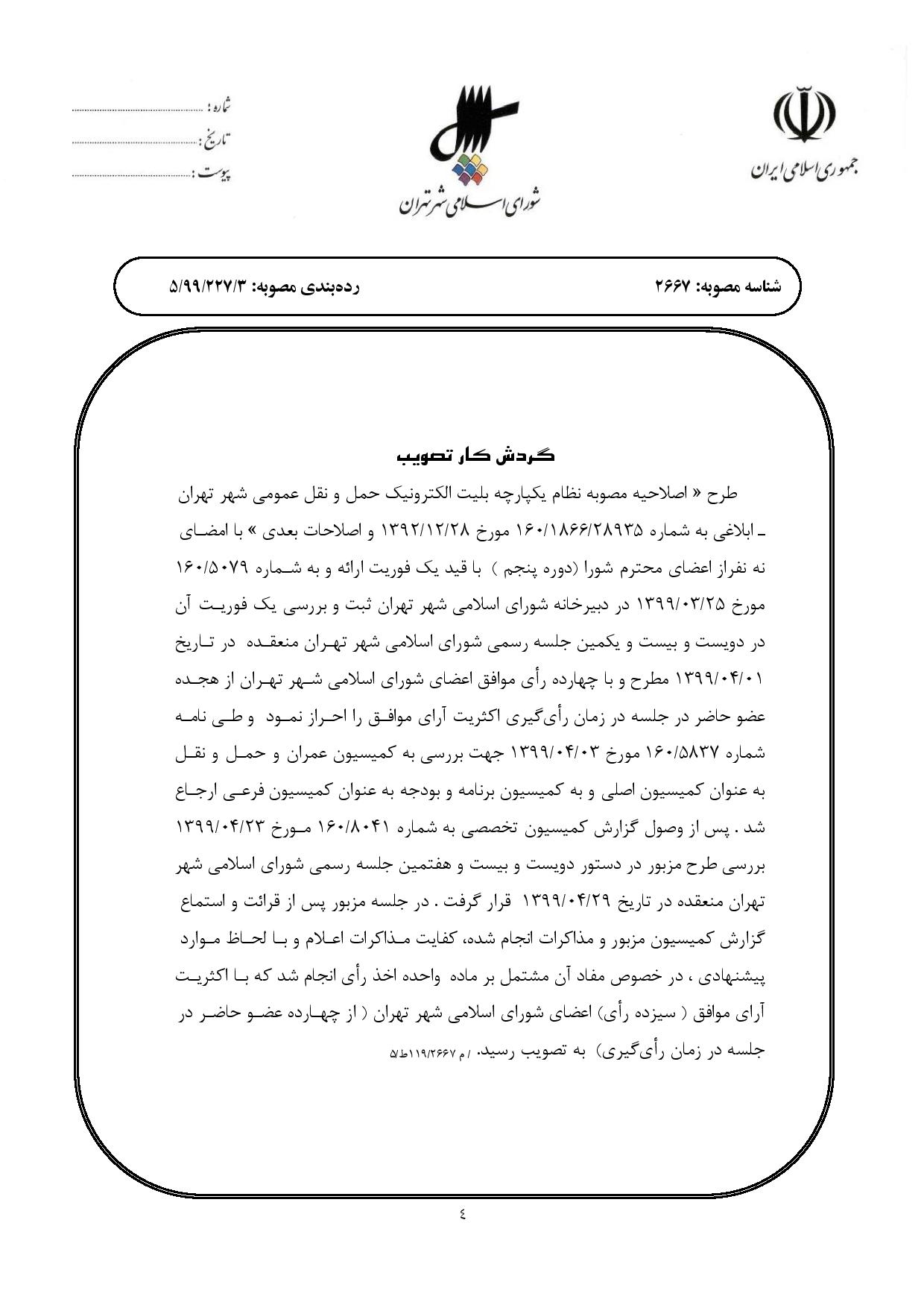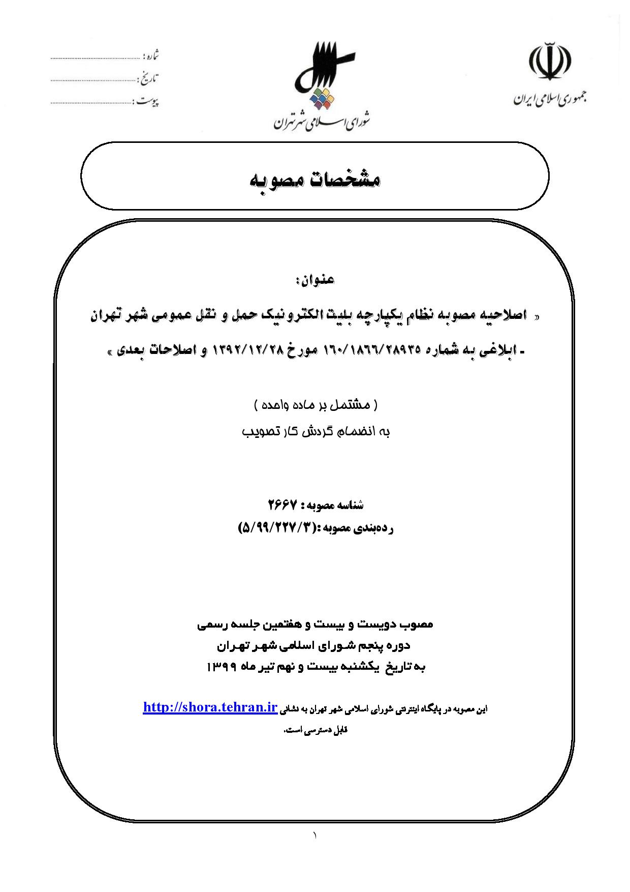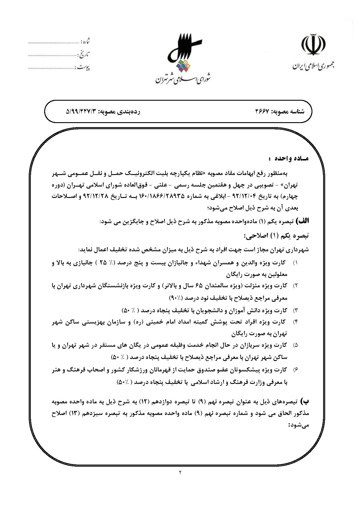اصلاحيه مصوبه نظام يكپارچه بليت الكترونيك حمل و نقل عمومي شهر تهران ابلاغي به شماره 160/1866/28935 مورخ 1392/12/28 و اصلاحات بعدي