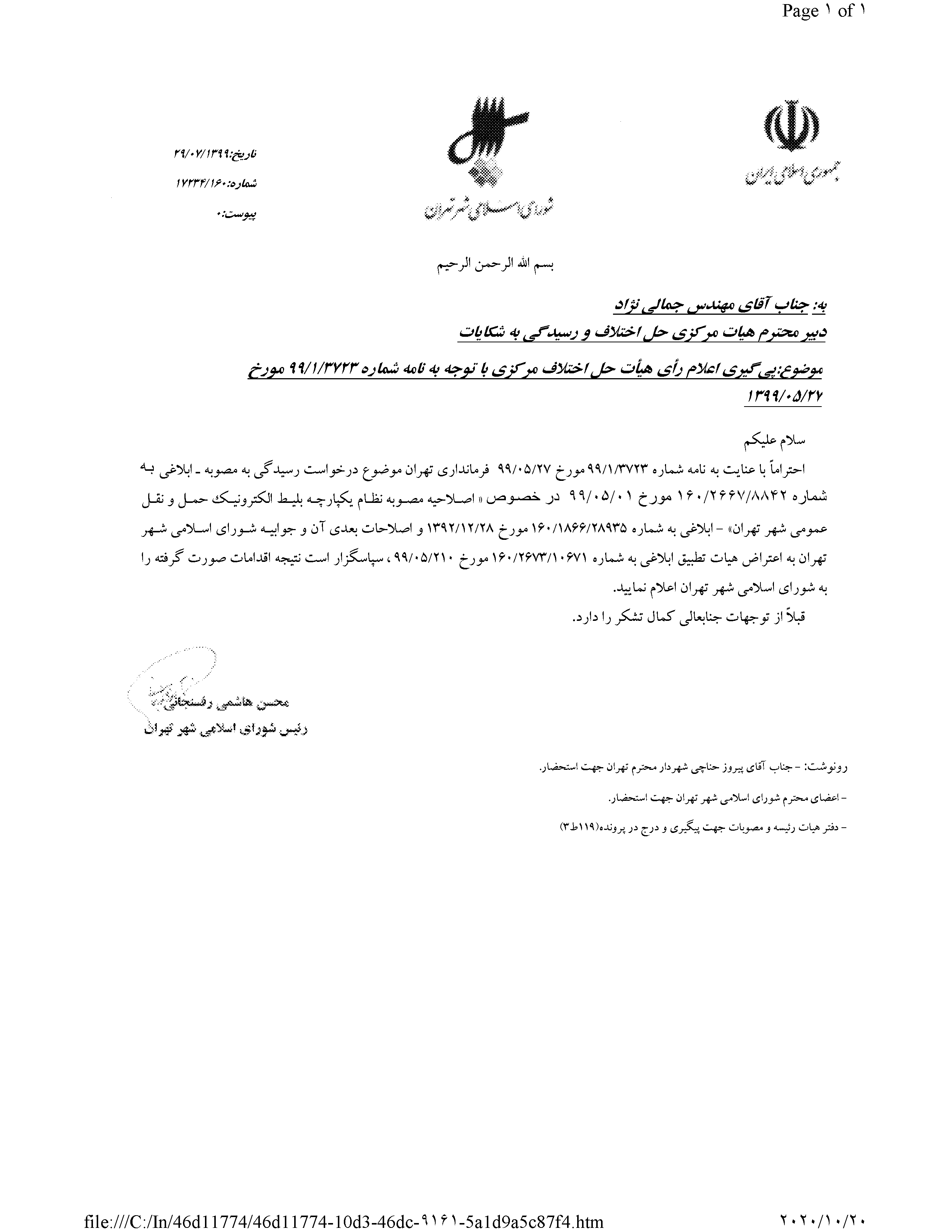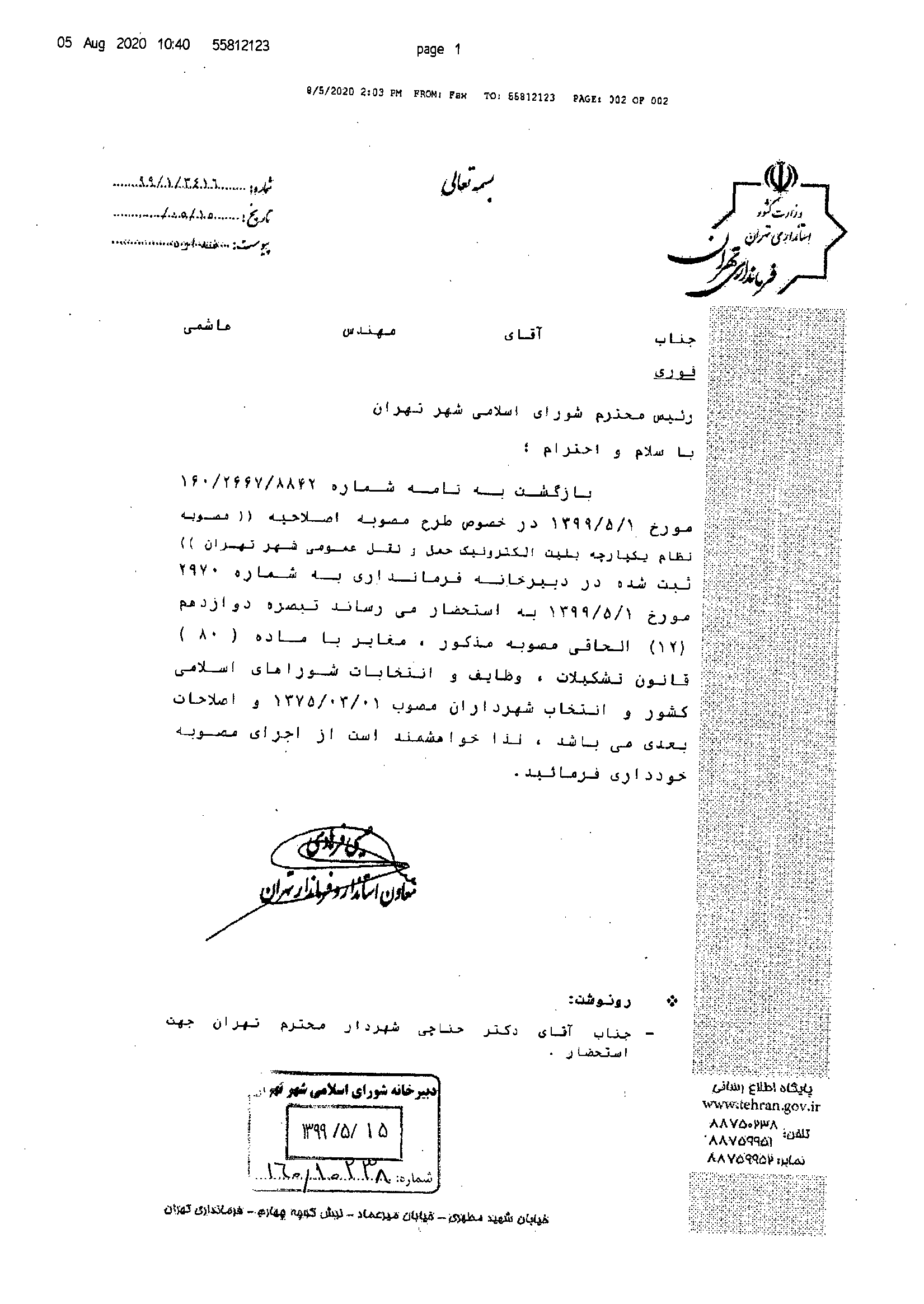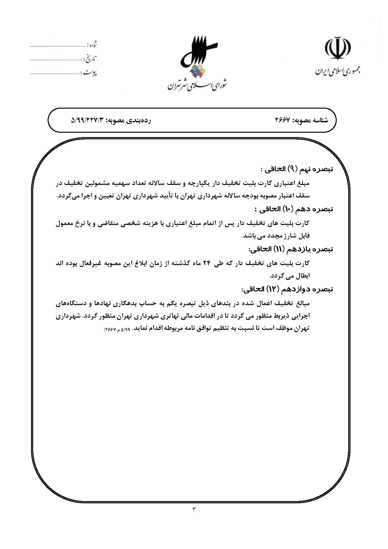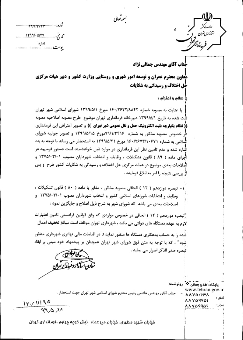 اصلاحيه مصوبه نظام يكپارچه بليت الكترونيك حمل و نقل عمومي شهر تهران ابلاغي به شماره 160/1866/28935 مورخ 1392/12/28 و اصلاحات بعدي
