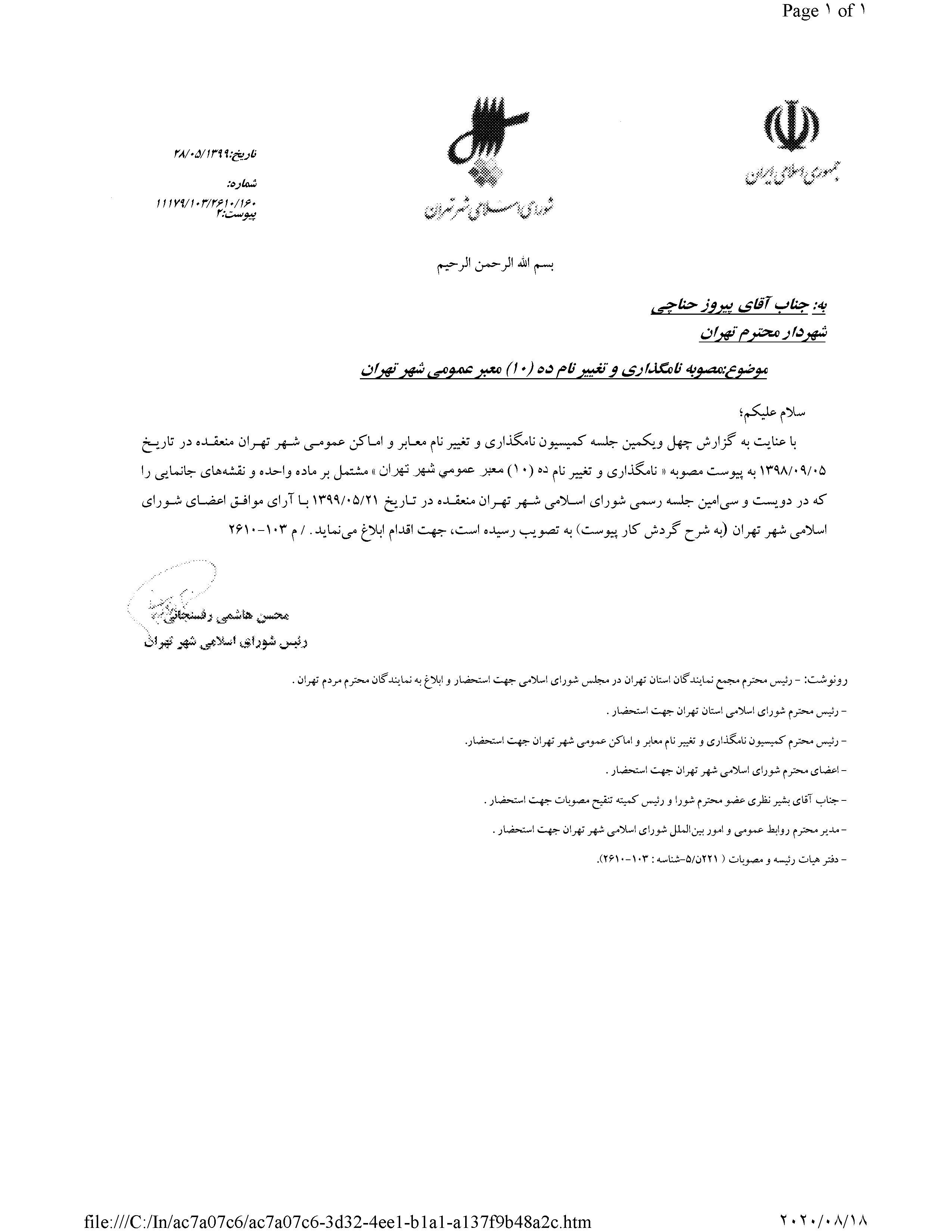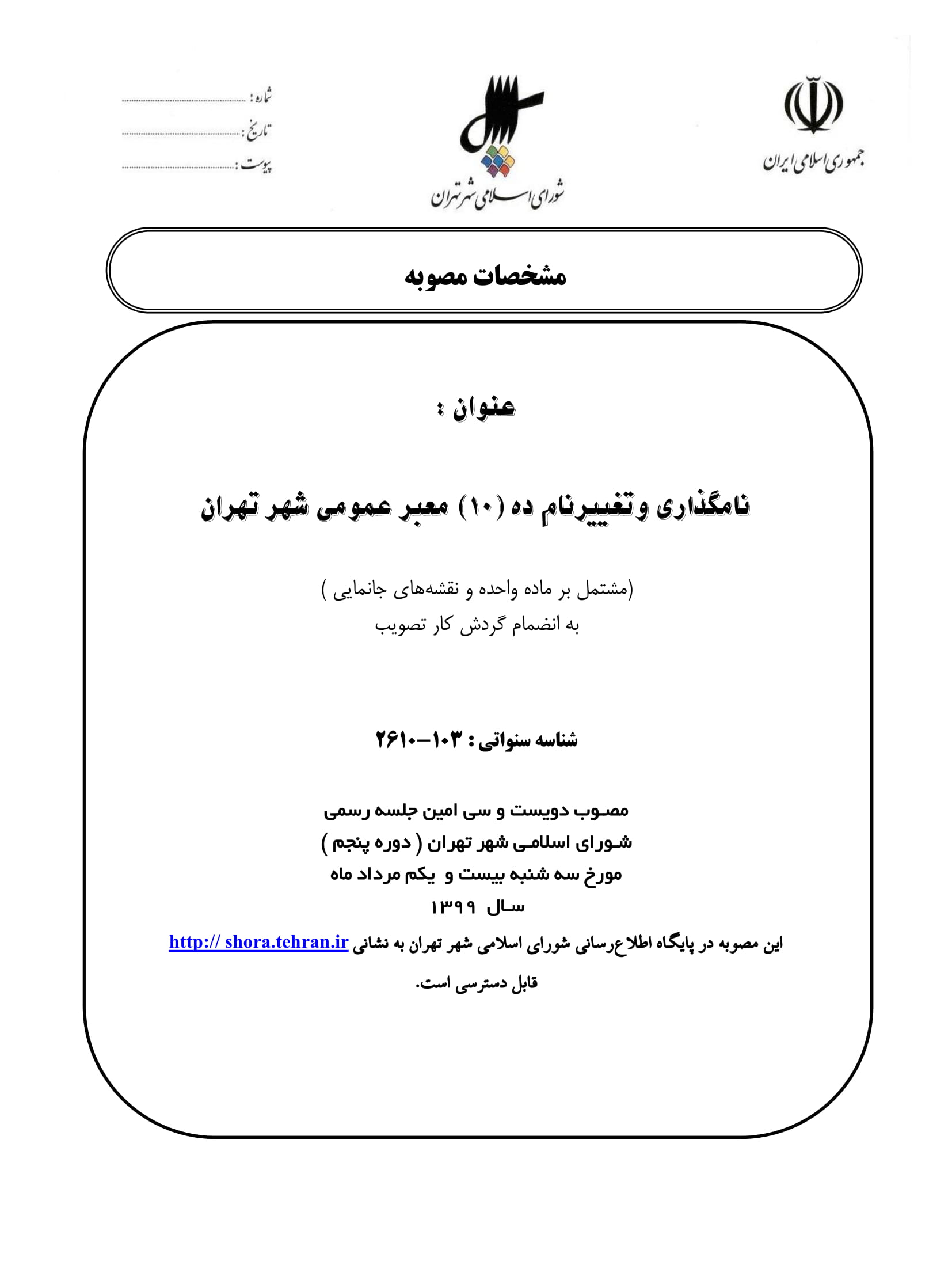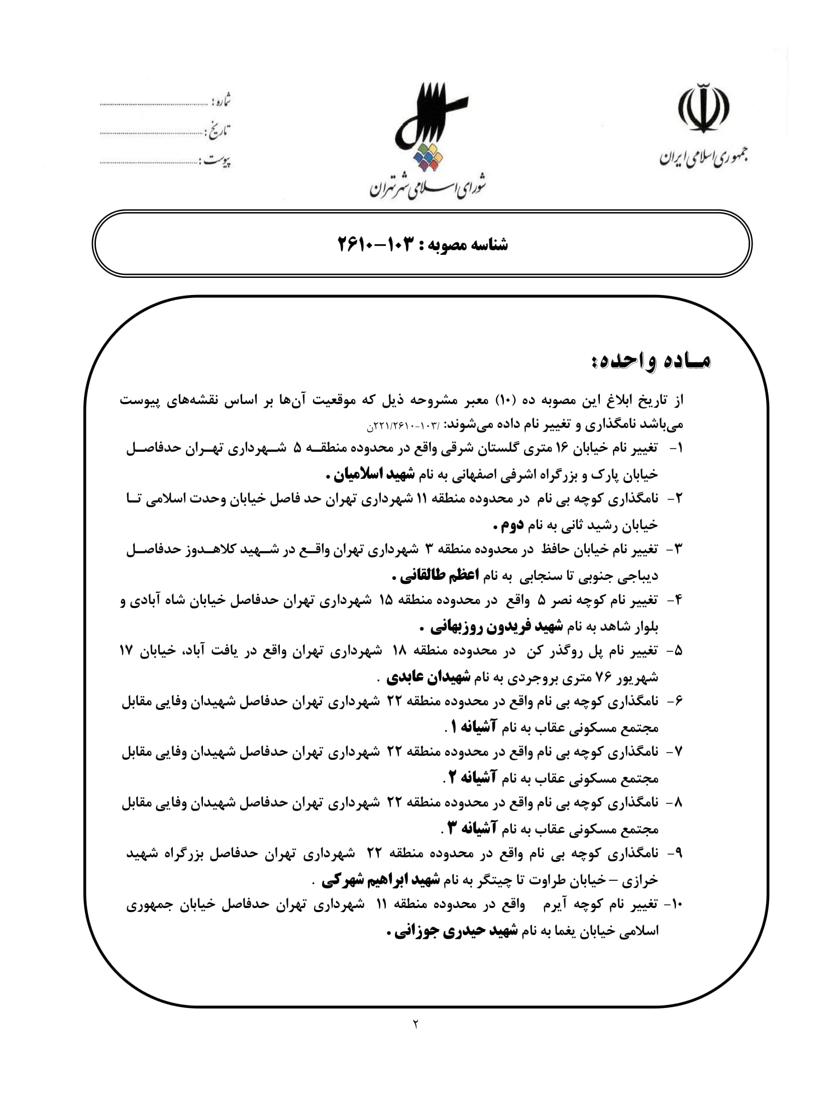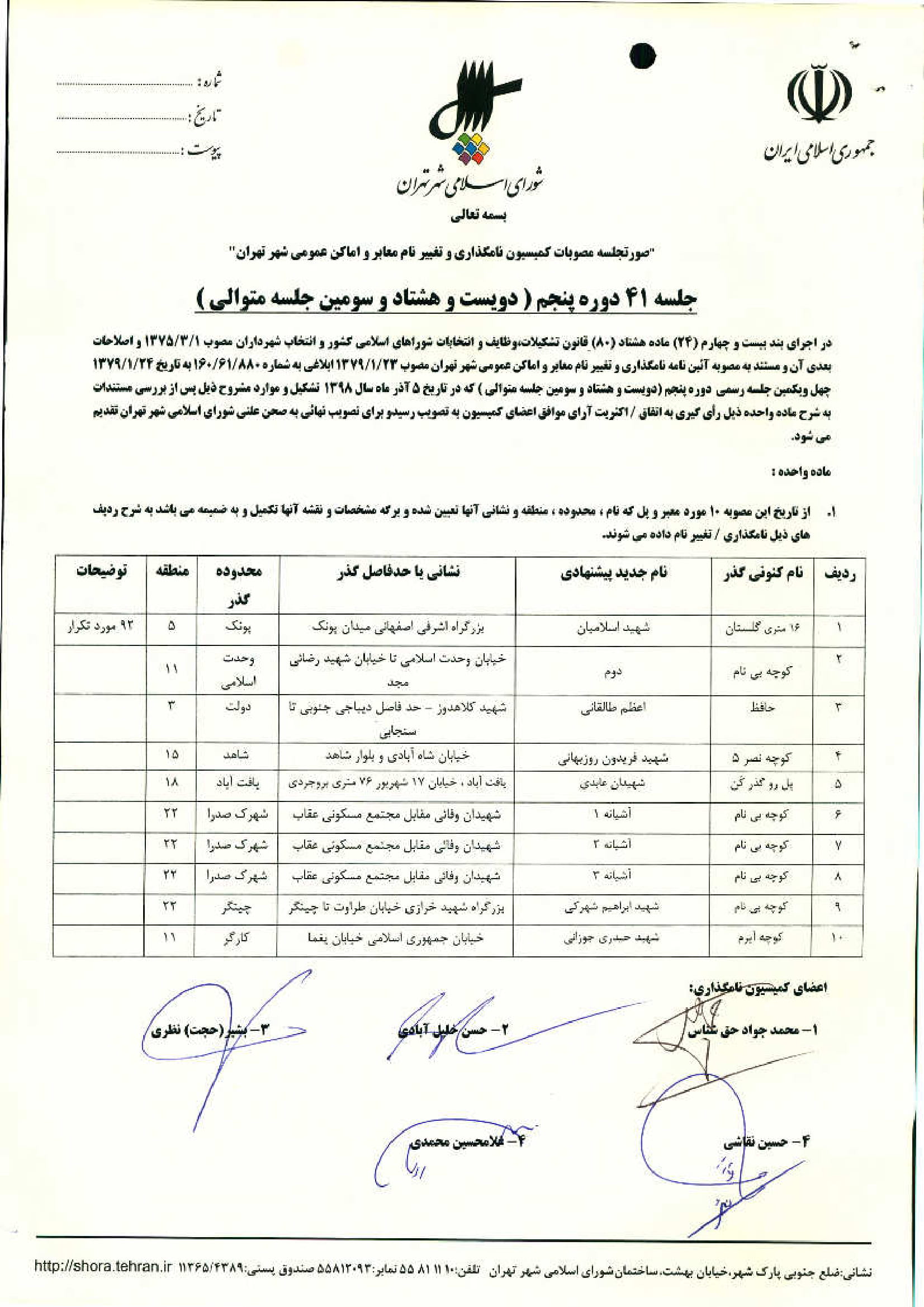 نامگذاري و تغيير نام ده (10) معبر عمومي شهر تهران