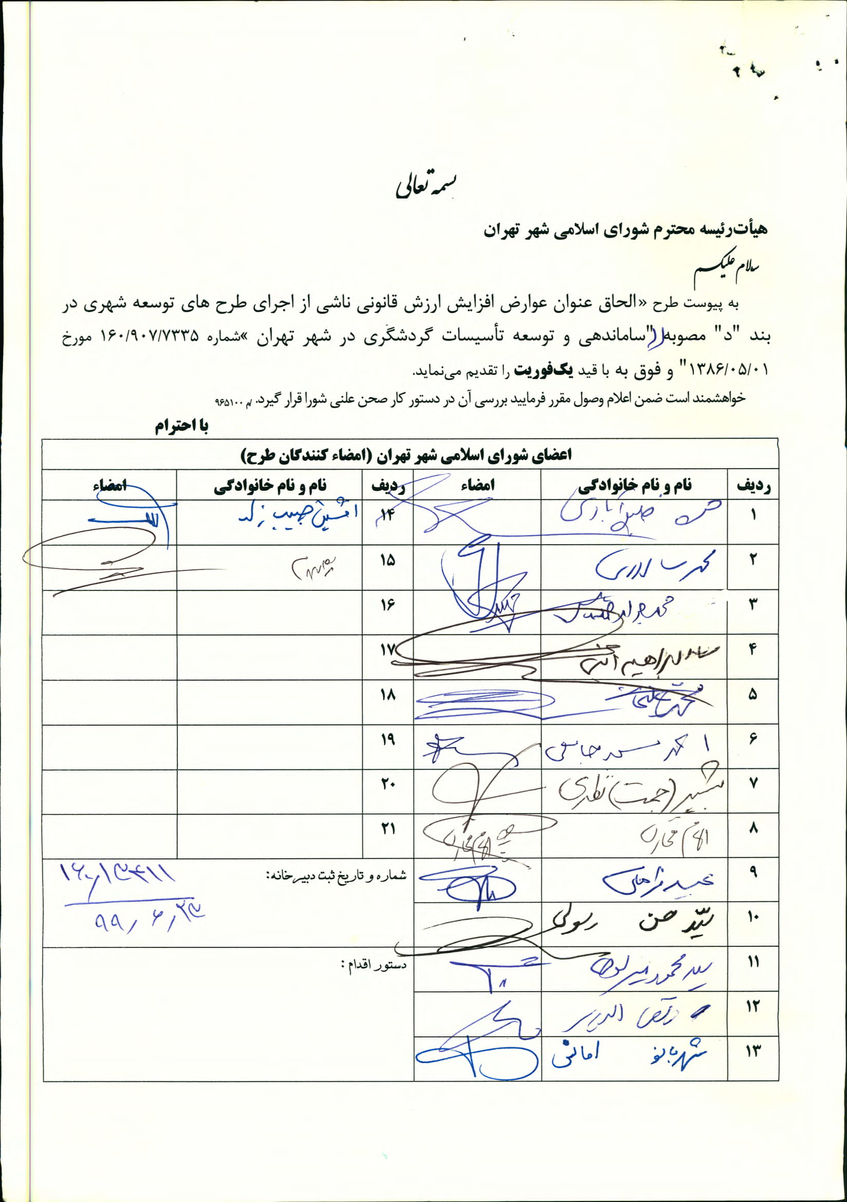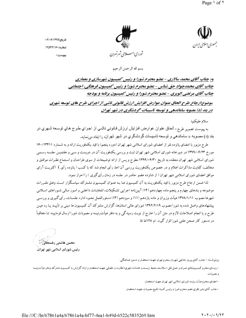 الحاق عنوان عوارض افزايش ارزش قانوني ناشي از اجراي طرحهاي توسعه شهري در بند "د" مصوبه «ساماندهي و توسعه تأسيسات گردشگري در شهر تهران» ابلاغي به شماره 160/907/7335 مورخ 1386/5/1