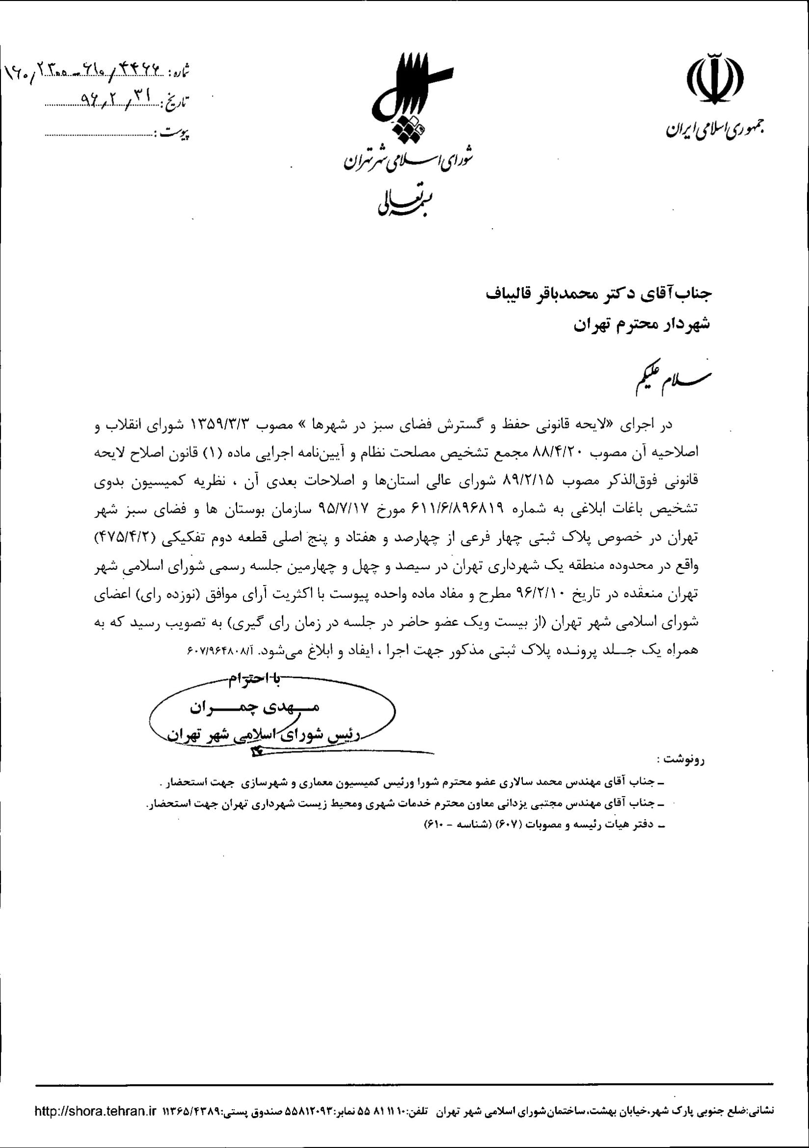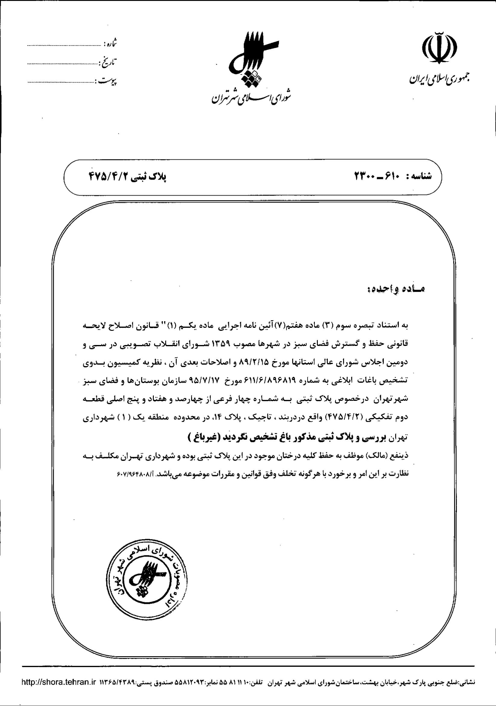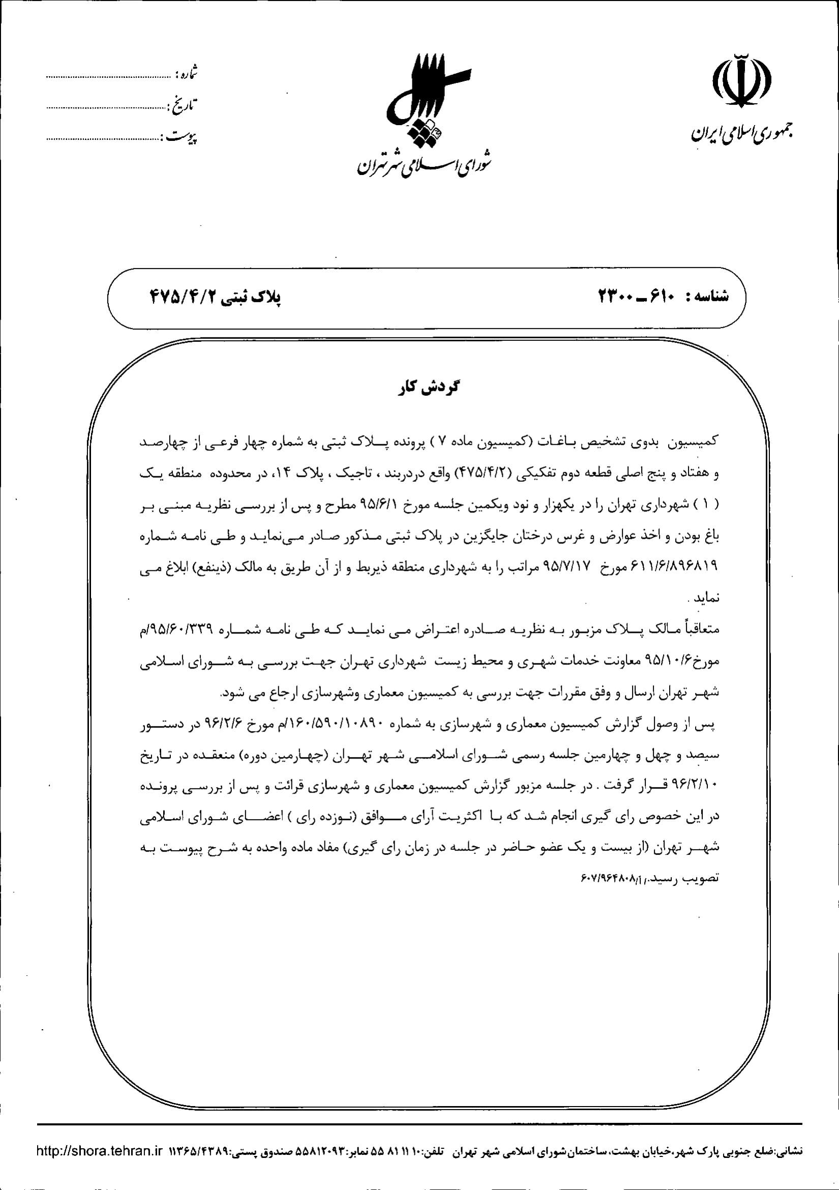 مصوبه شوراي اسلامي شهر تهران در خصوص پلاك ثبتي به شماره چهار فرعي از چهارصد و هفتاد و پنج اصلي قطعه دوم تفكيكي (475/4/2) واقع در محدوده منطقه يك (1) شهرداري تهران