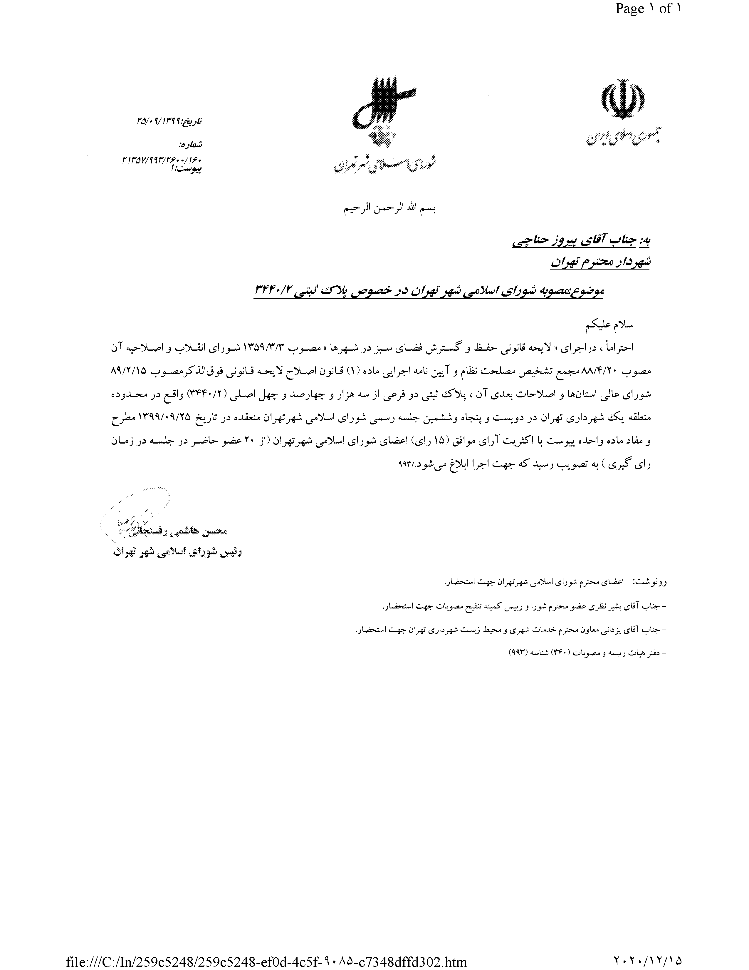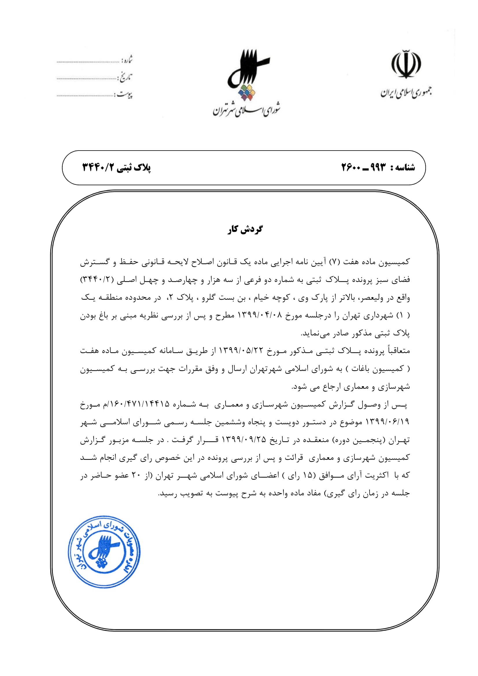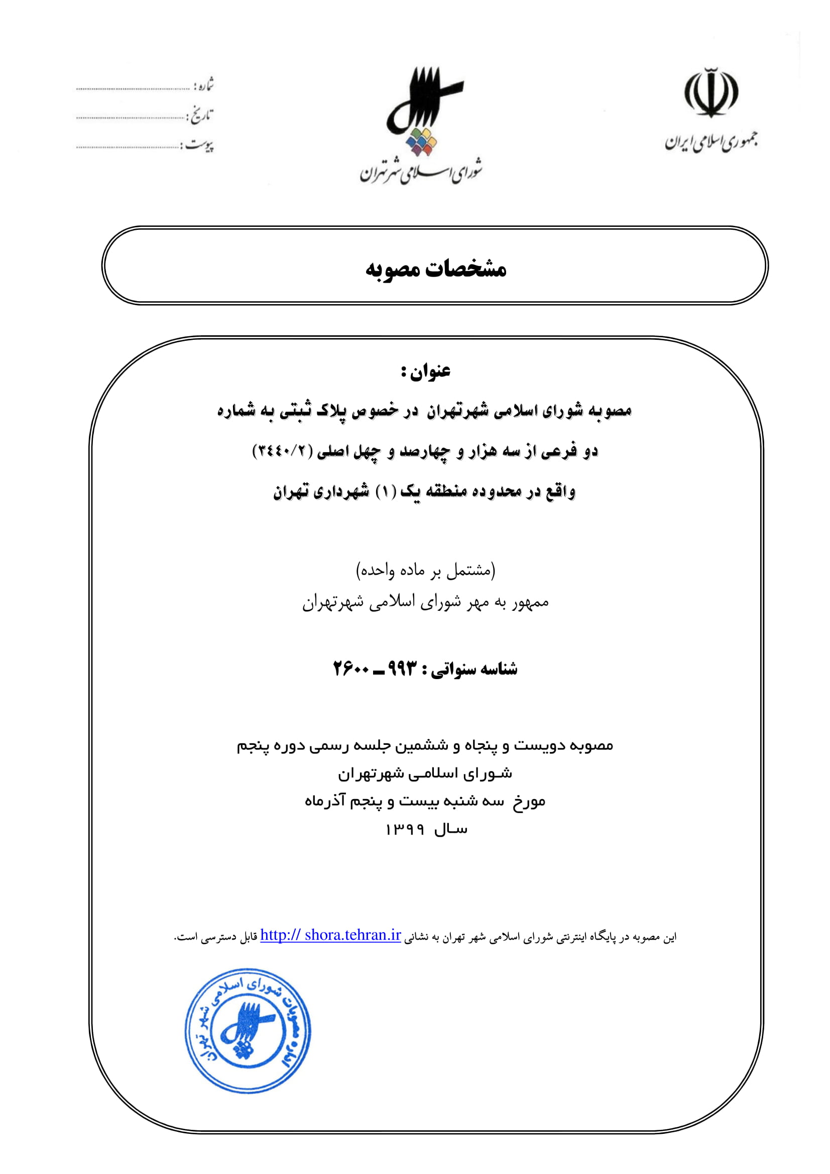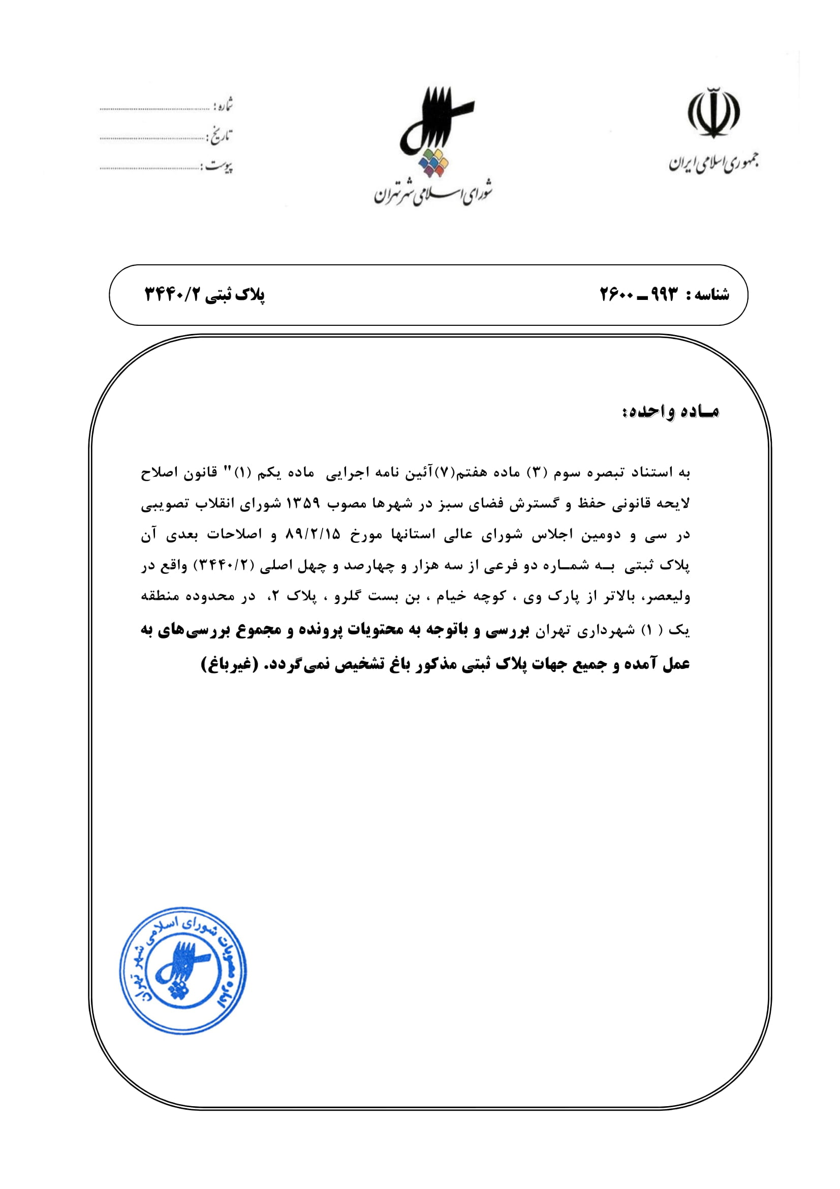 مصوبه شوراي اسلامي شهر تهران در خصوص پلاك ثبتي به شماره دو فرعي از سه هزار و چهارصد و چهل اصلي (3440/2) واقع در محدوده منطقه يك (1) شهرداري تهران