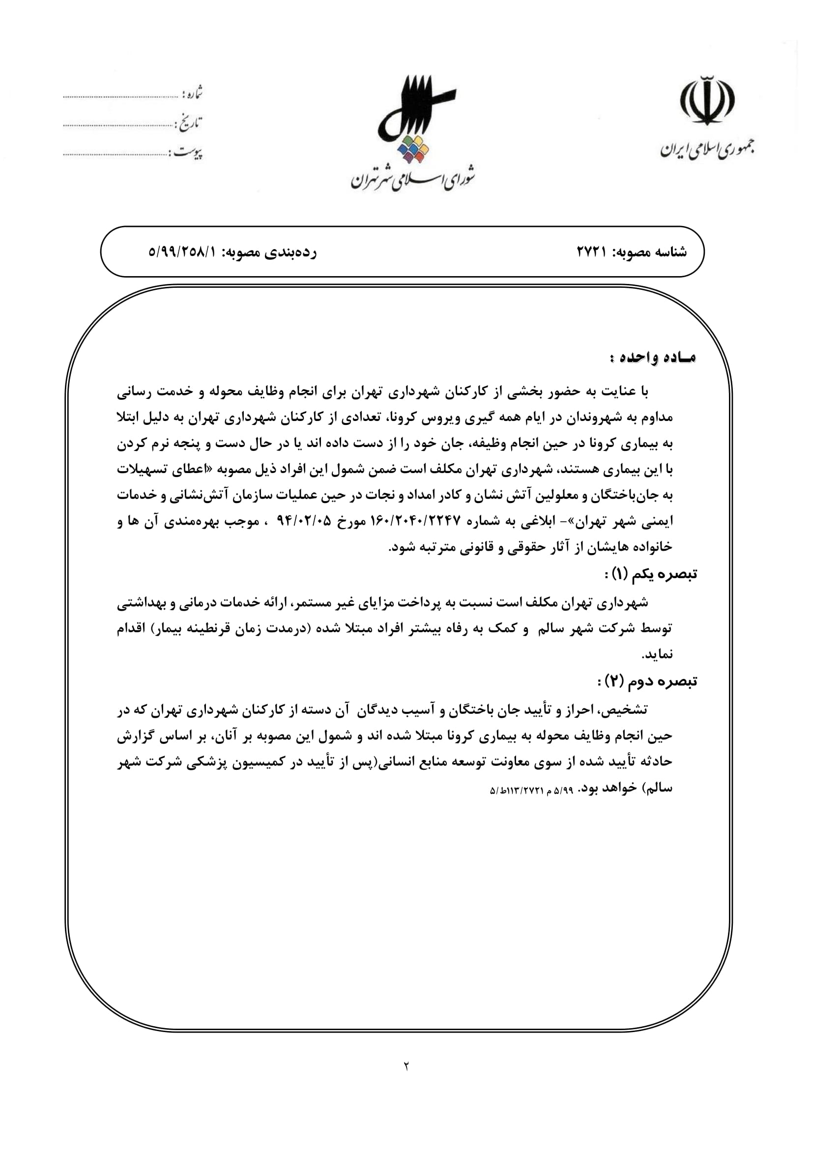 الزام شهرداري تهران به اعطاي تسهيلات به كاركنان شهرداري تهران كه در حين انجام وظايف محوله به دليل ابتلا به ويروس كرونا جان خود را از دست داده يا آسيب ديدهاند