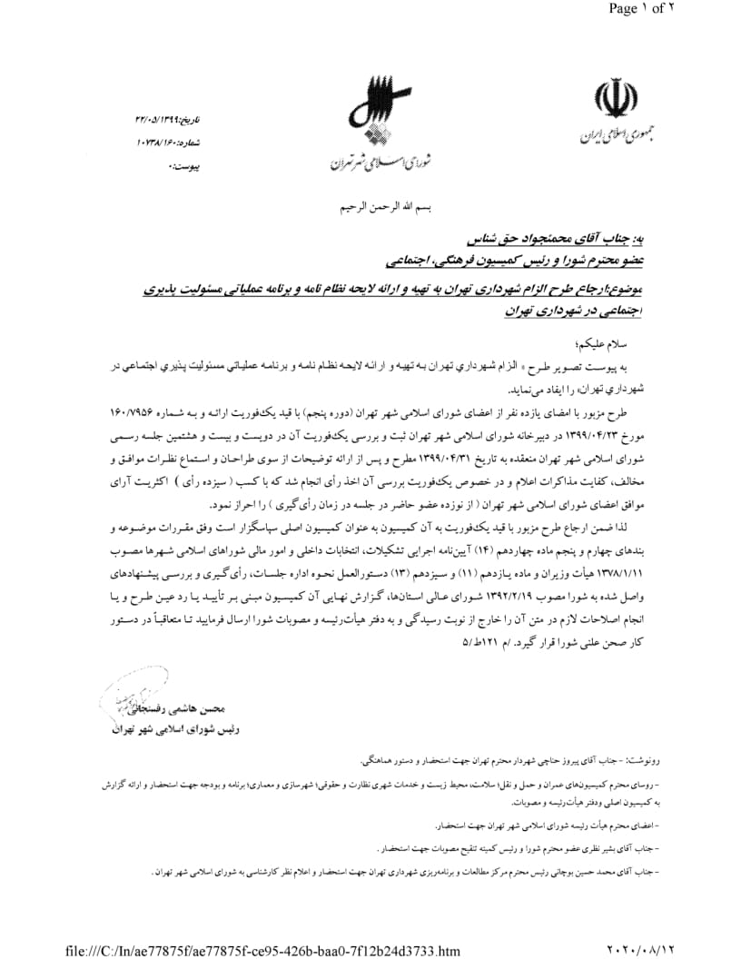 الزام شهرداري تهران به تهيه و ارائه لايحه نظامنامه و برنامه عملياتي مسئوليت پذيري اجتماعي در شهرداري تهران