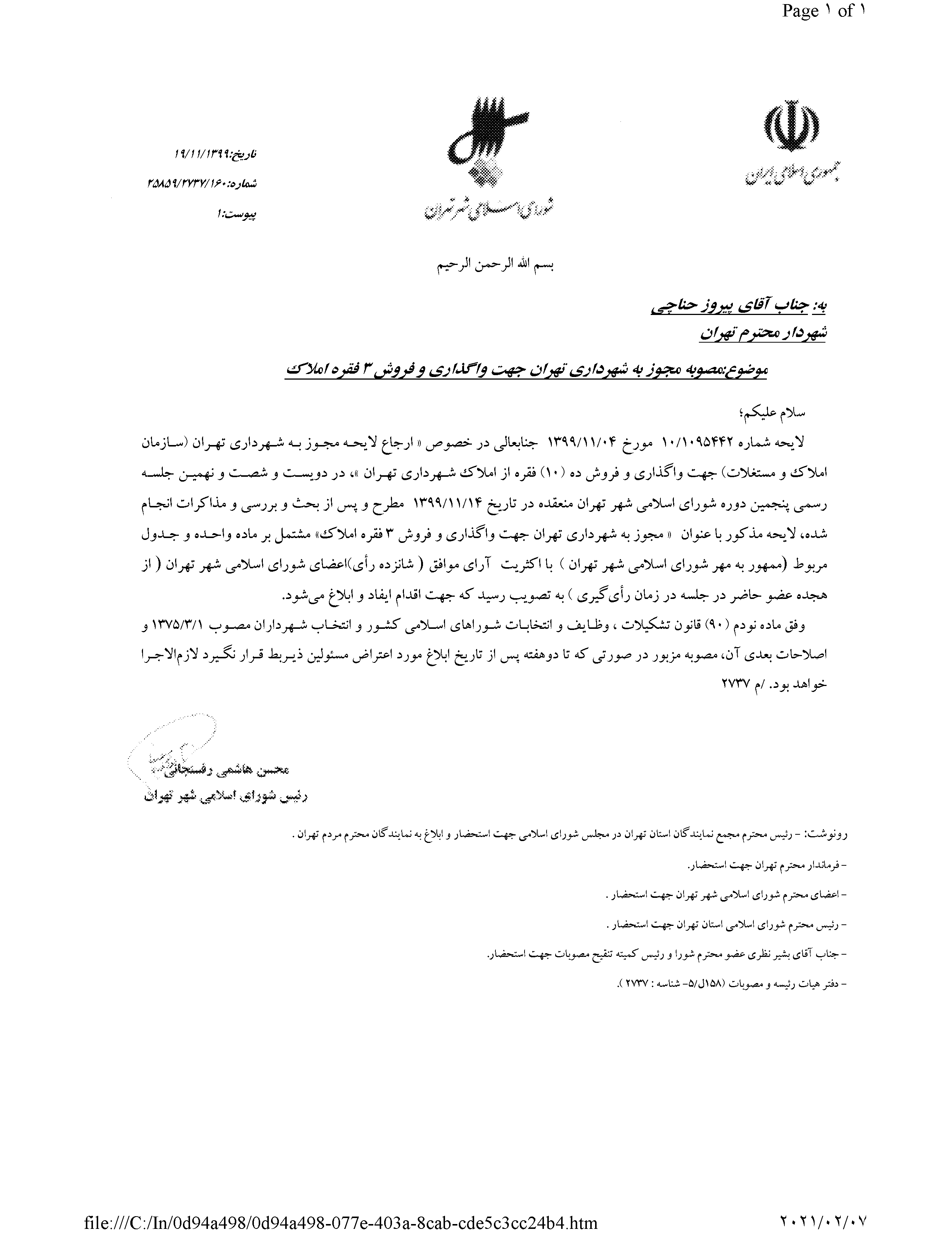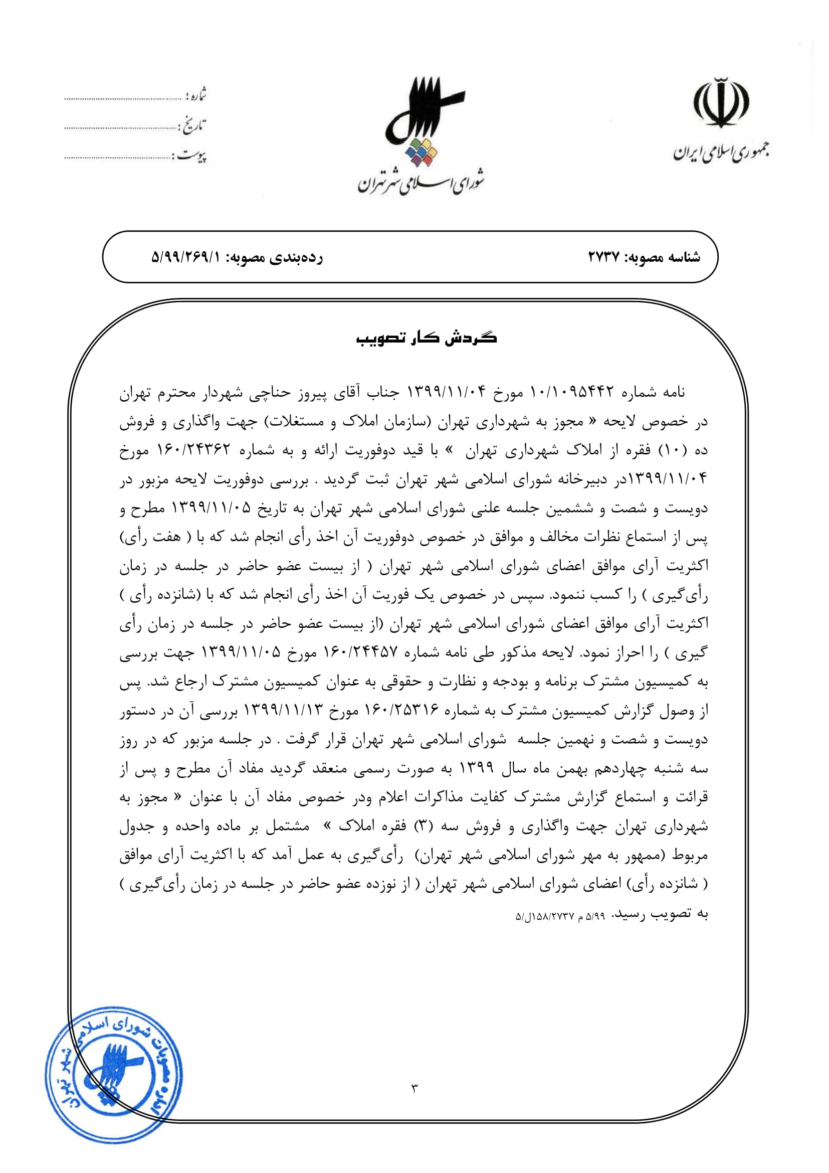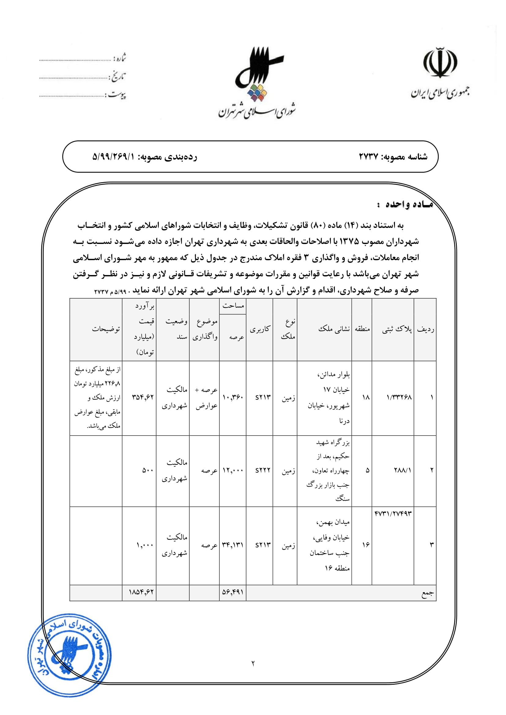 مجوز به شهرداري تهران جهت واگذاري و فروش 3 فقره املاك