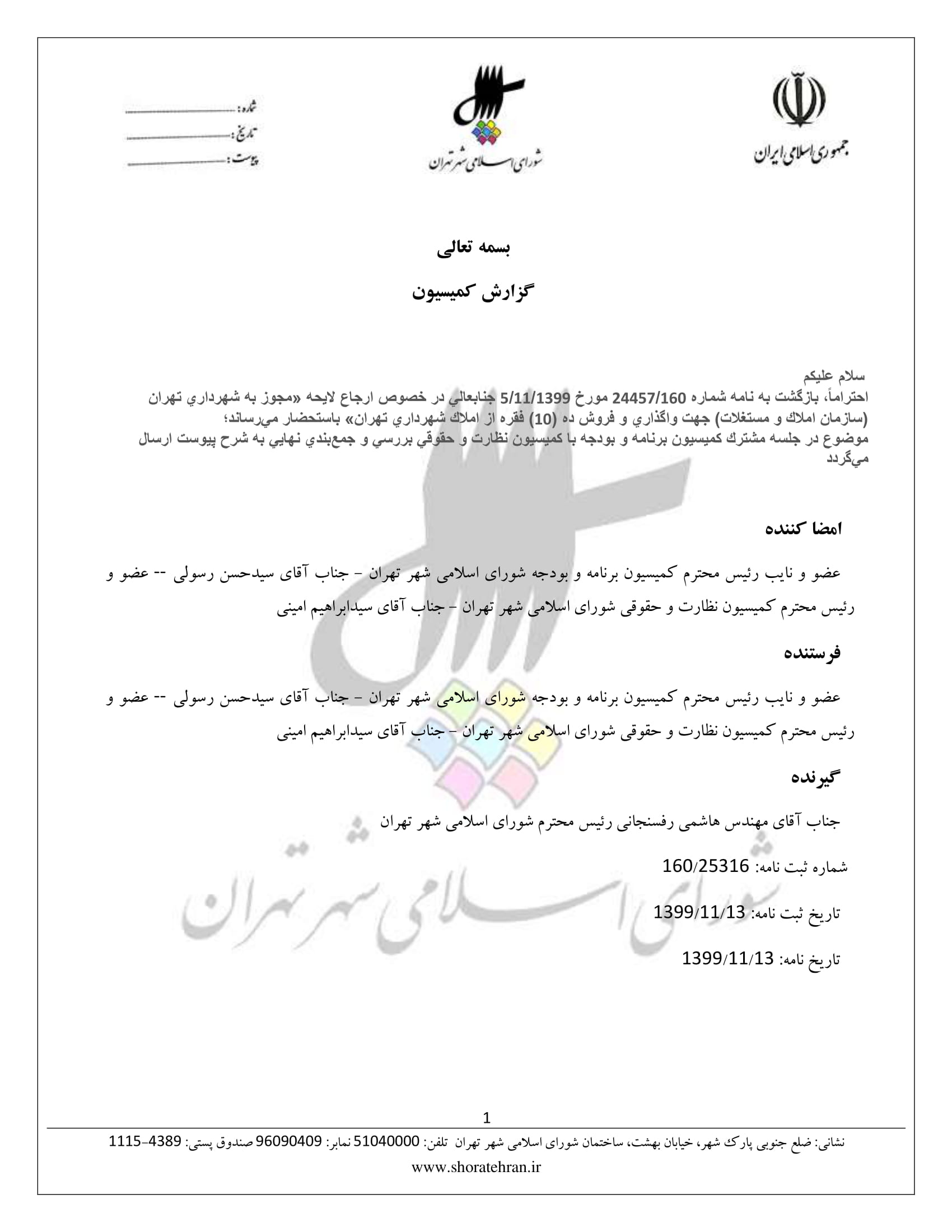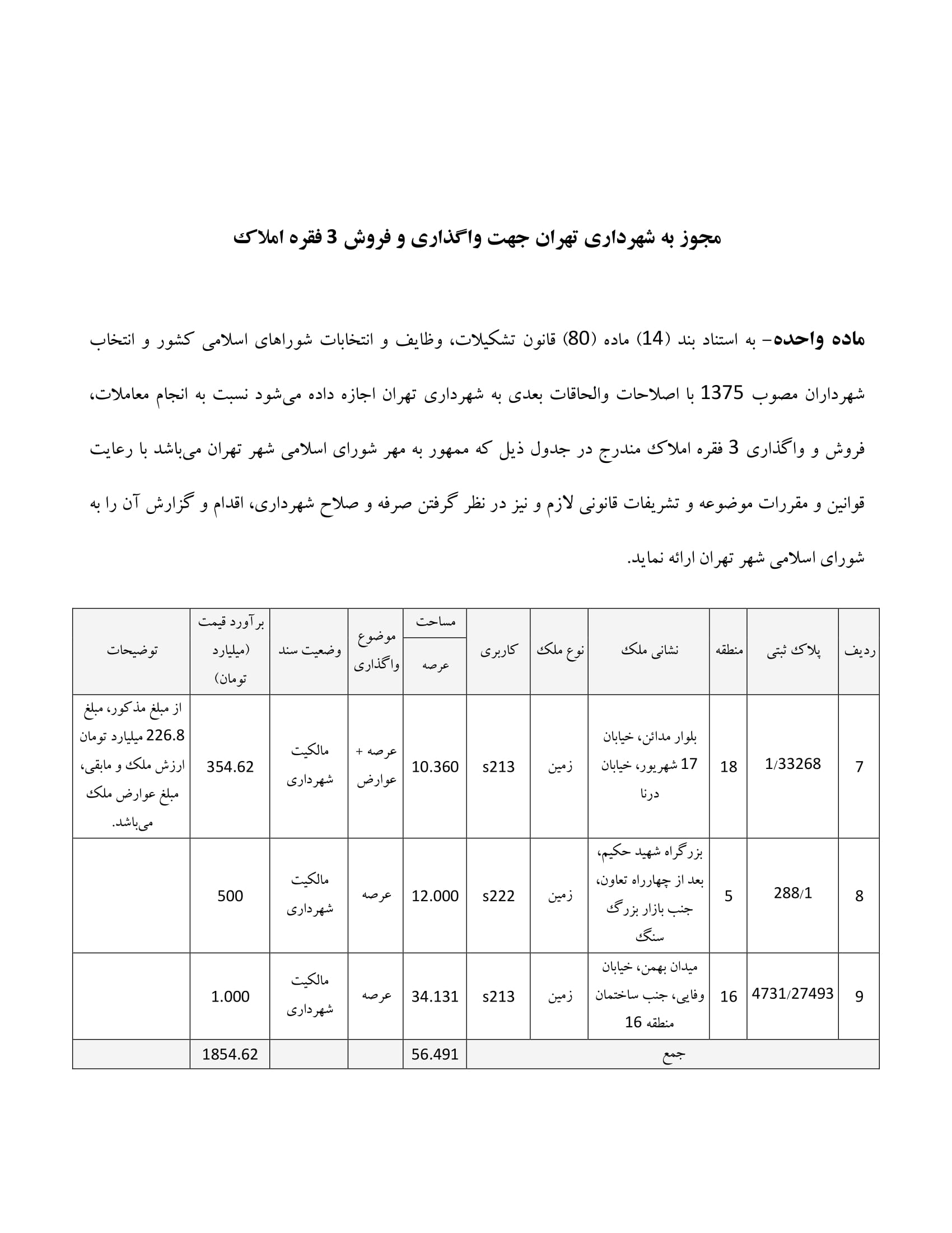 مجوز به شهرداري تهران جهت واگذاري و فروش 3 فقره املاك