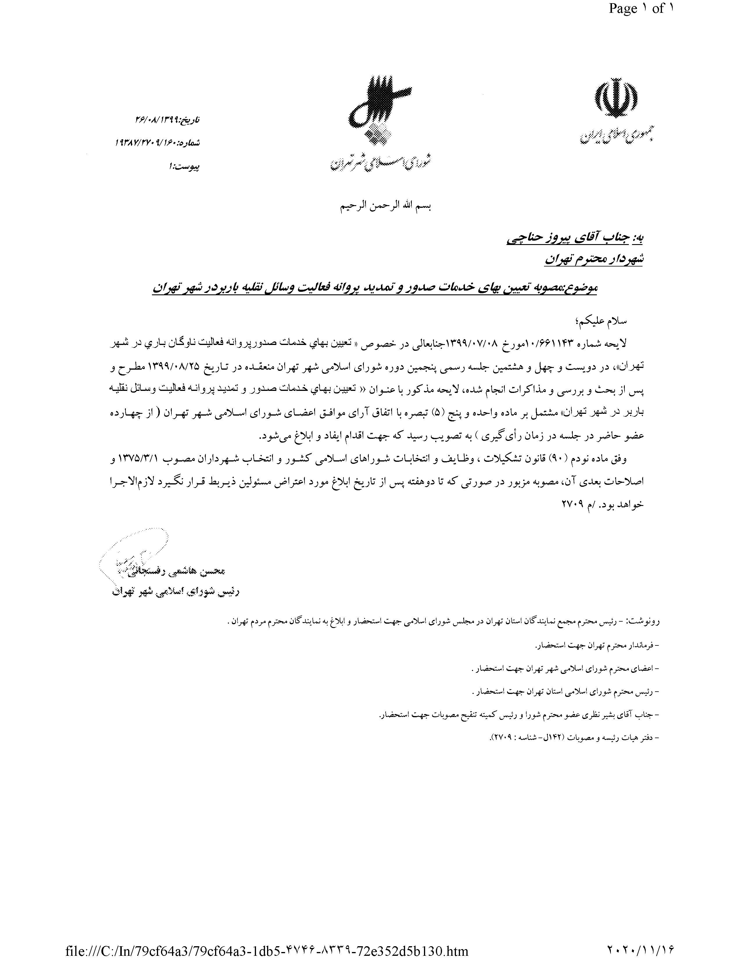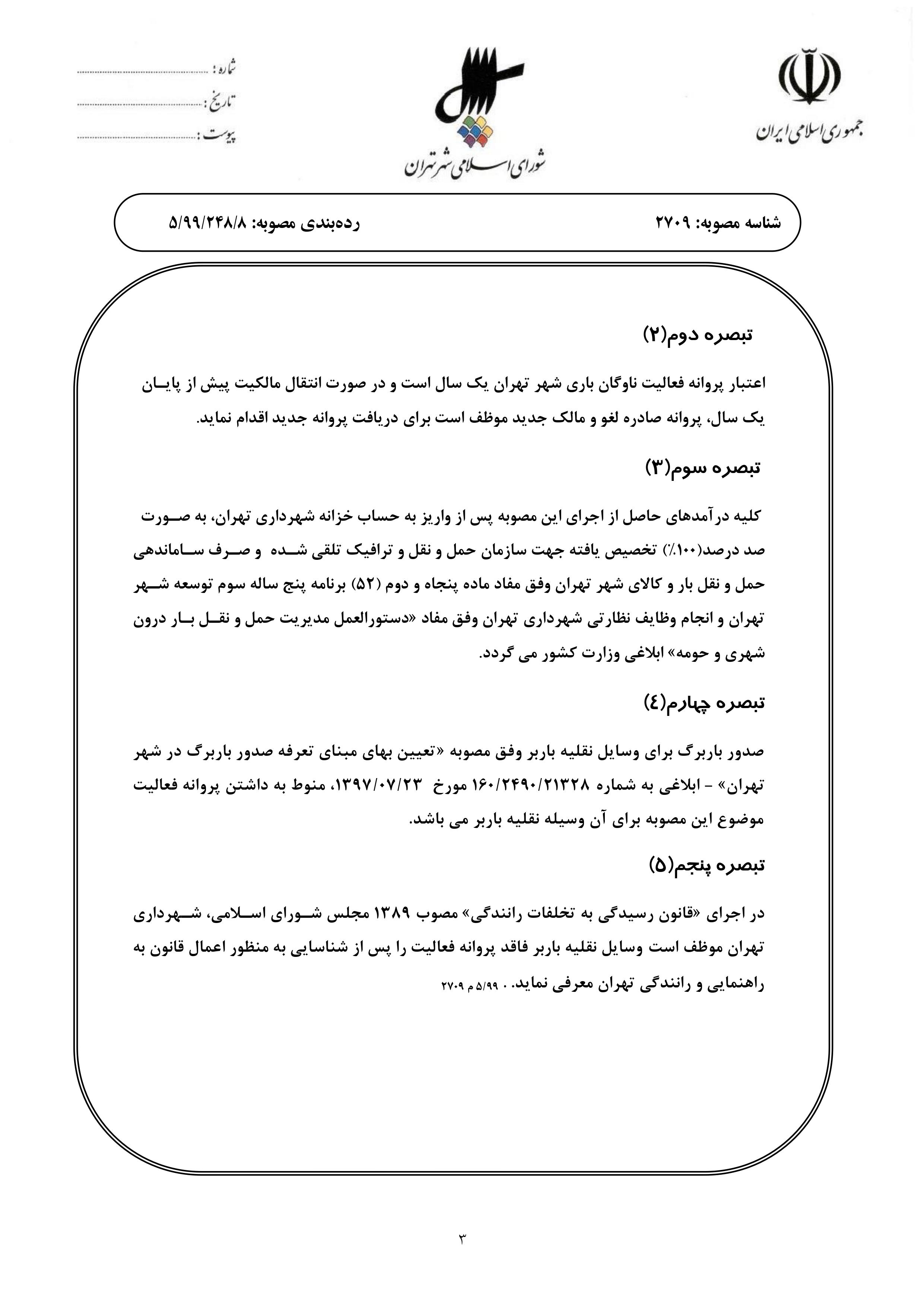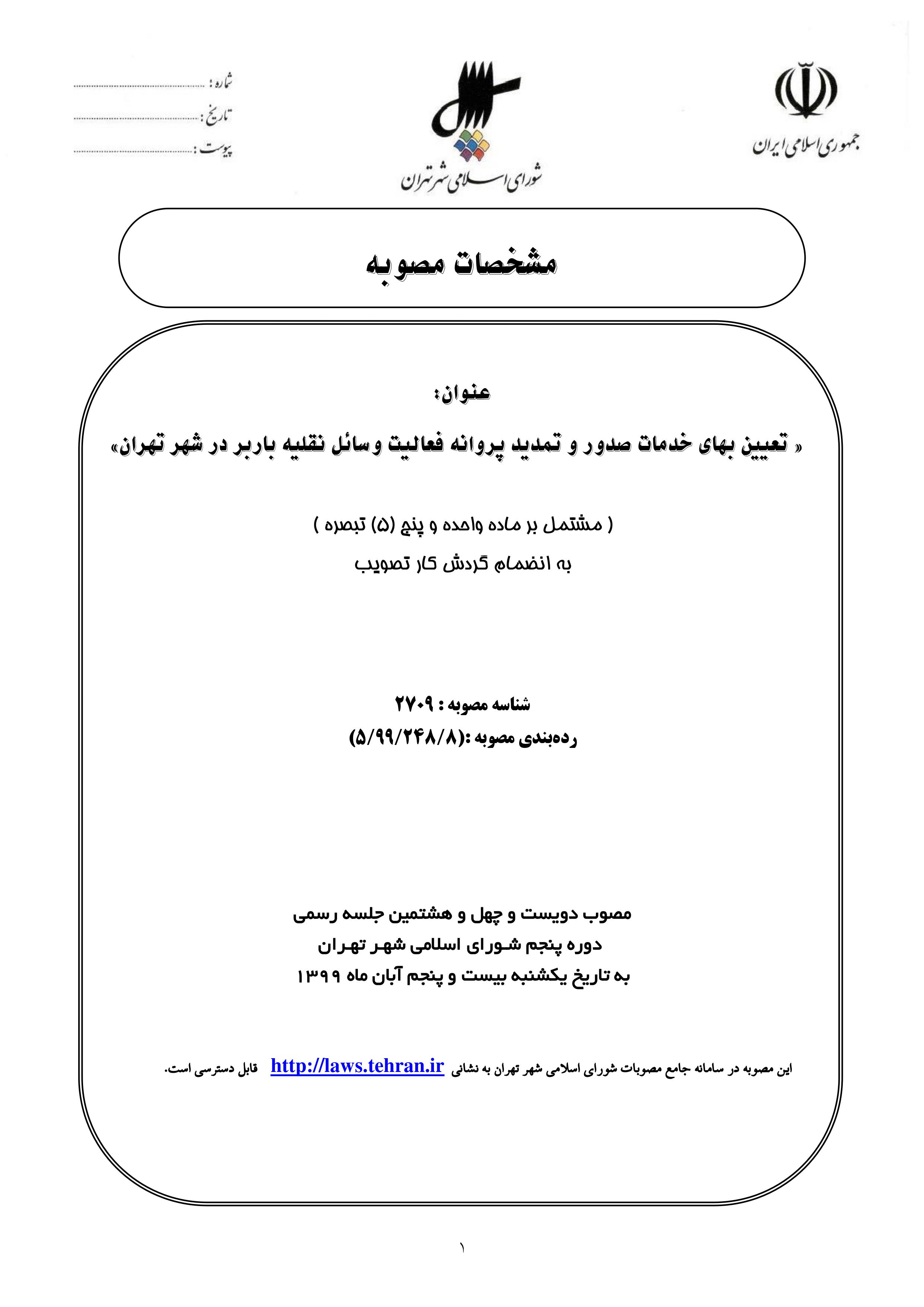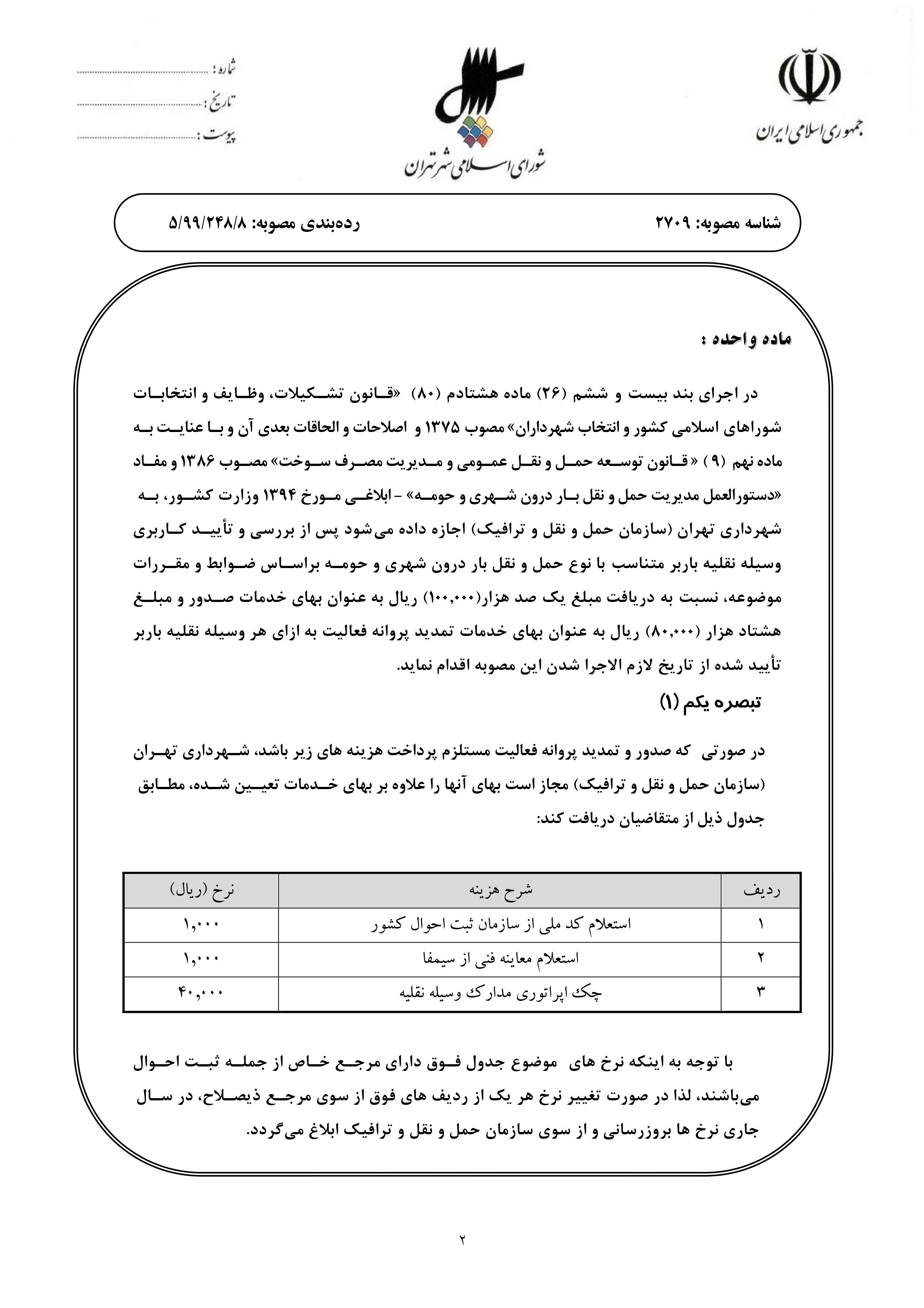 تعيين بهاي خدمات صدور و تمديد پروانه فعاليت وسائل نقليه باربر در شهر تهران