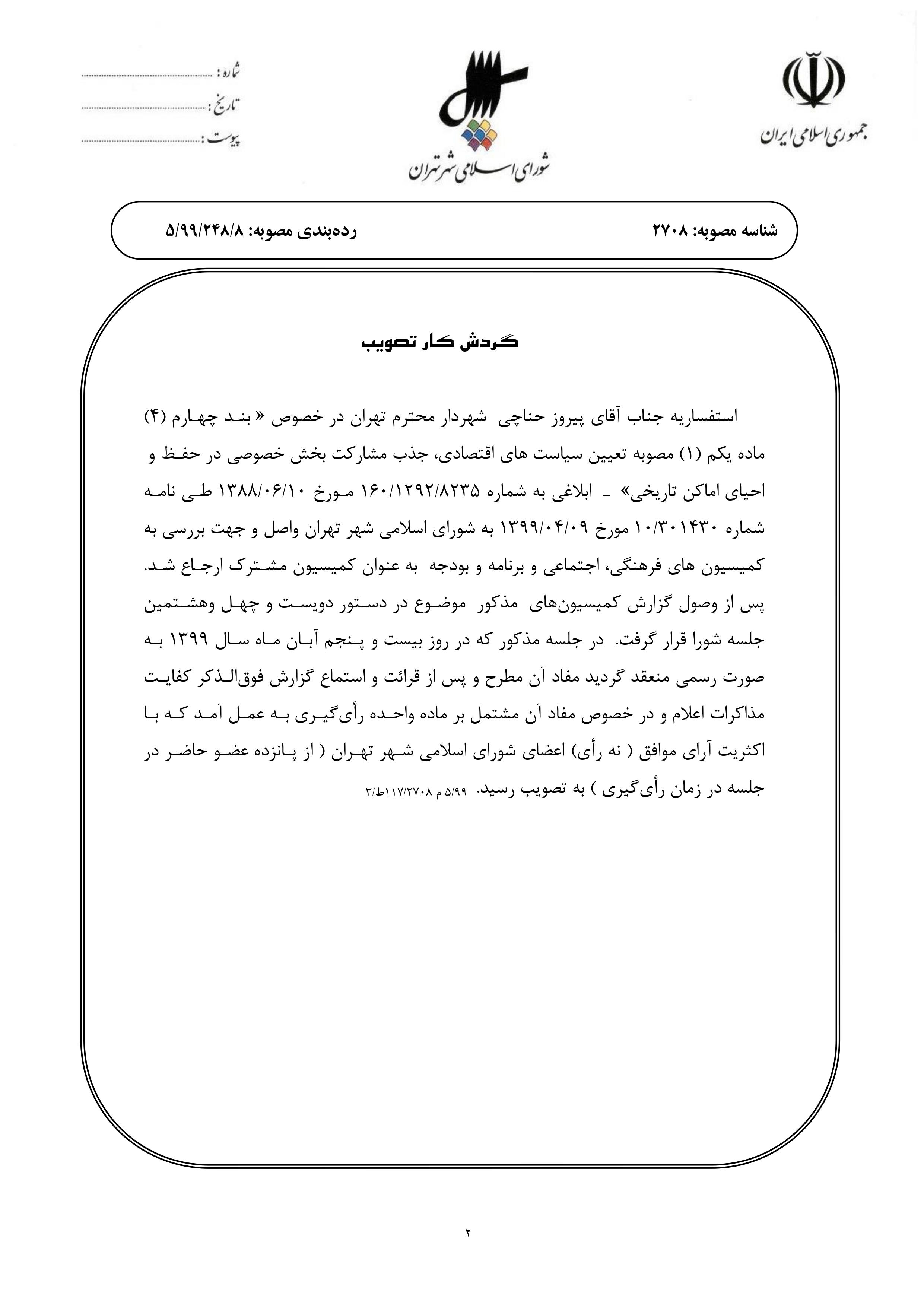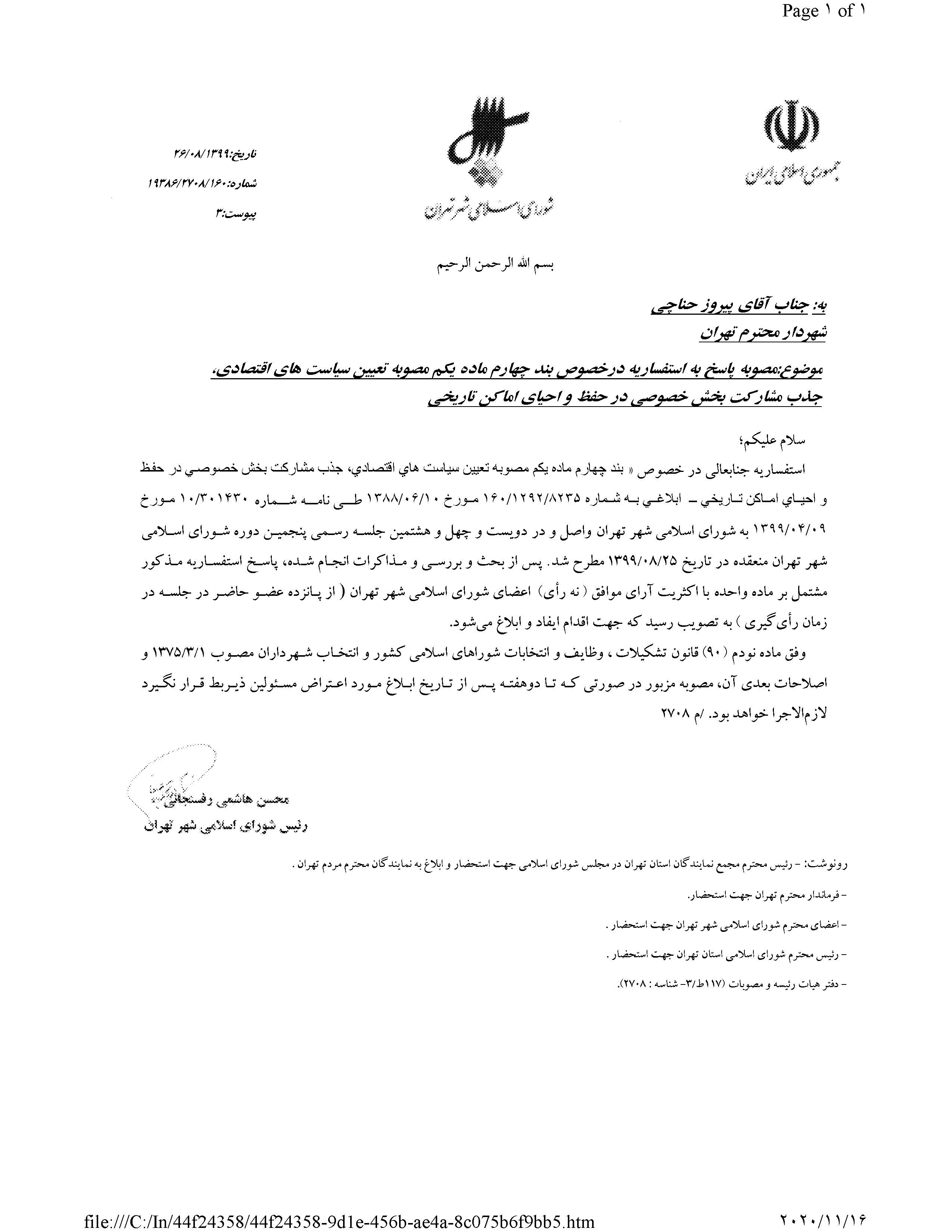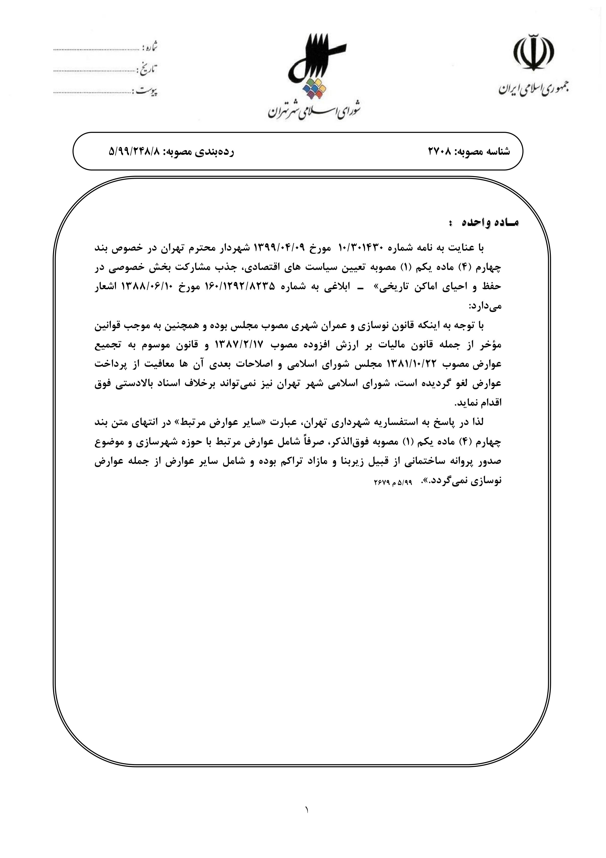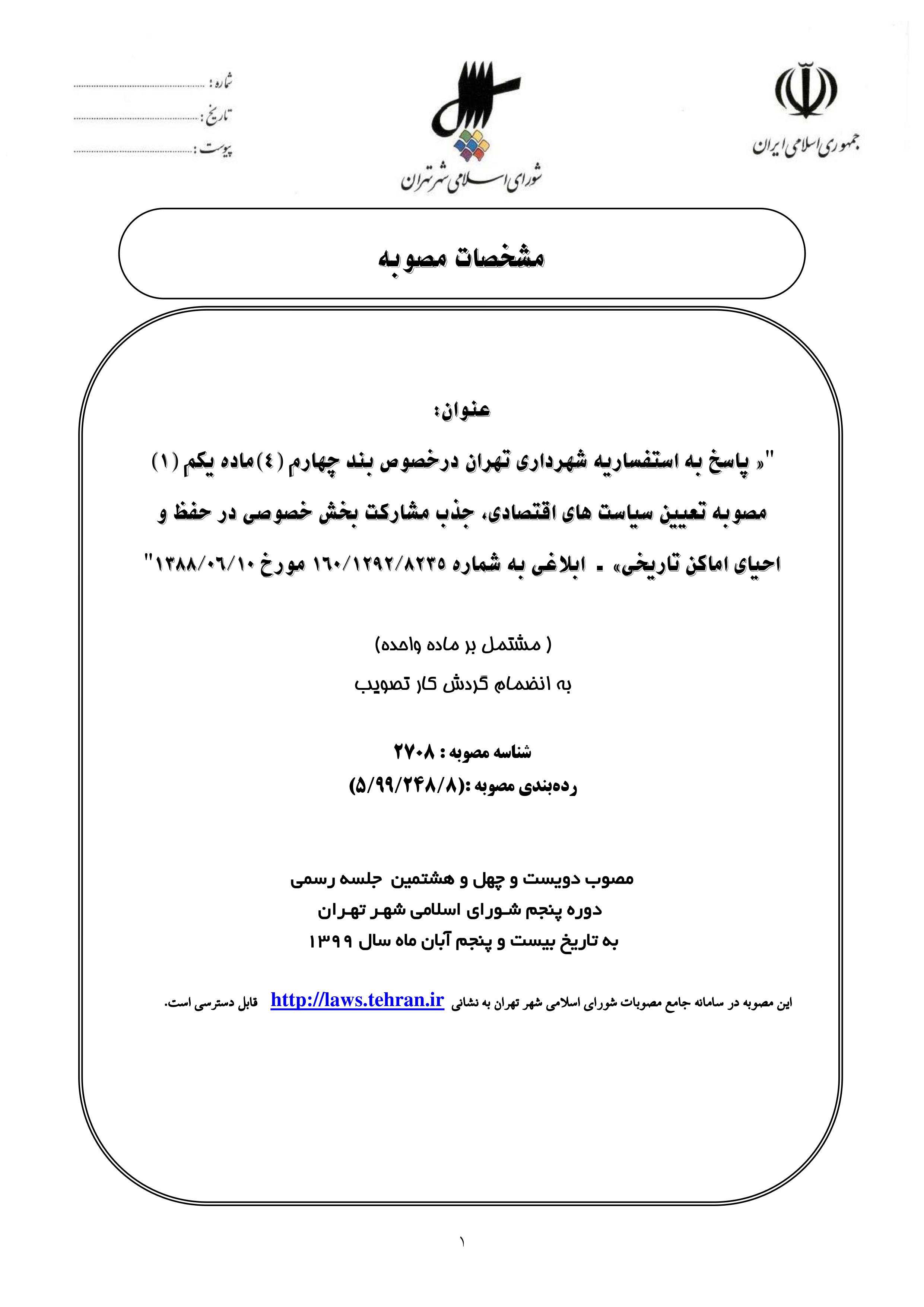 پاسخ به استفساريه شهرداري تهران در خصوص بند چهارم (4) ماده يكم (1) مصوبه تعيين سياستهاي اقتصادي، جذب مشاركت بخش خصوصي در حفظ و احياي اماكن تاريخي - ابلاغي به شماره 160/1292/8235 مورخ 1388/06/10