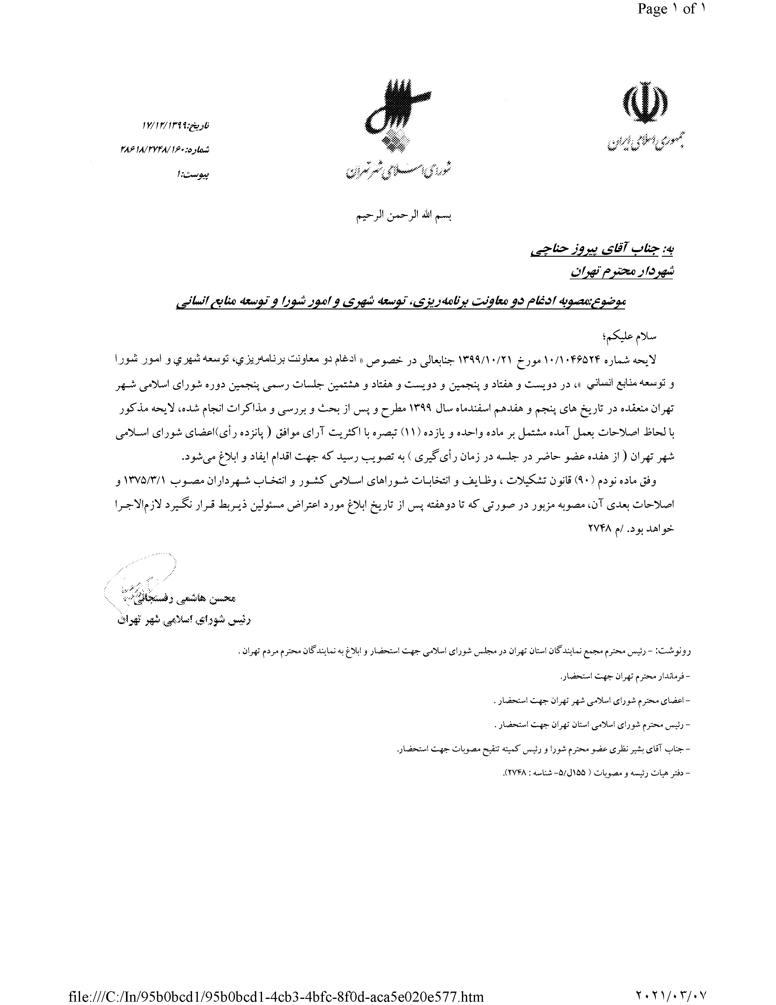 ادغام دو معاونت "برنامه ريزي، توسعه شهري و امور شورا" و "توسعه منابع انساني" شهرداري تهران