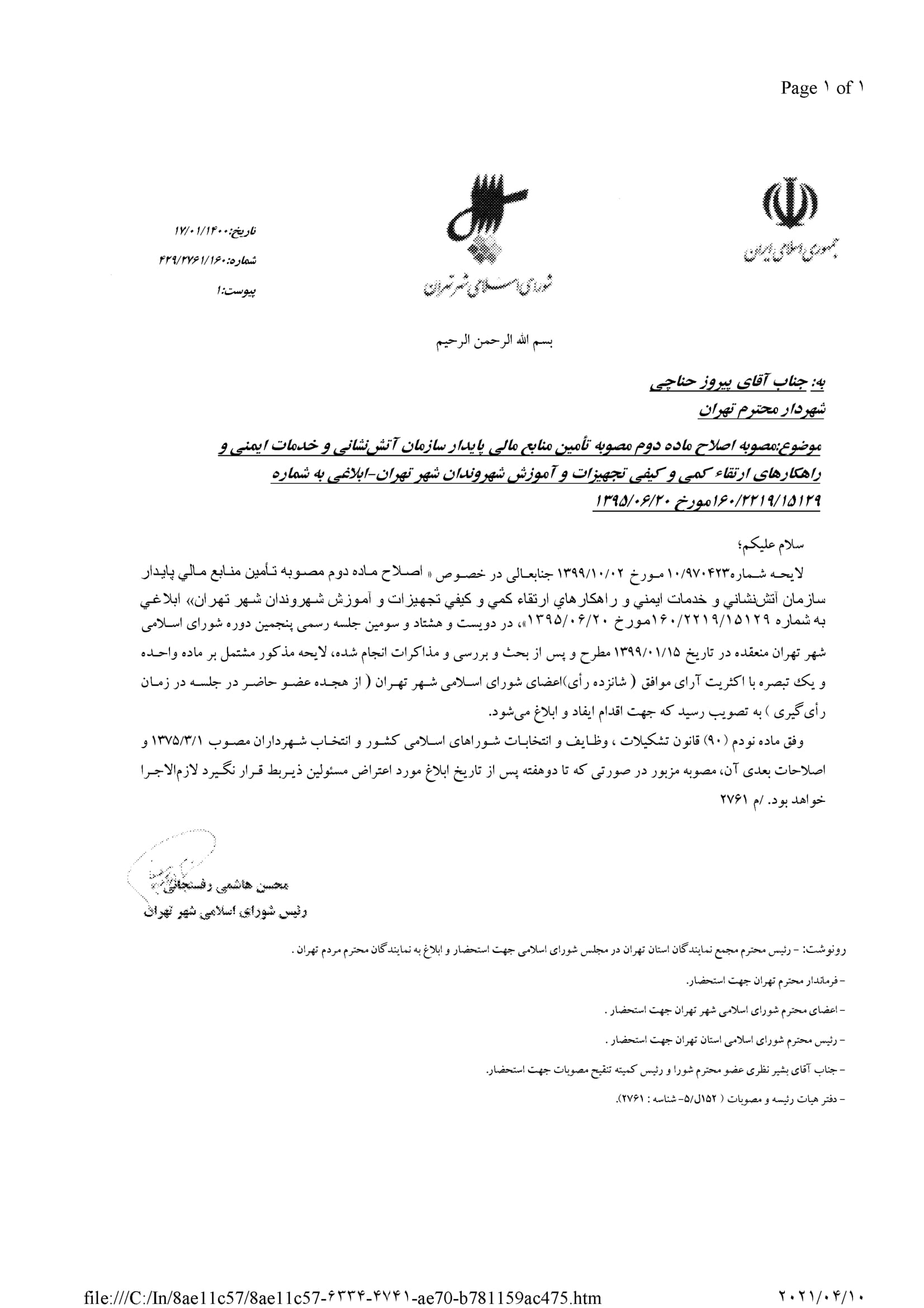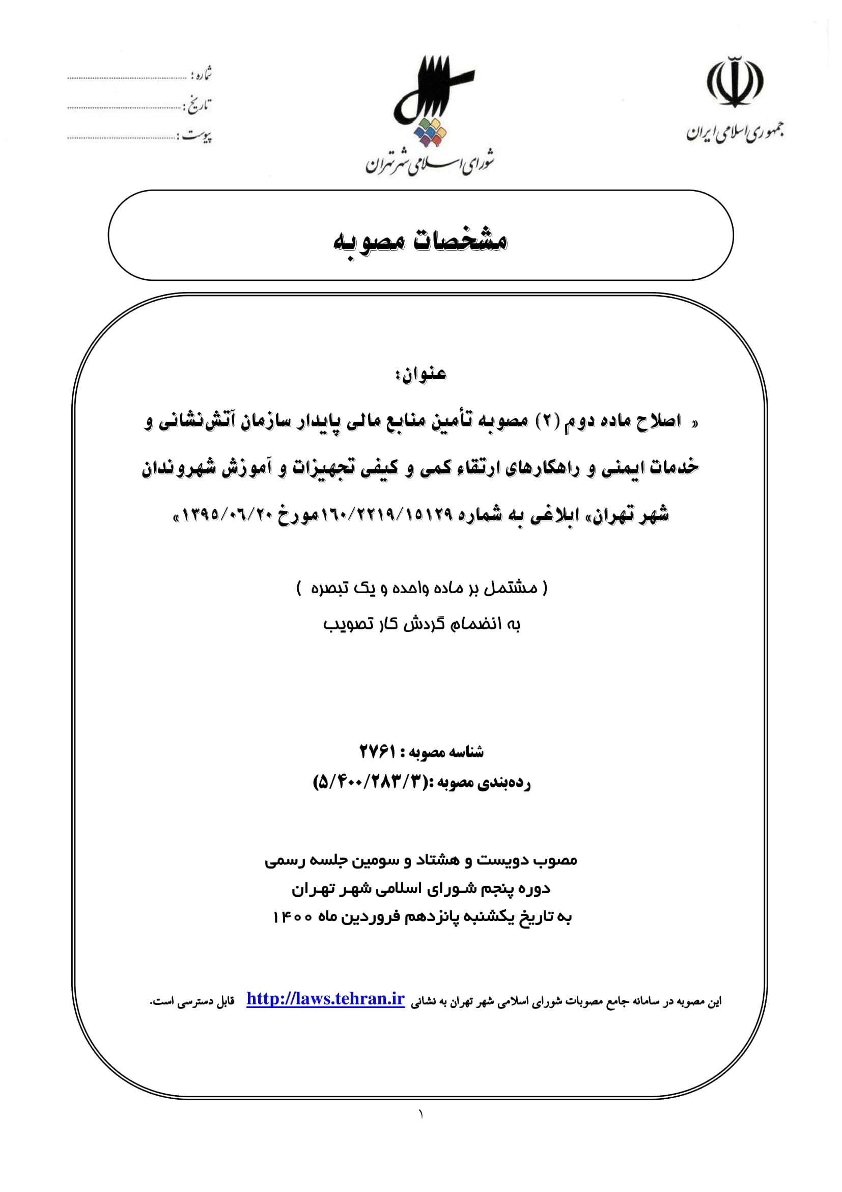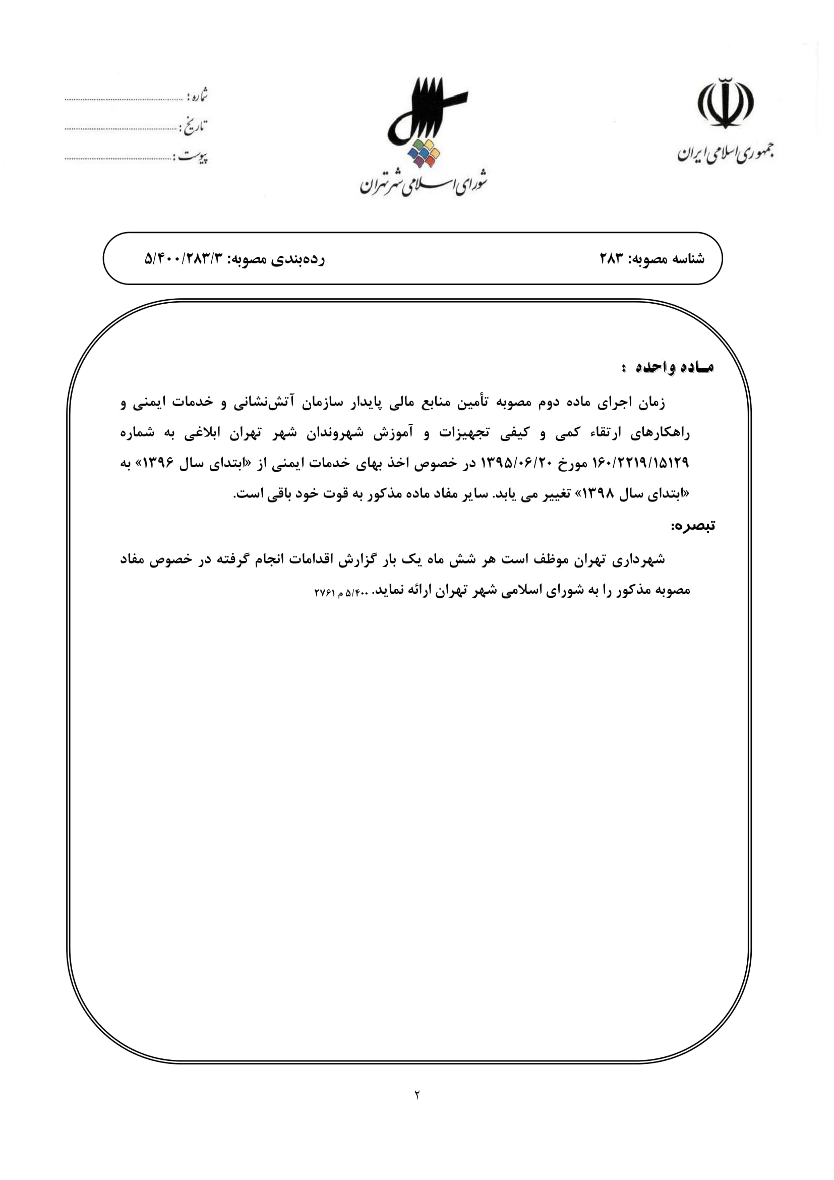 اصلاح ماده دوم (2) مصوبه «تامين منابع مالي پايدار سازمان آتشنشاني و خدمات ايمني و راهكارهاي ارتقاي كمي و كيفي تجهيزات و آموزش شهروندان شهر تهران»- ابلاغي به شماره 160/2219/15129 مورخ 1395/06/20