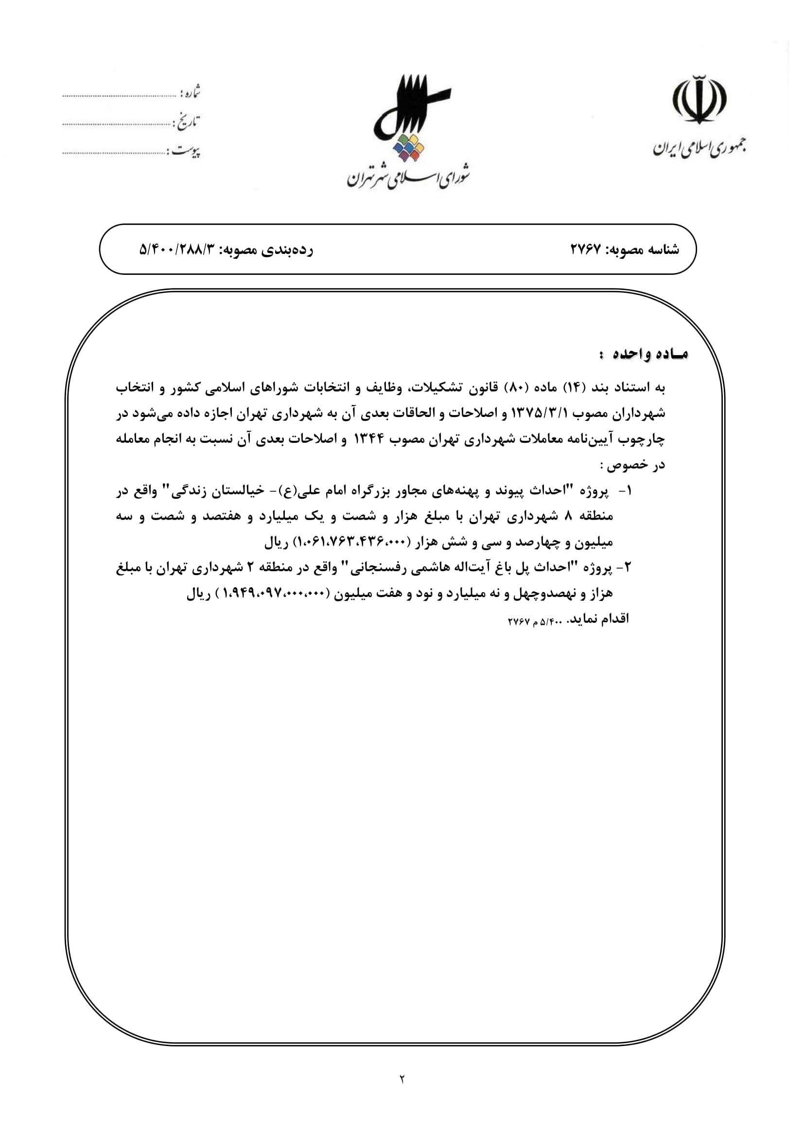 مجوز به شهرداري تهران جهت انجام معاملات احداث پروژههاي "پيوند و پهنههاي مجاور بزرگراه امام علي (ع)- خيالستان زندگي" واقع در منطقه 8 و "پل باغ آيت اله هاشمي رفسنجاني" واقع در منطقه 2