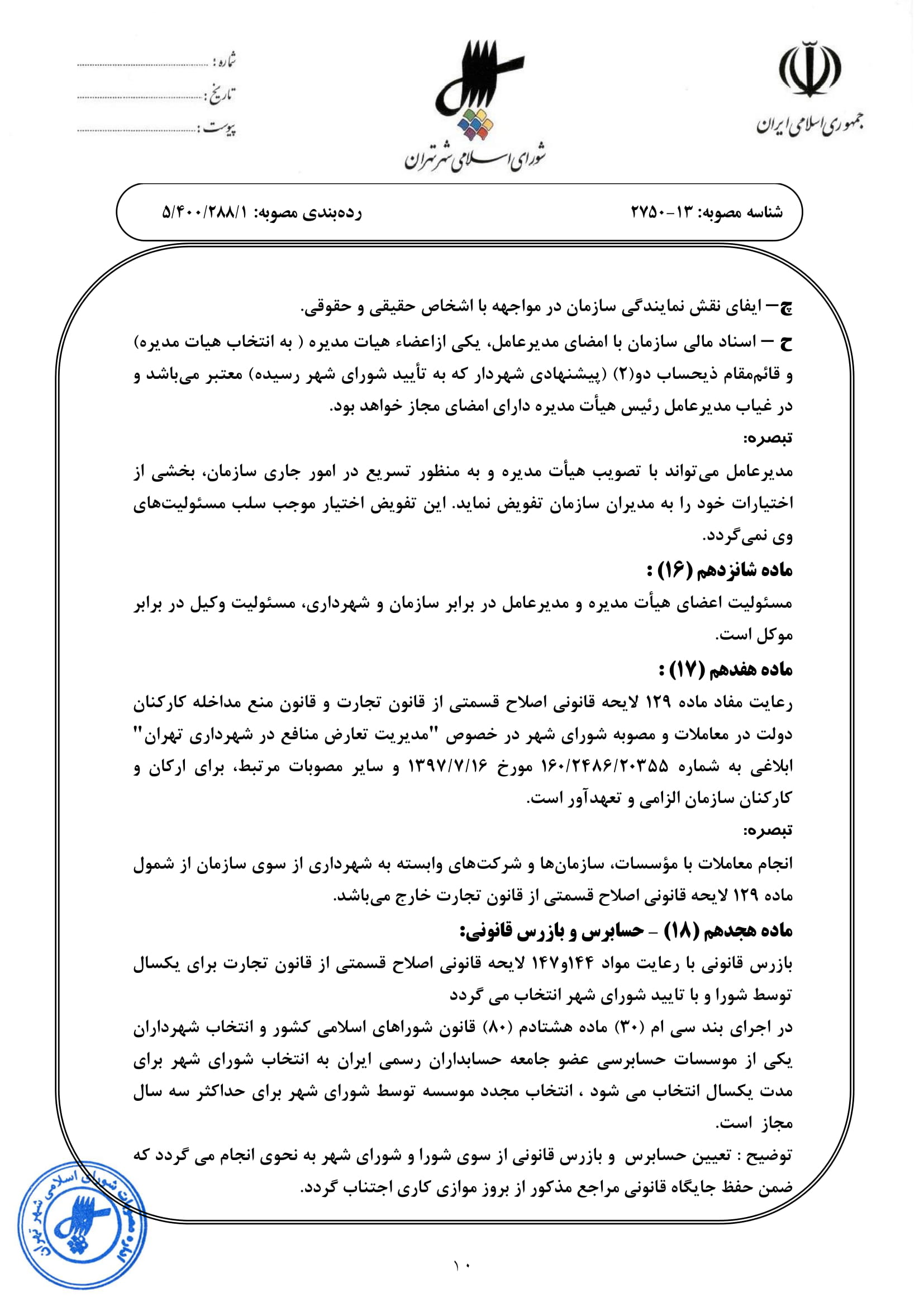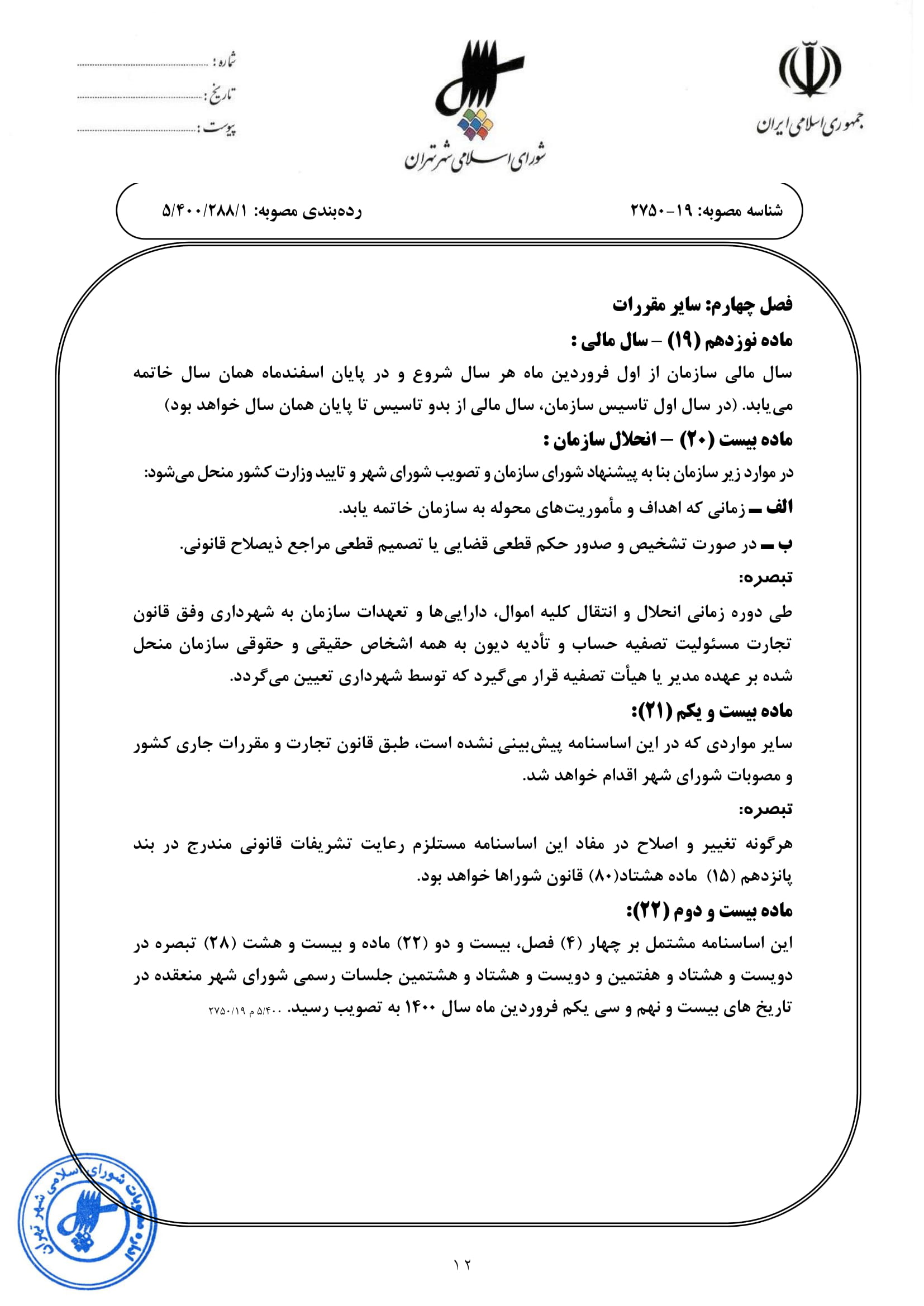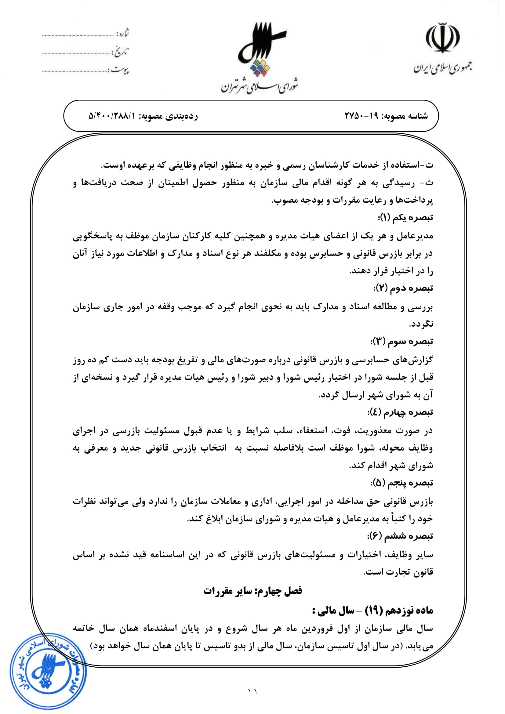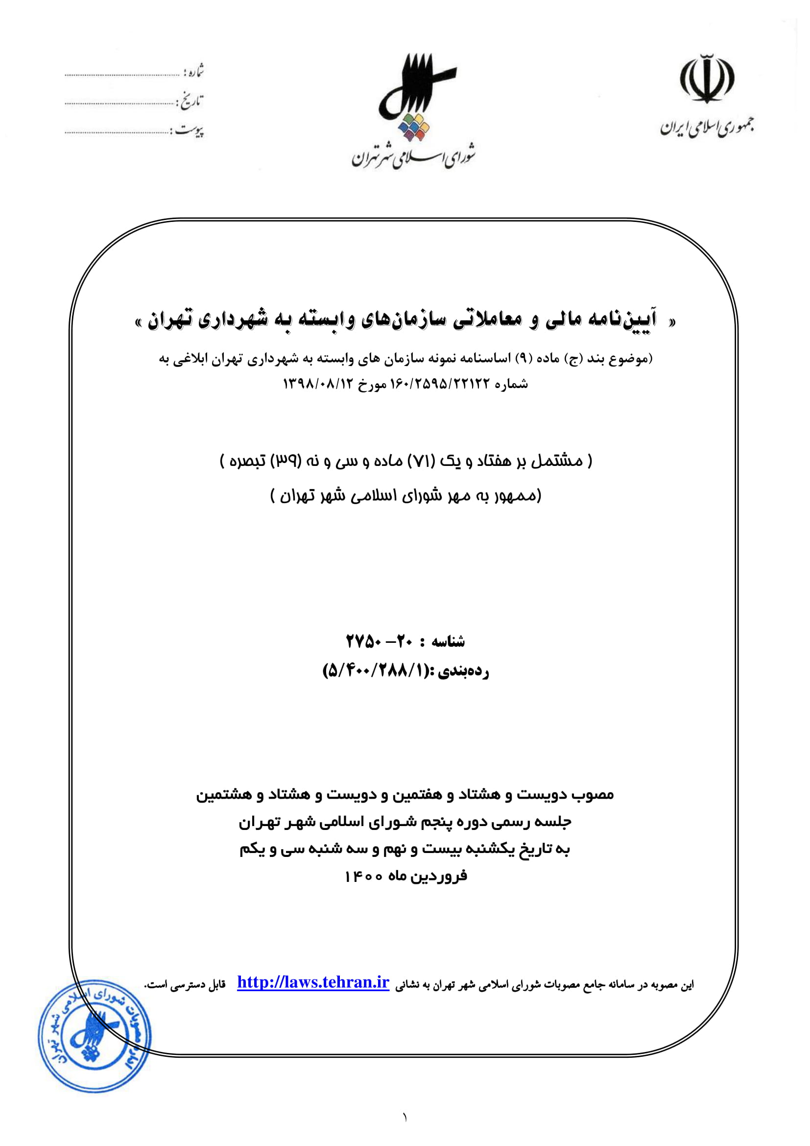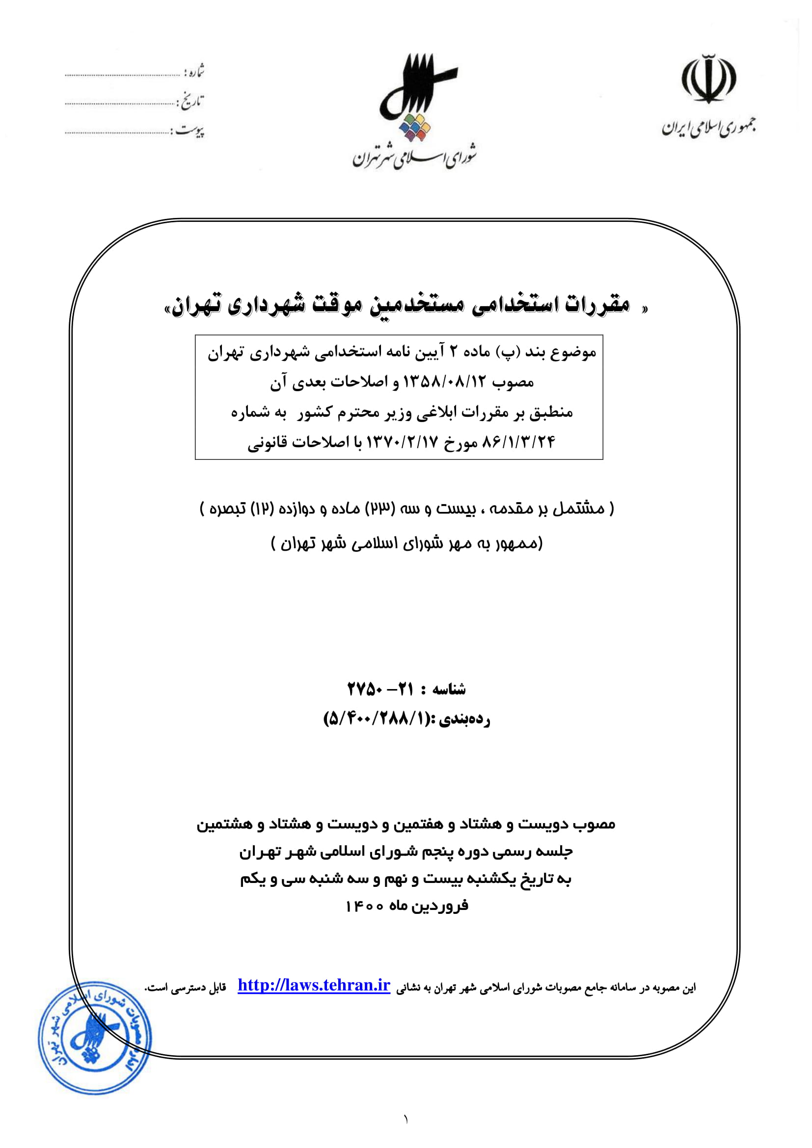 اساسنامه‌هاي 19 سازمان وابسته به شهرداري تهران به انضمام آيين‌نامه مالي و معاملاتي سازمان‌هاي وابسته و مقررات استخدامي مستخدمين موقت شهرداري تهران
