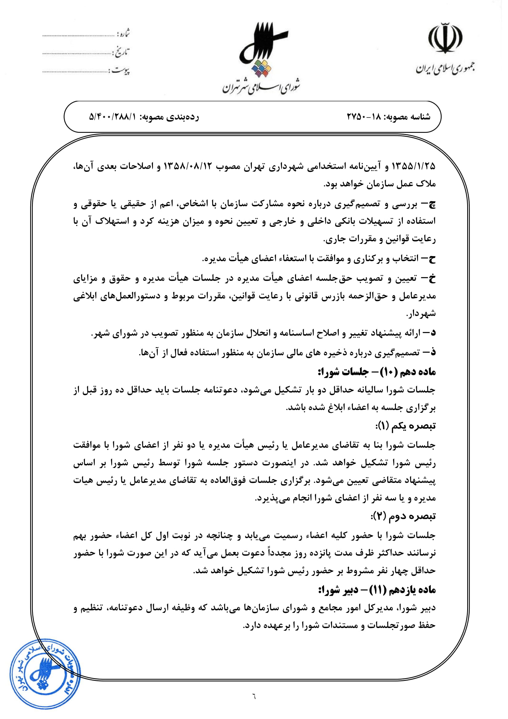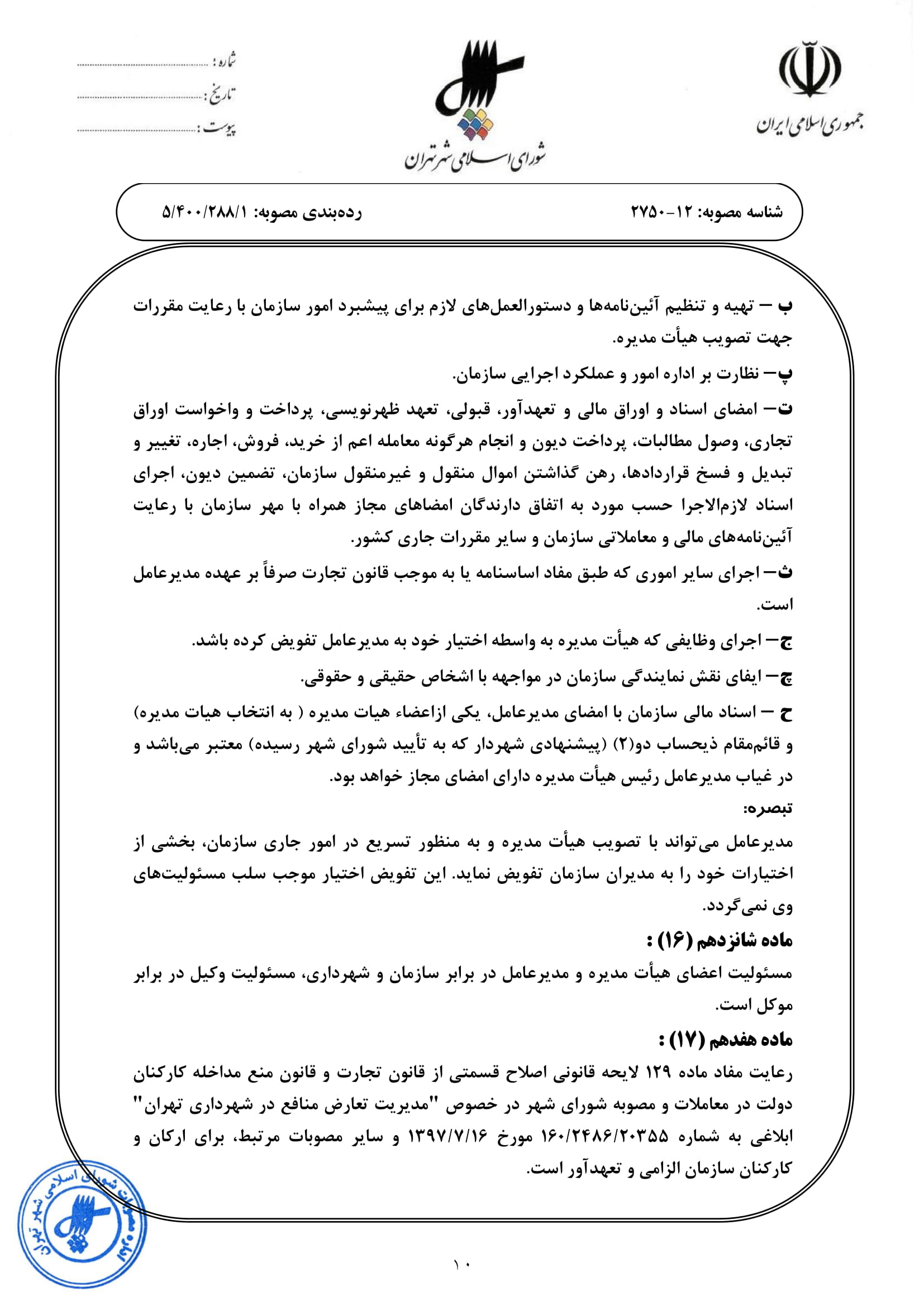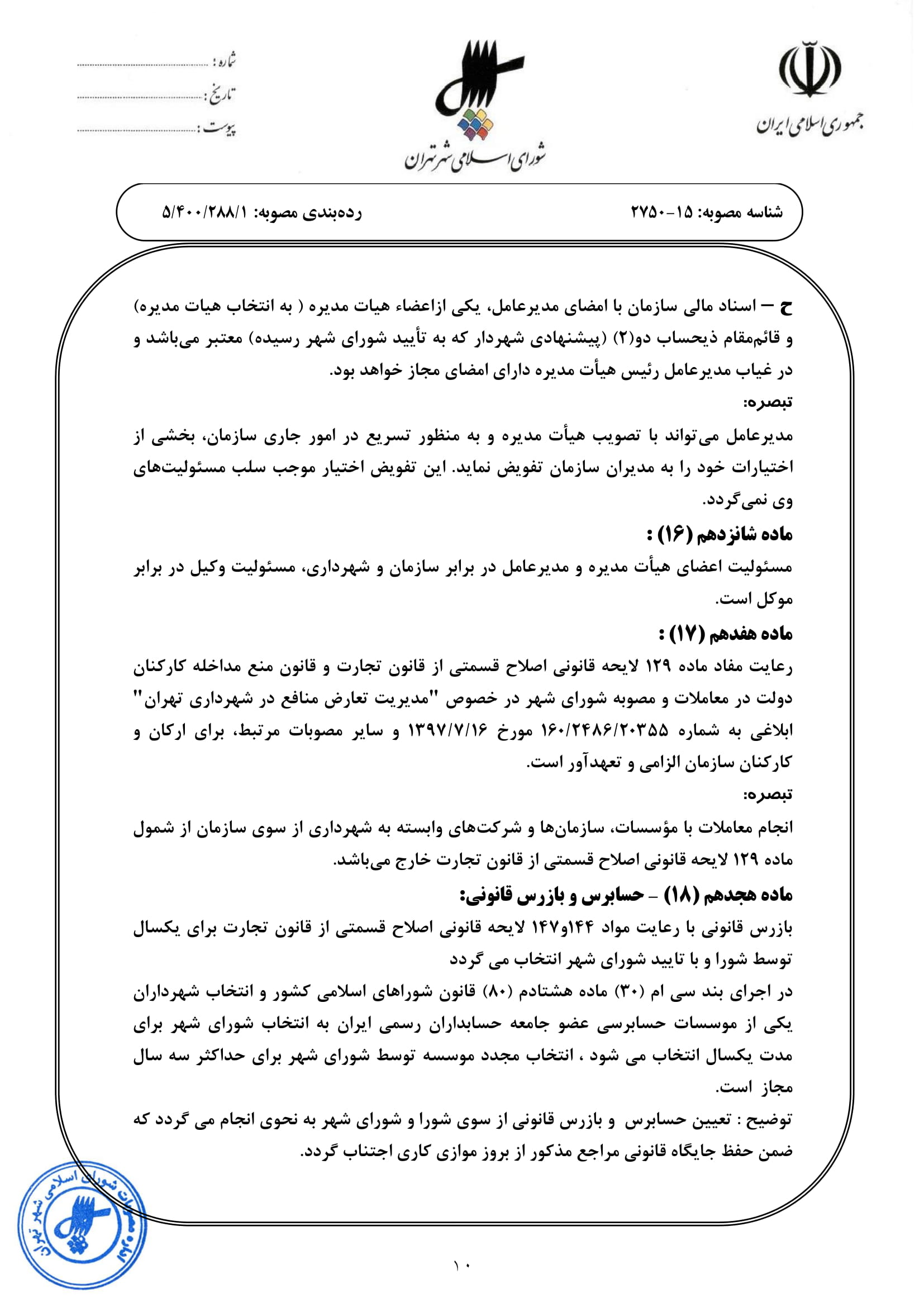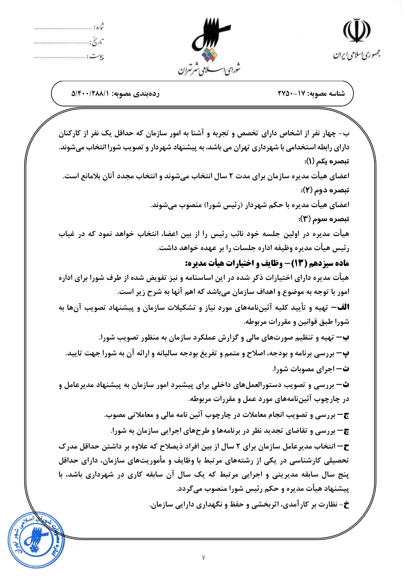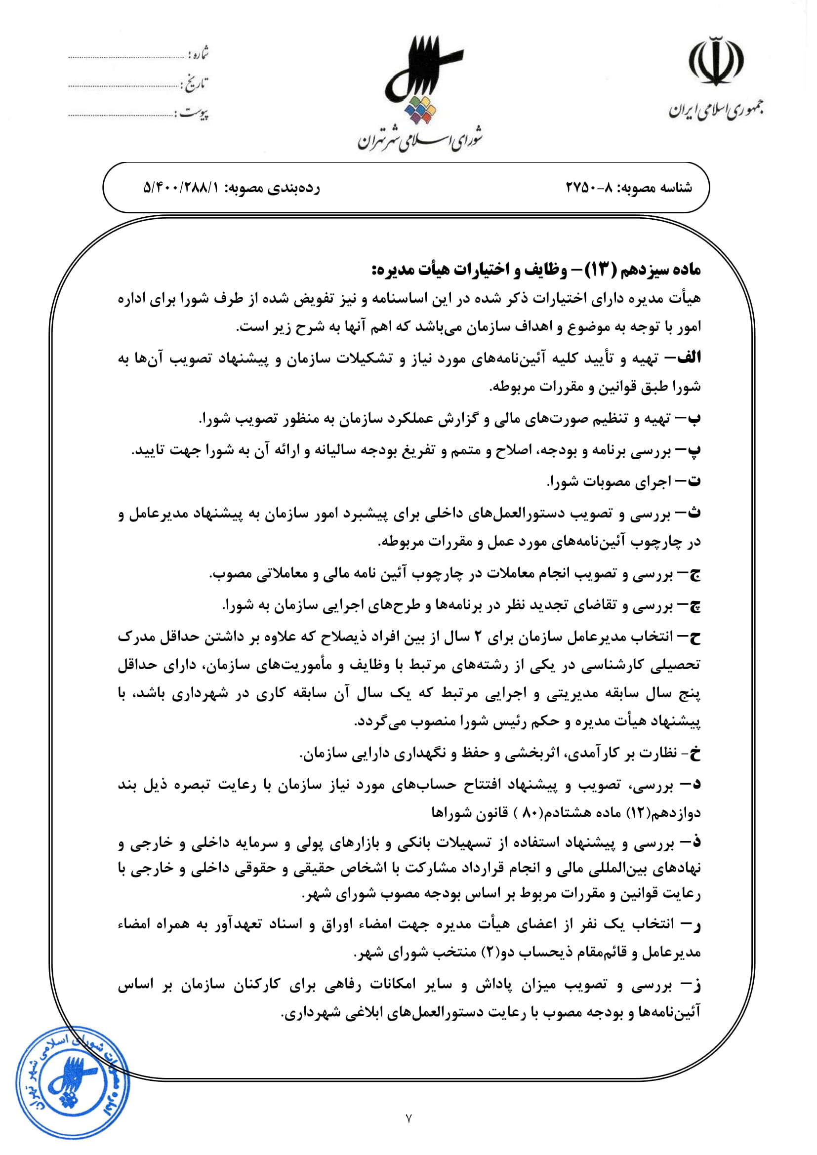 اساسنامه‌هاي 19 سازمان وابسته به شهرداري تهران به انضمام آيين‌نامه مالي و معاملاتي سازمان‌هاي وابسته و مقررات استخدامي مستخدمين موقت شهرداري تهران