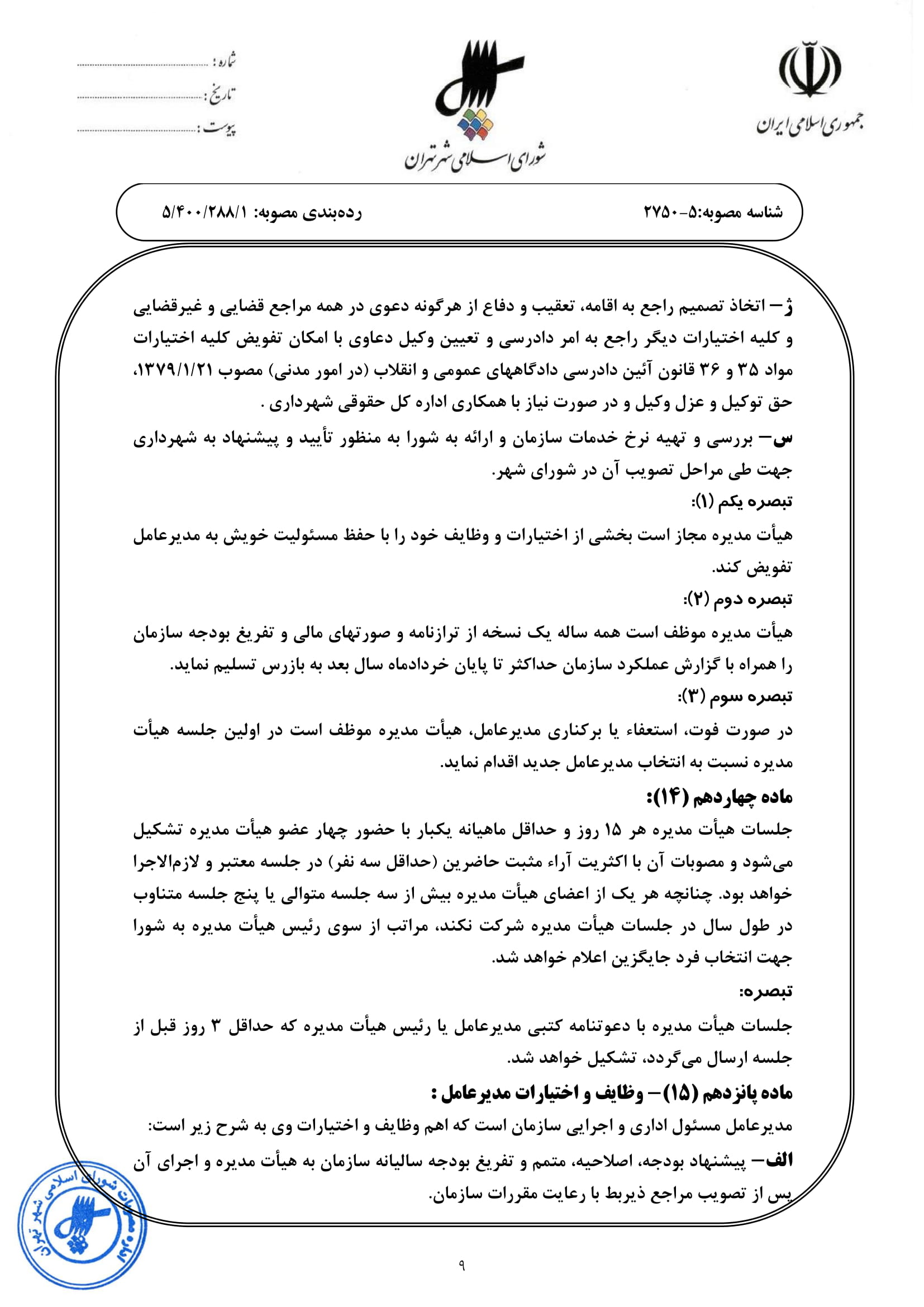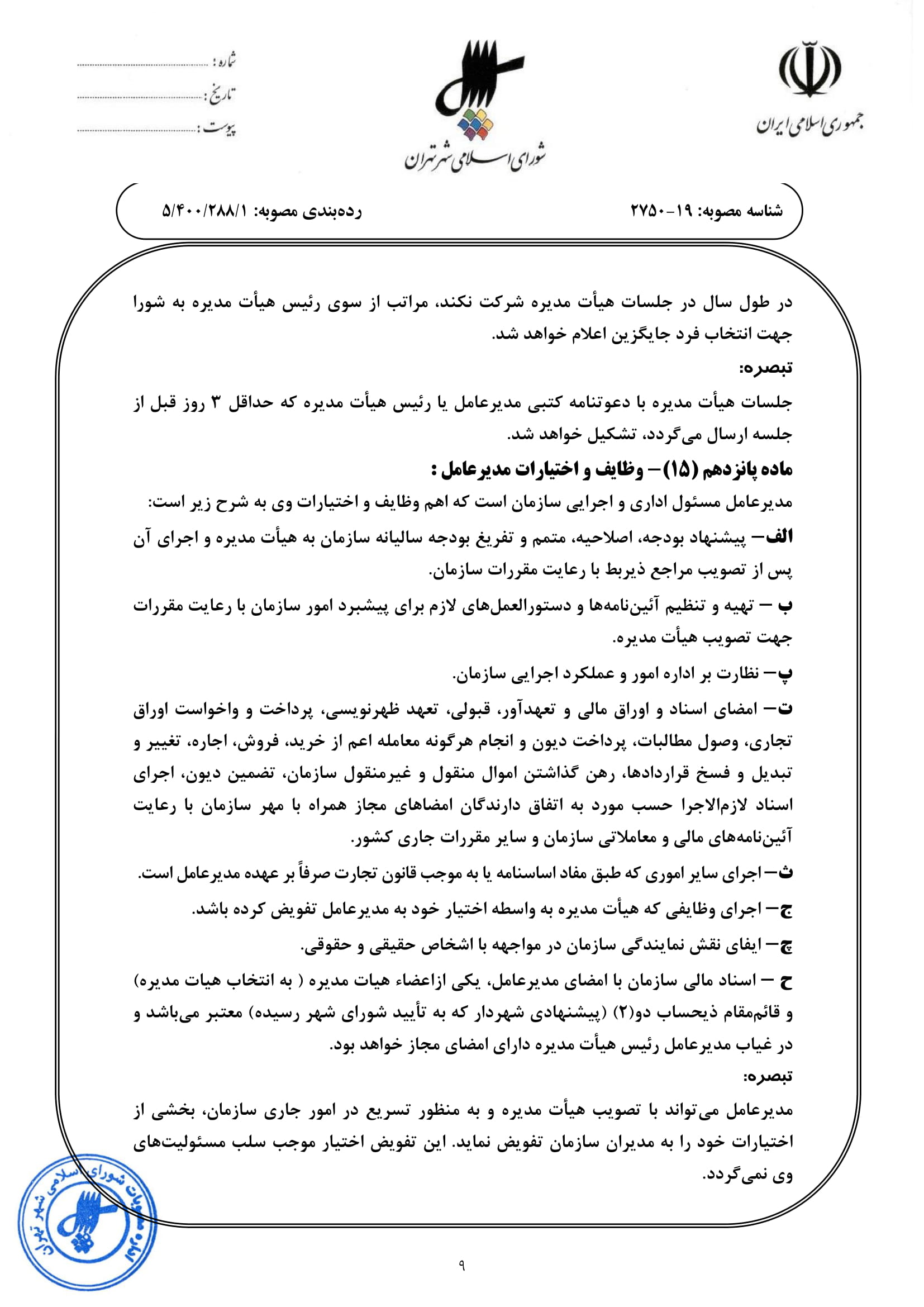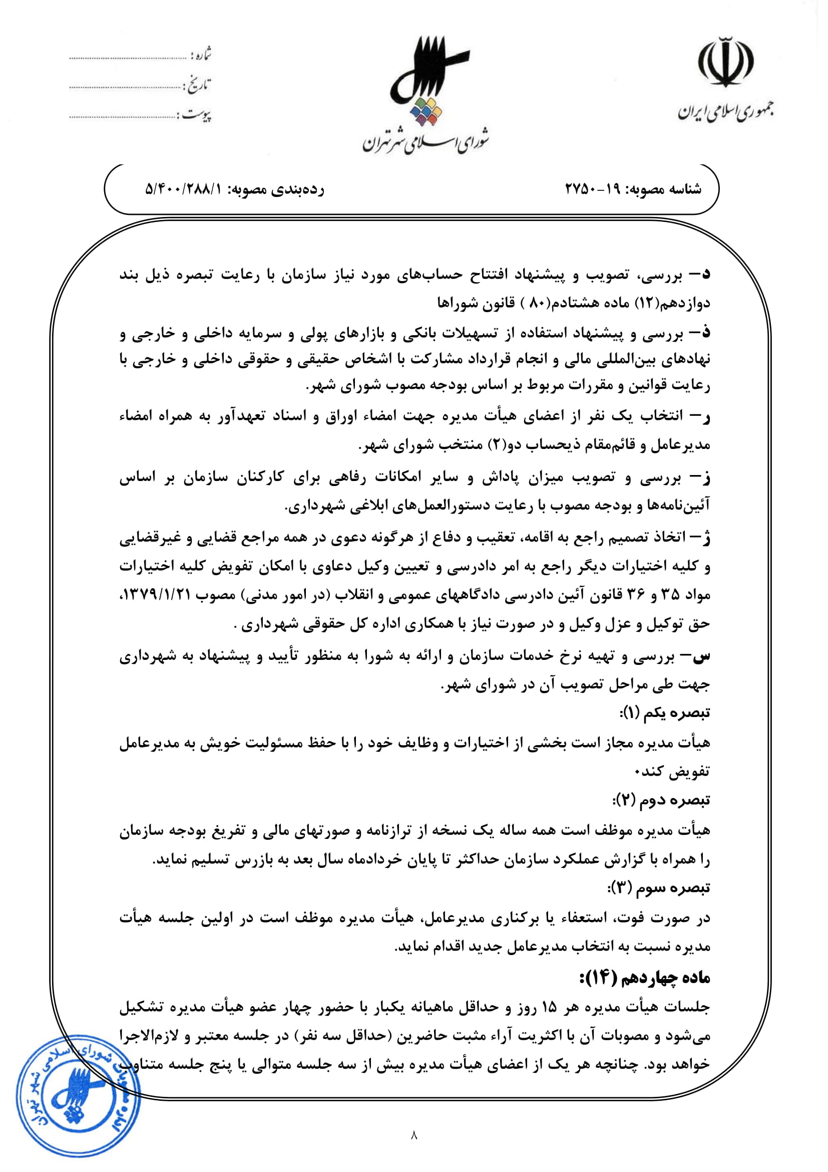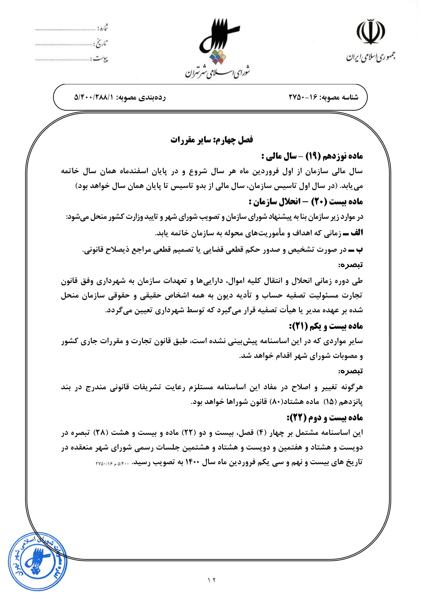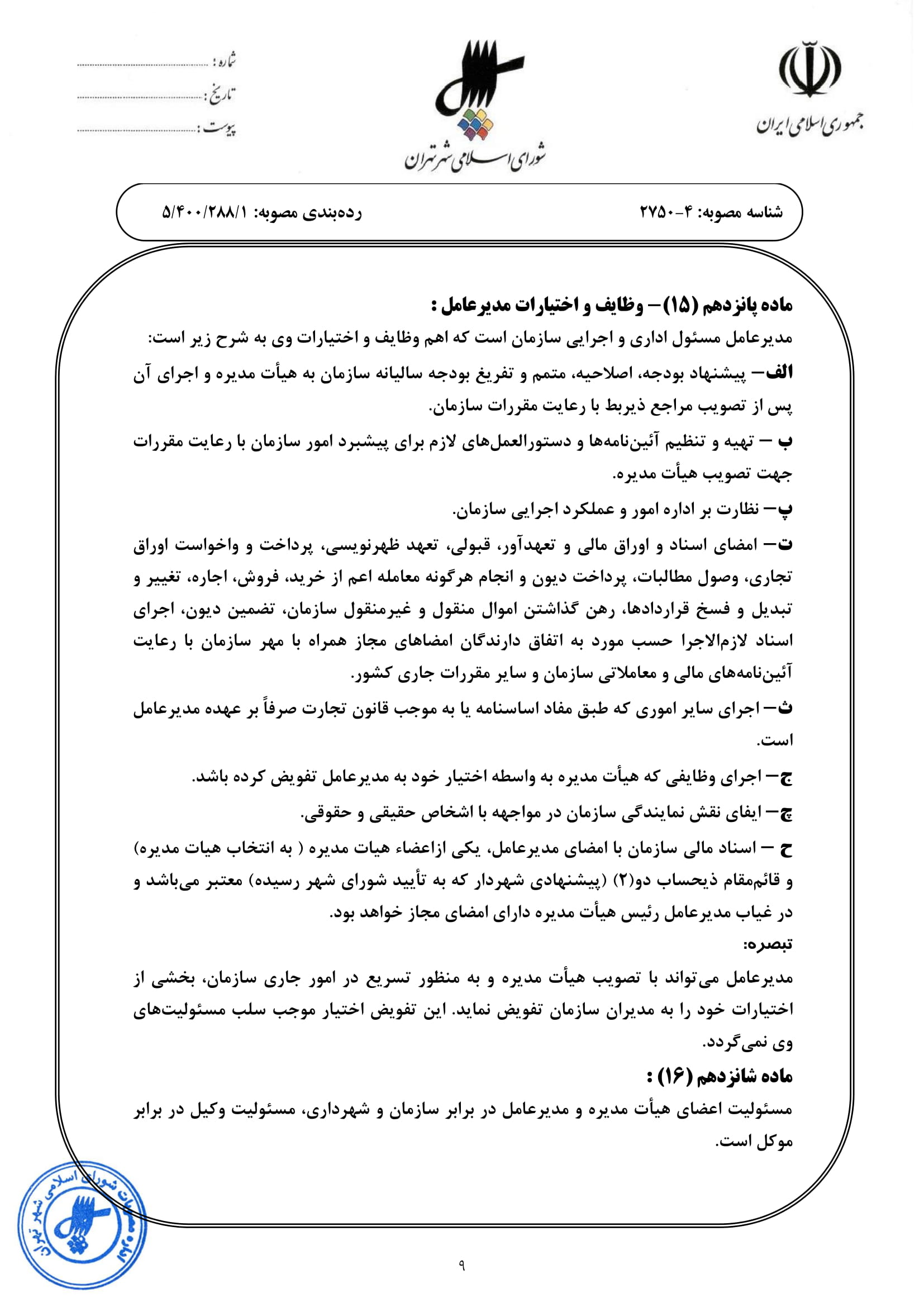 اساسنامه‌هاي 19 سازمان وابسته به شهرداري تهران به انضمام آيين‌نامه مالي و معاملاتي سازمان‌هاي وابسته و مقررات استخدامي مستخدمين موقت شهرداري تهران