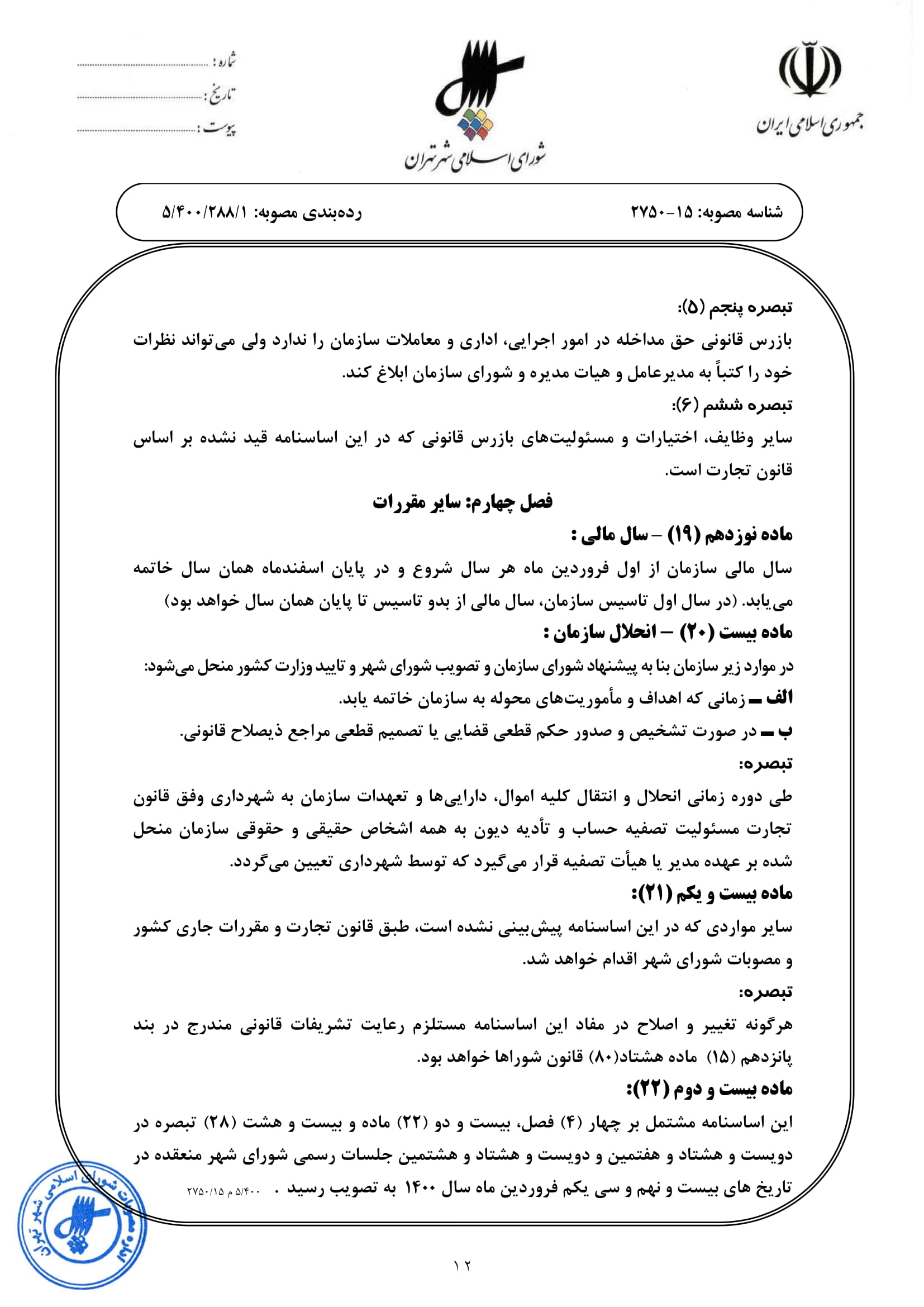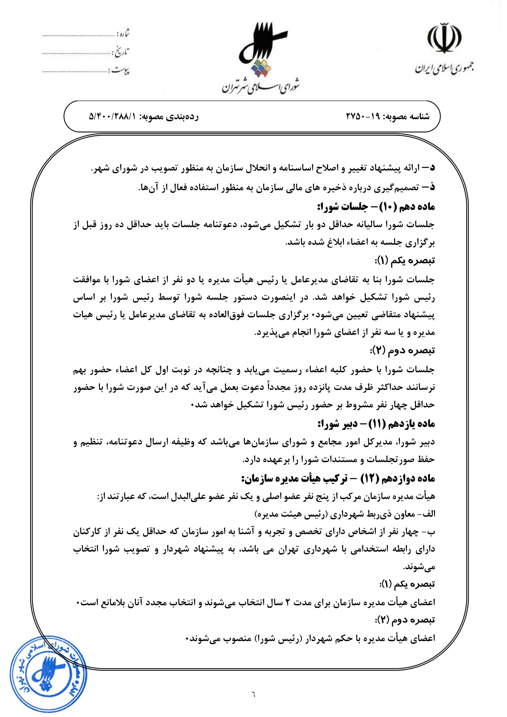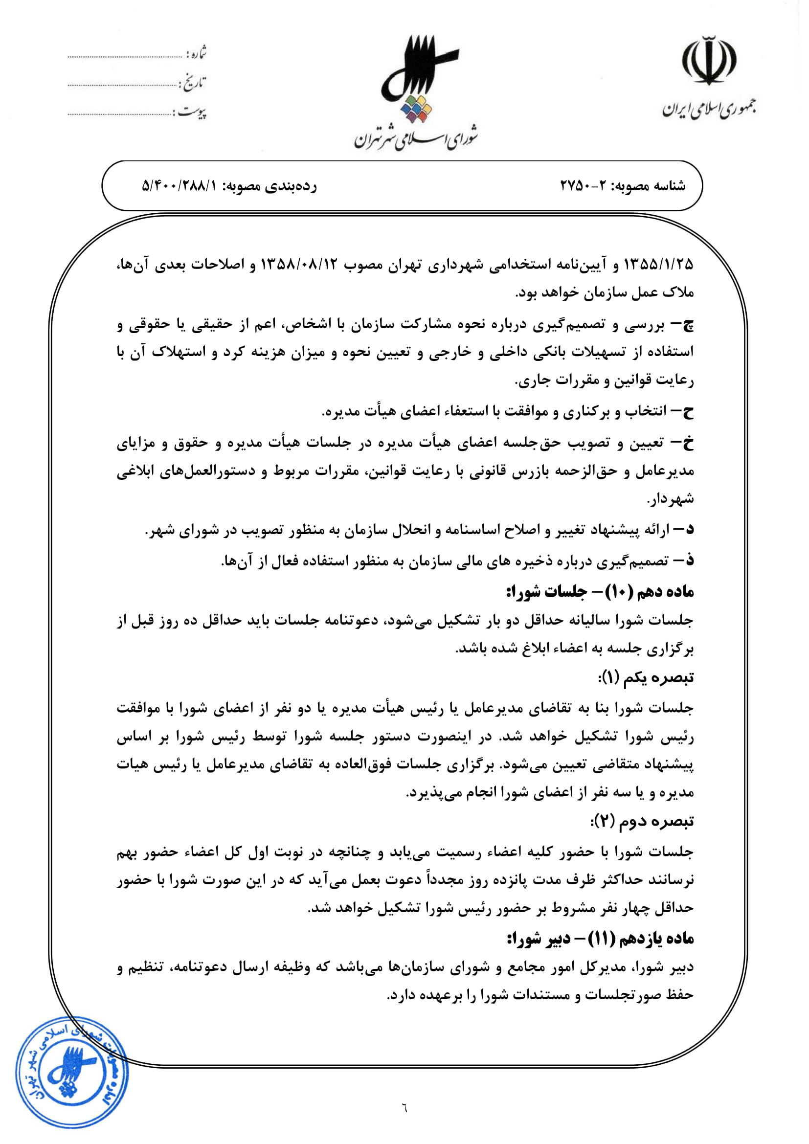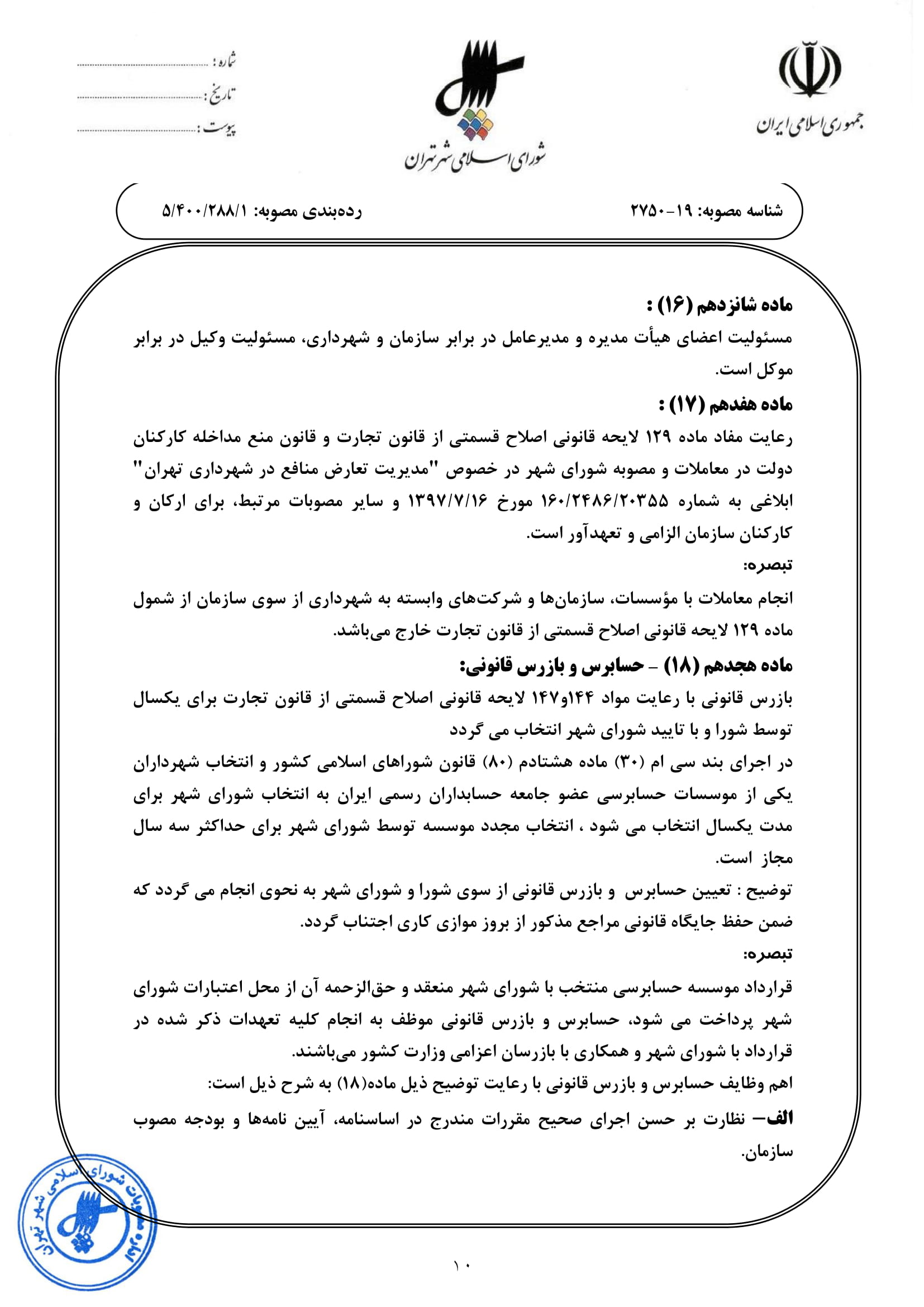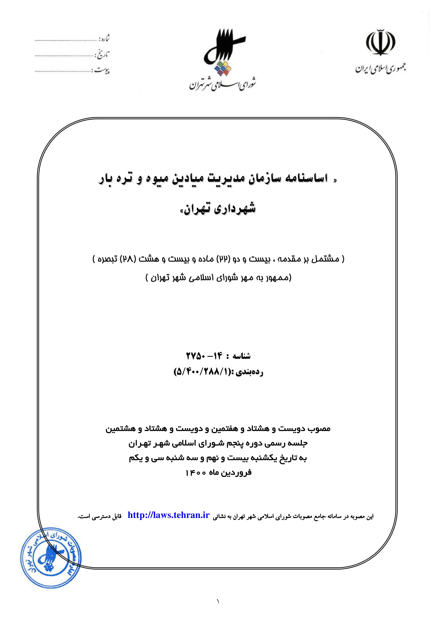 اساسنامه‌هاي 19 سازمان وابسته به شهرداري تهران به انضمام آيين‌نامه مالي و معاملاتي سازمان‌هاي وابسته و مقررات استخدامي مستخدمين موقت شهرداري تهران