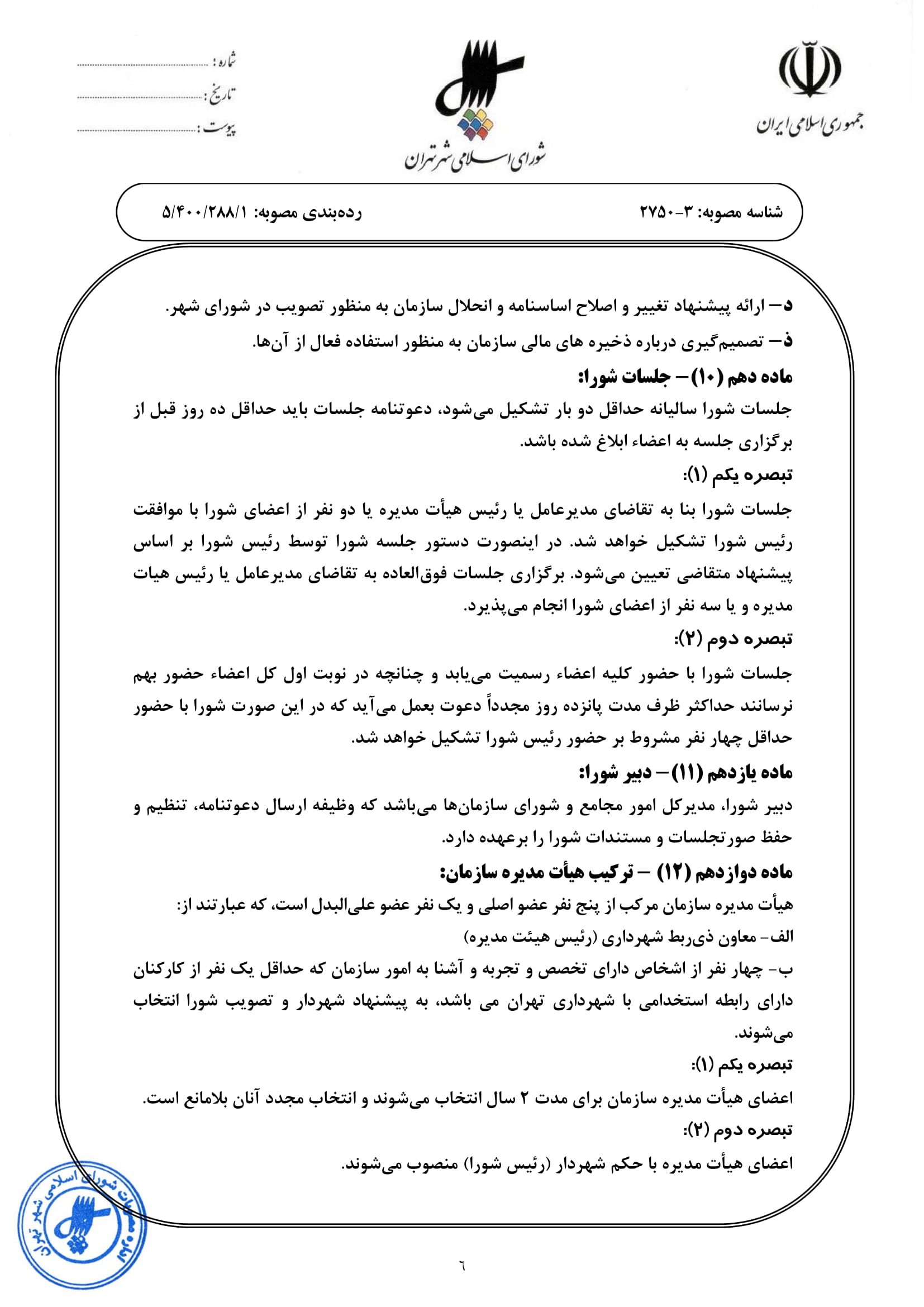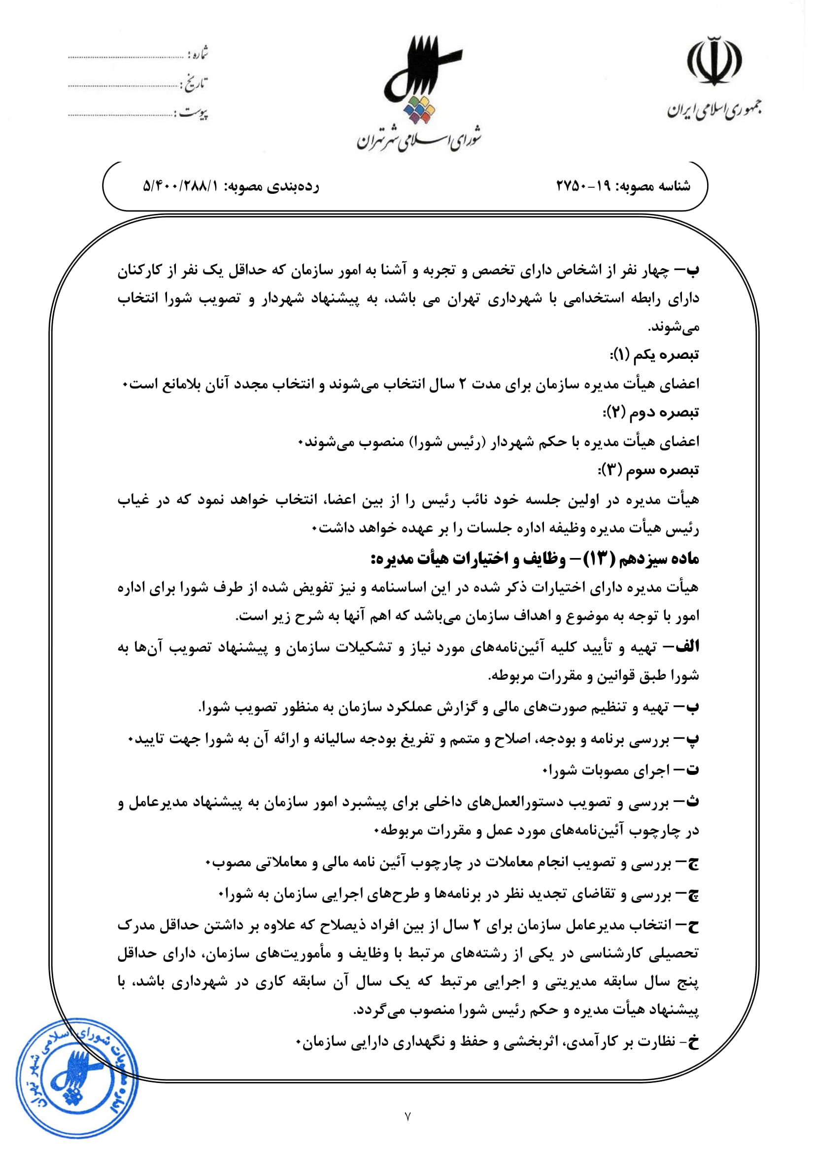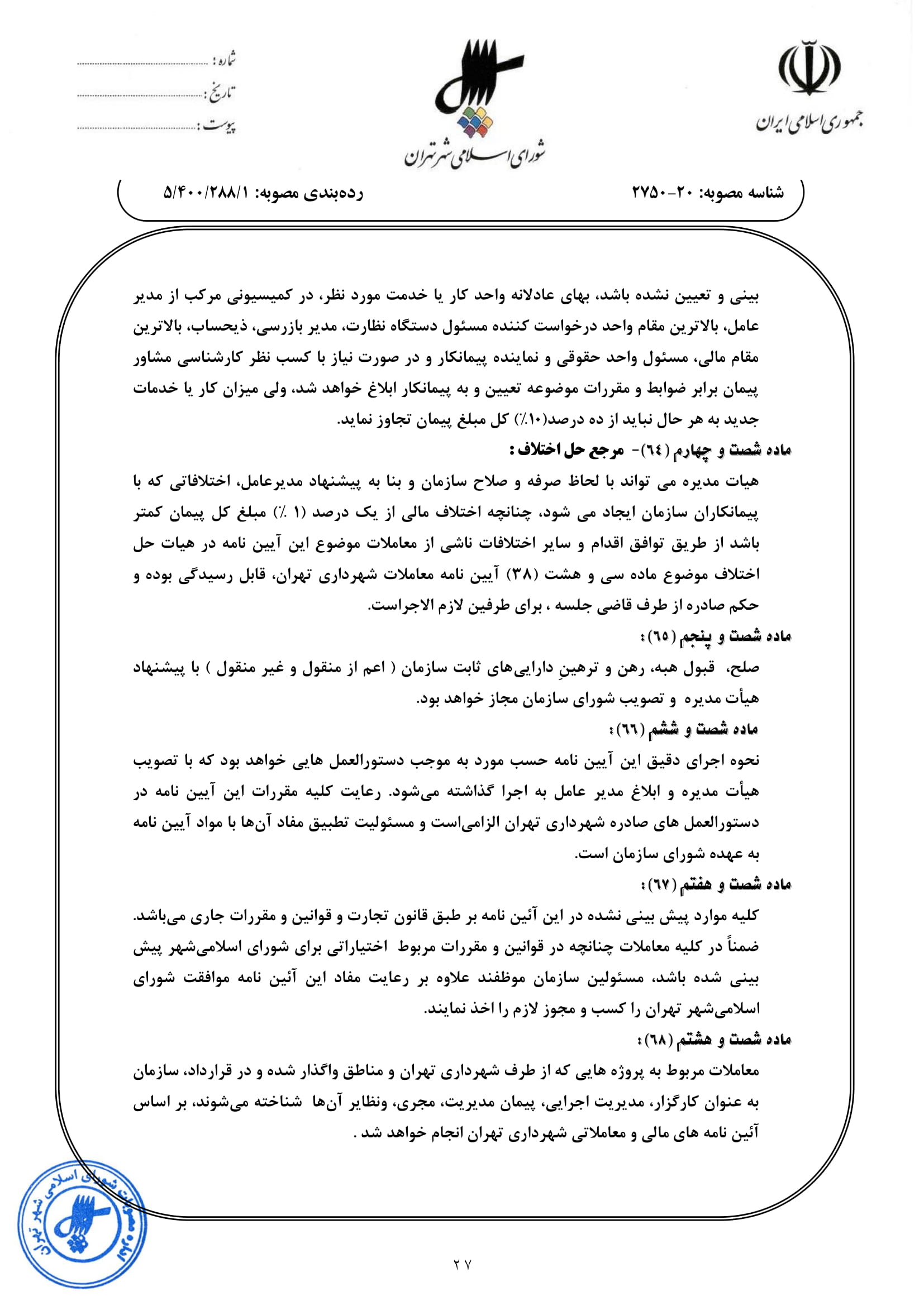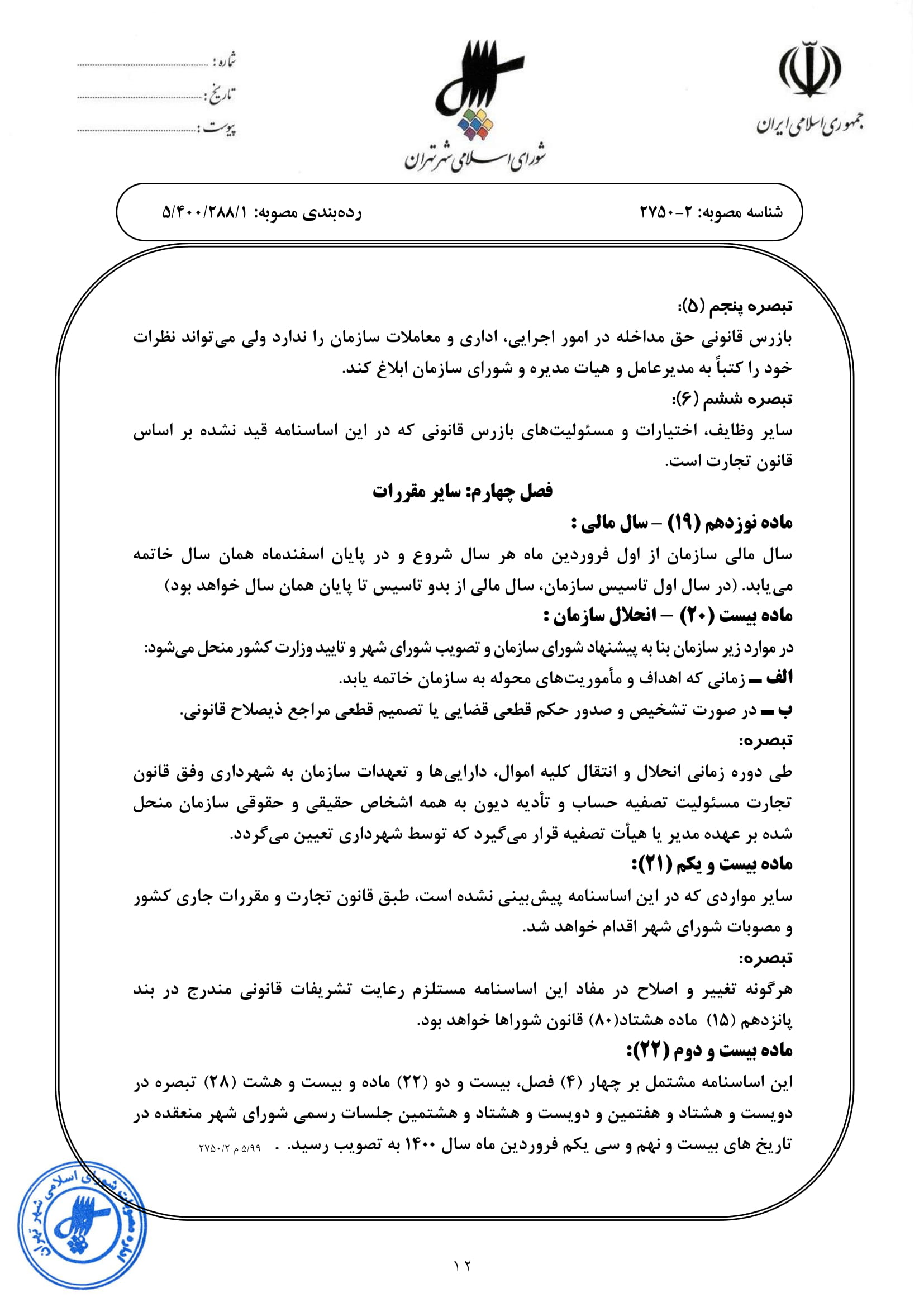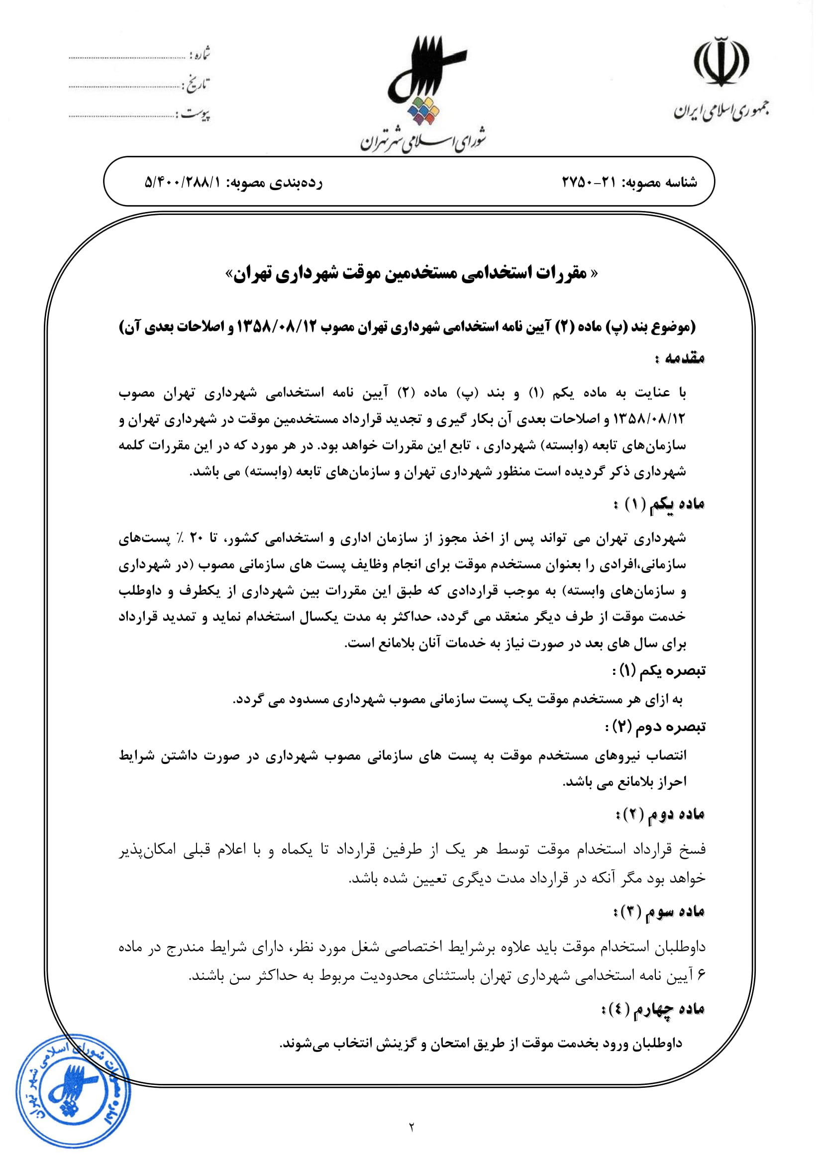 اساسنامه‌هاي 19 سازمان وابسته به شهرداري تهران به انضمام آيين‌نامه مالي و معاملاتي سازمان‌هاي وابسته و مقررات استخدامي مستخدمين موقت شهرداري تهران