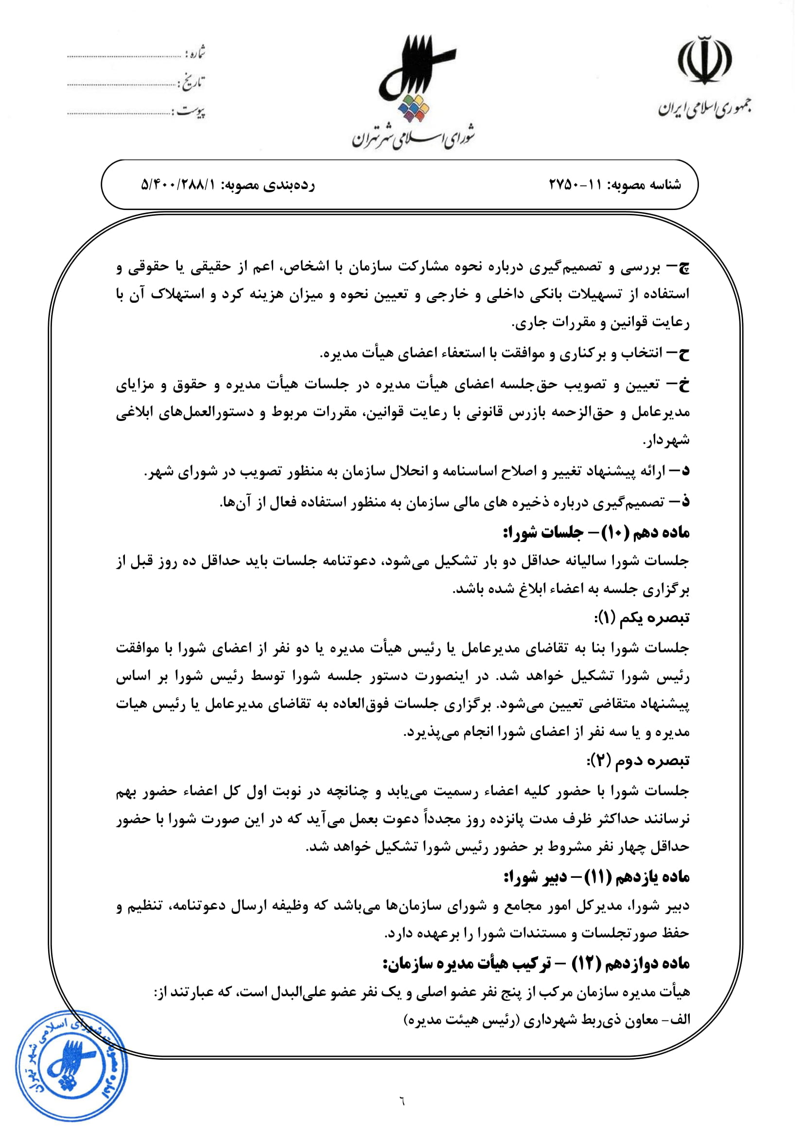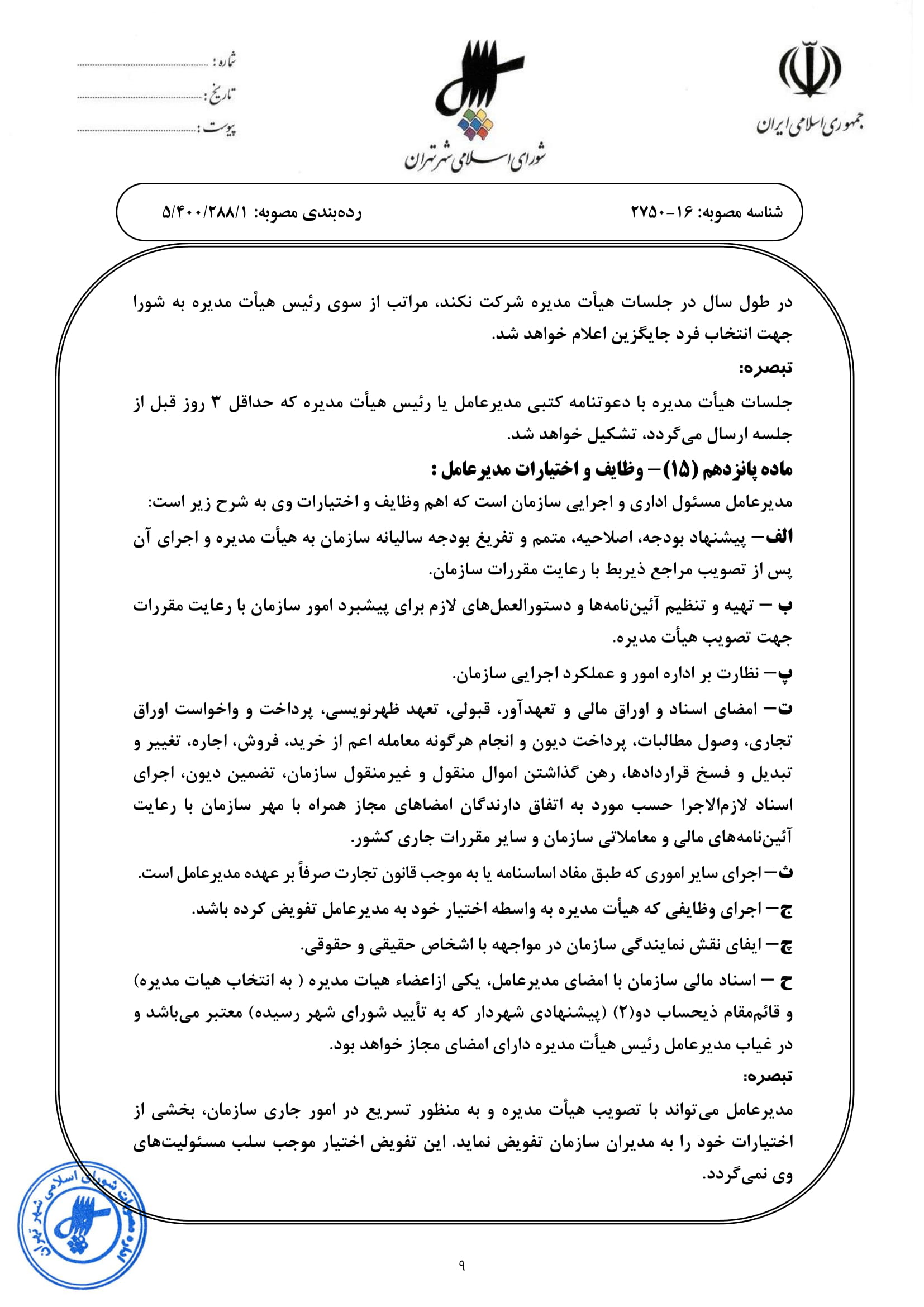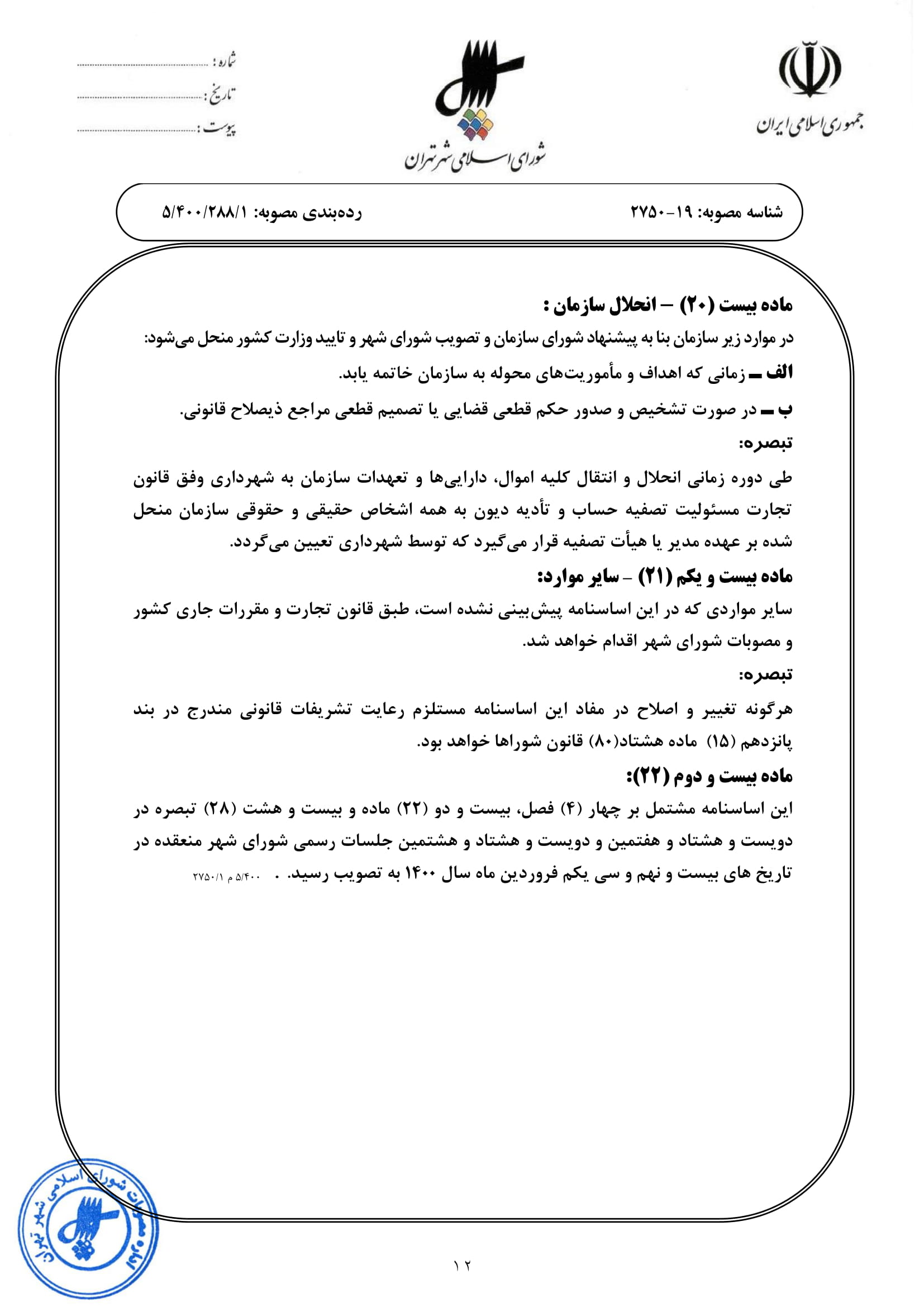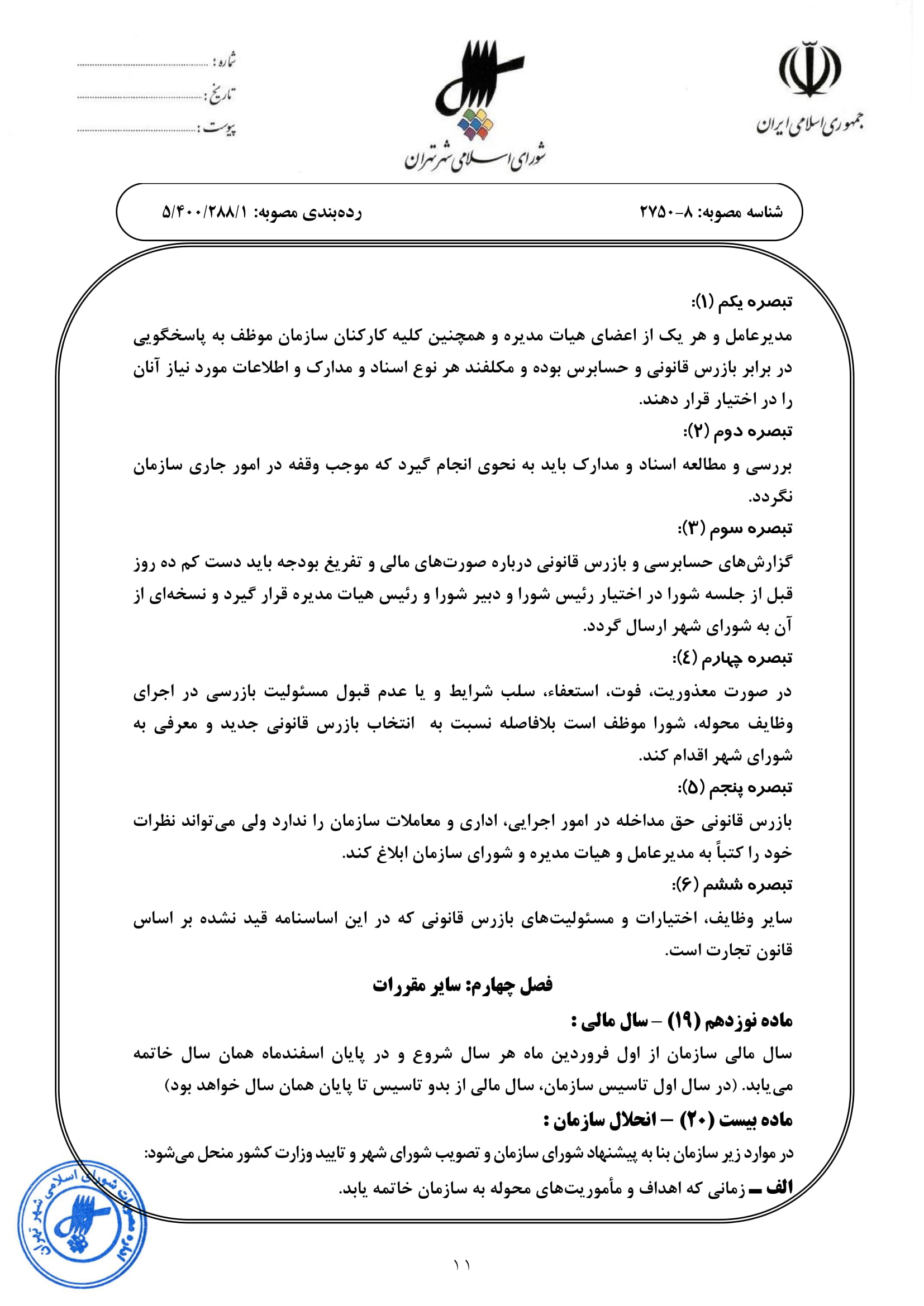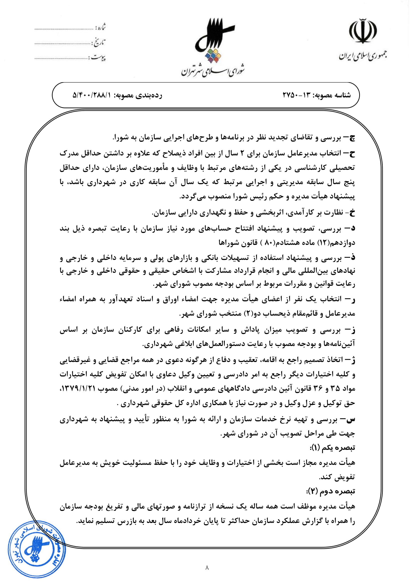 اساسنامه‌هاي 19 سازمان وابسته به شهرداري تهران به انضمام آيين‌نامه مالي و معاملاتي سازمان‌هاي وابسته و مقررات استخدامي مستخدمين موقت شهرداري تهران
