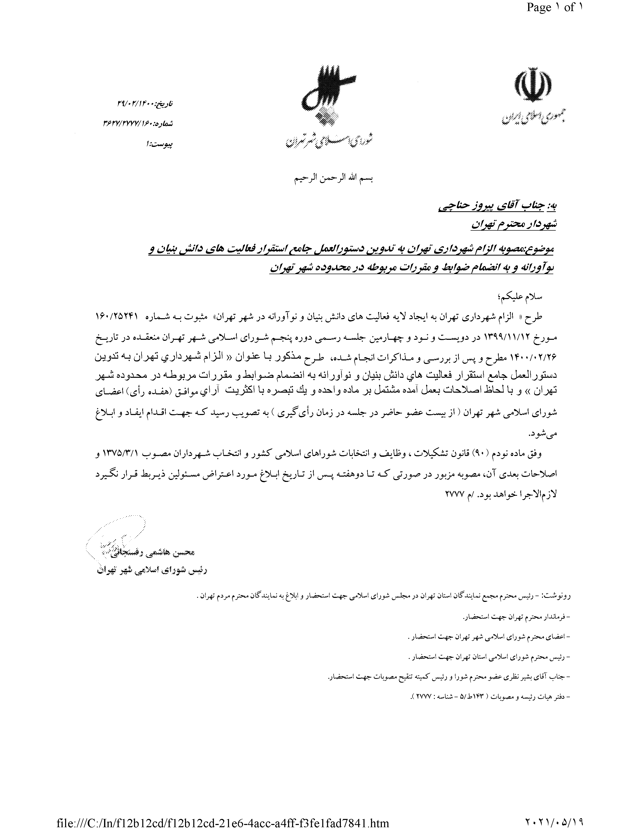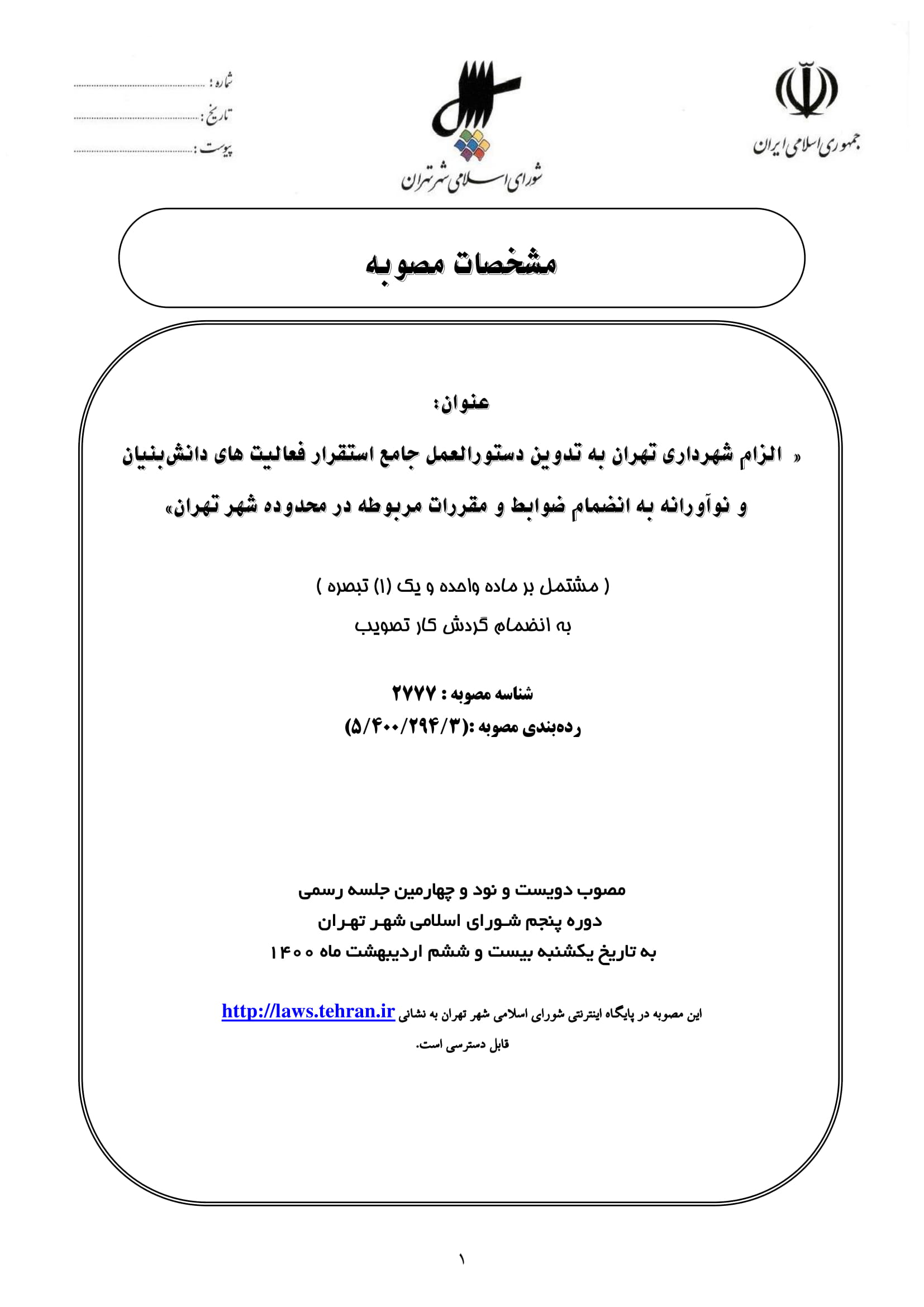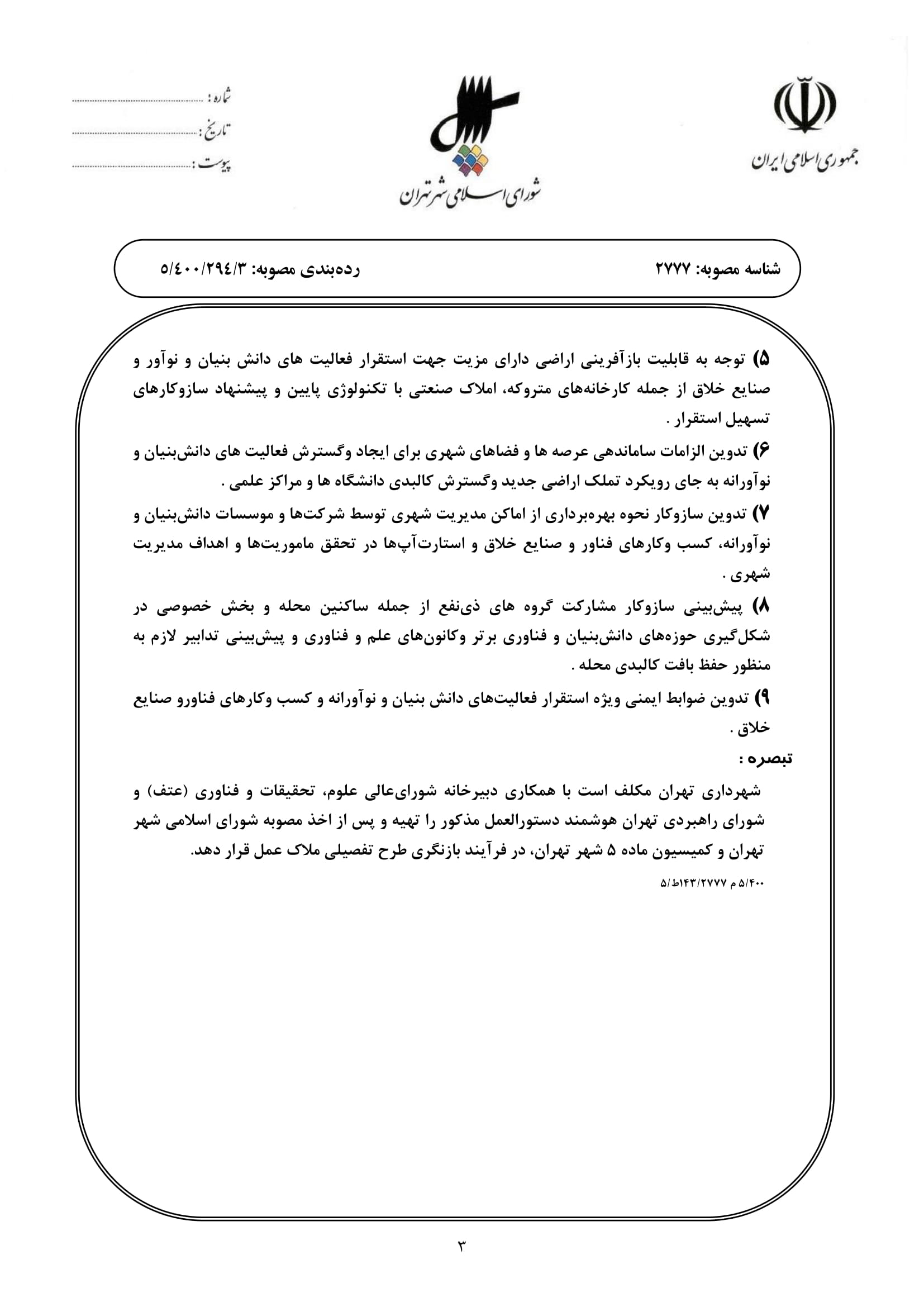 الزام شهرداري تهران به تدوين دستورالعمل جامع استقرار فعاليت هاي دانشبنيان و نوآورانه به انضمام ضوابط و مقررات مربوطه در محدوده شهر تهران