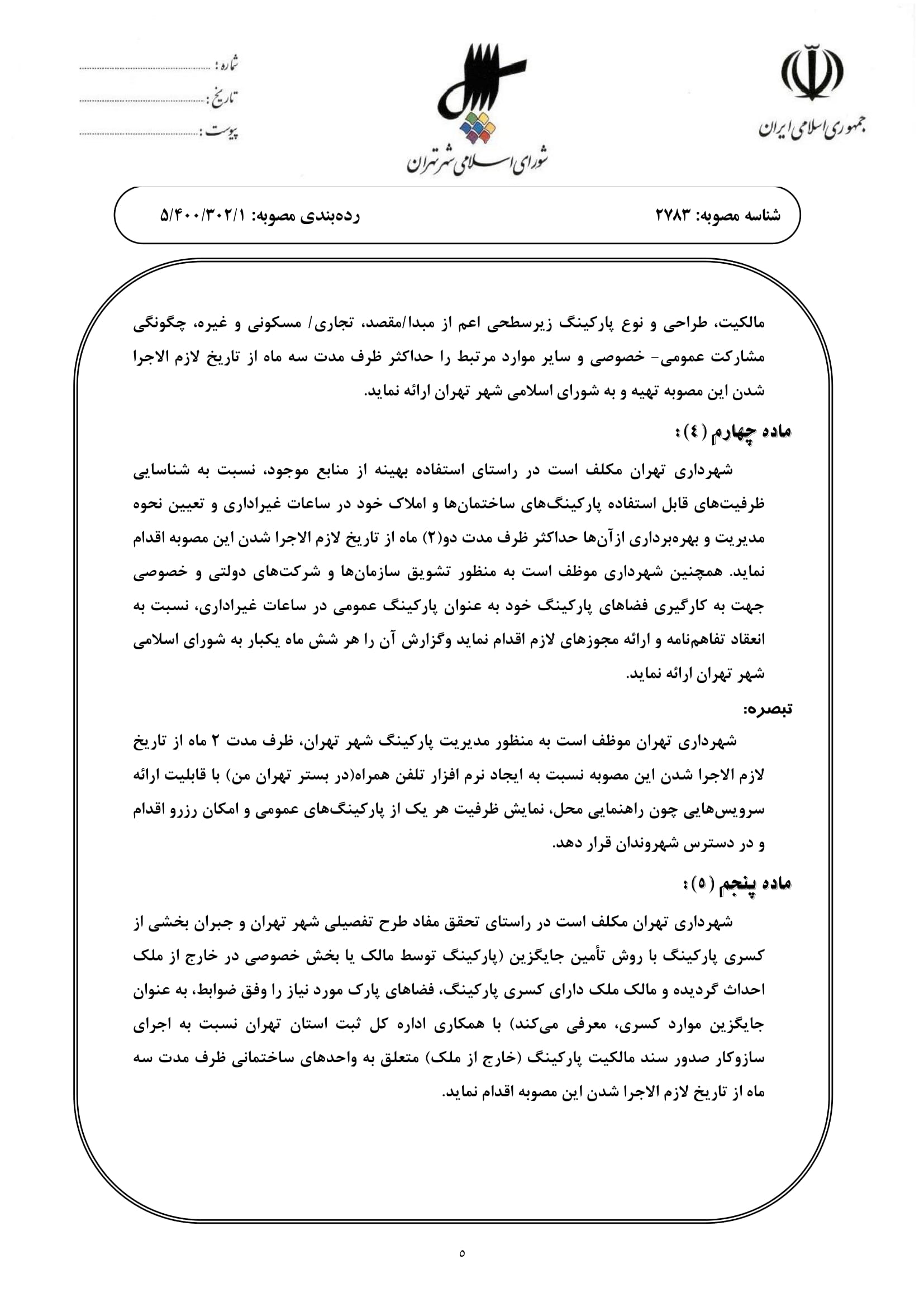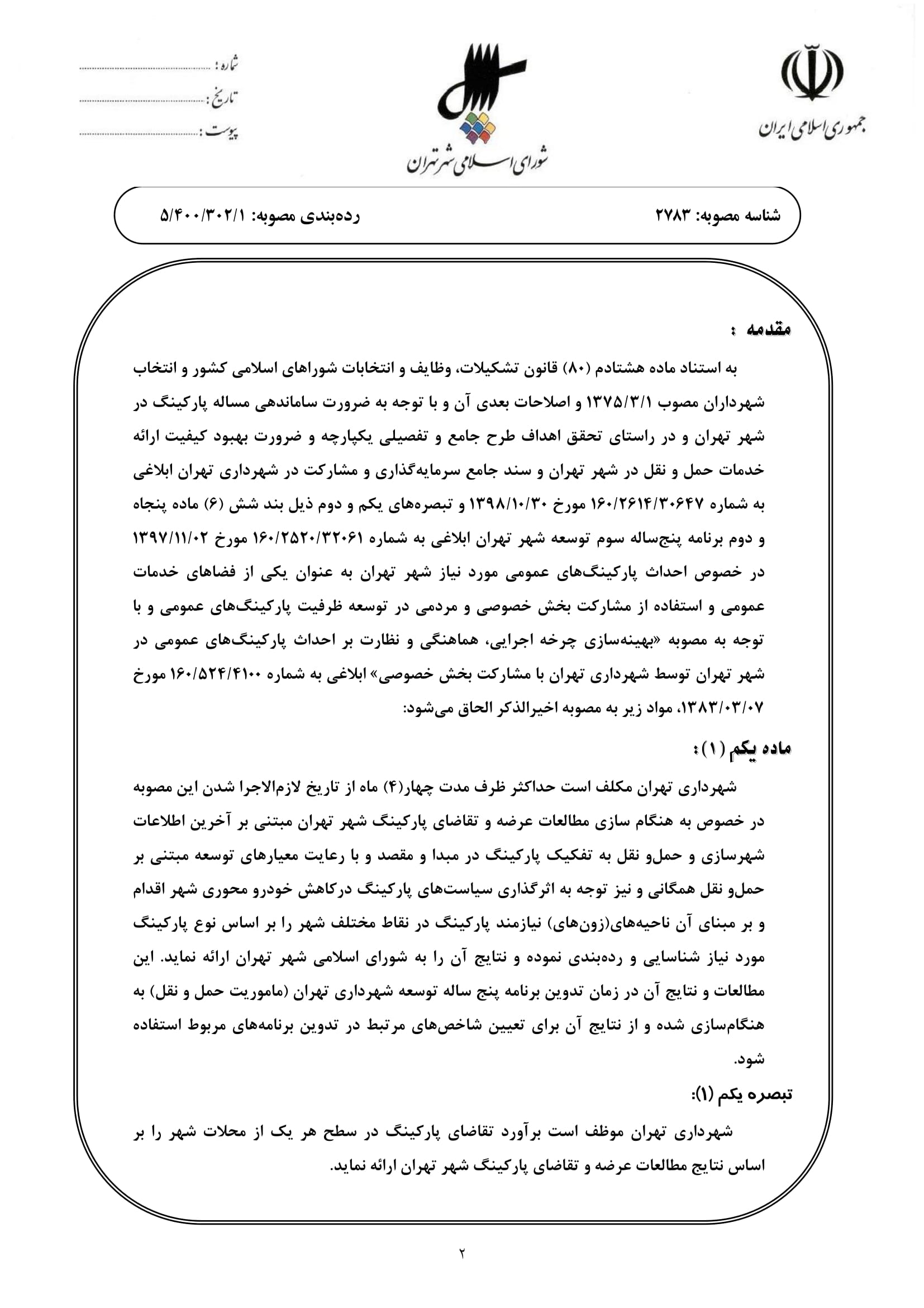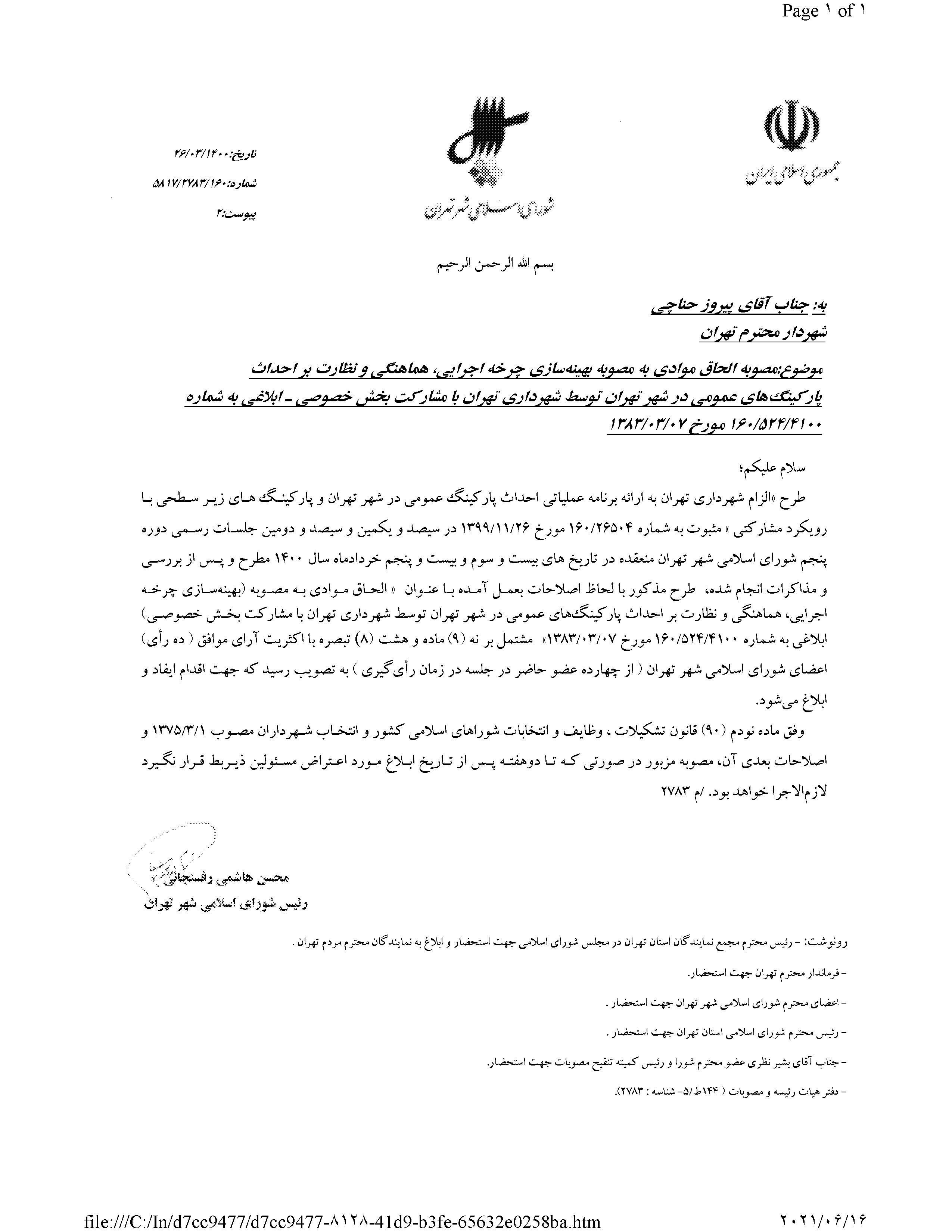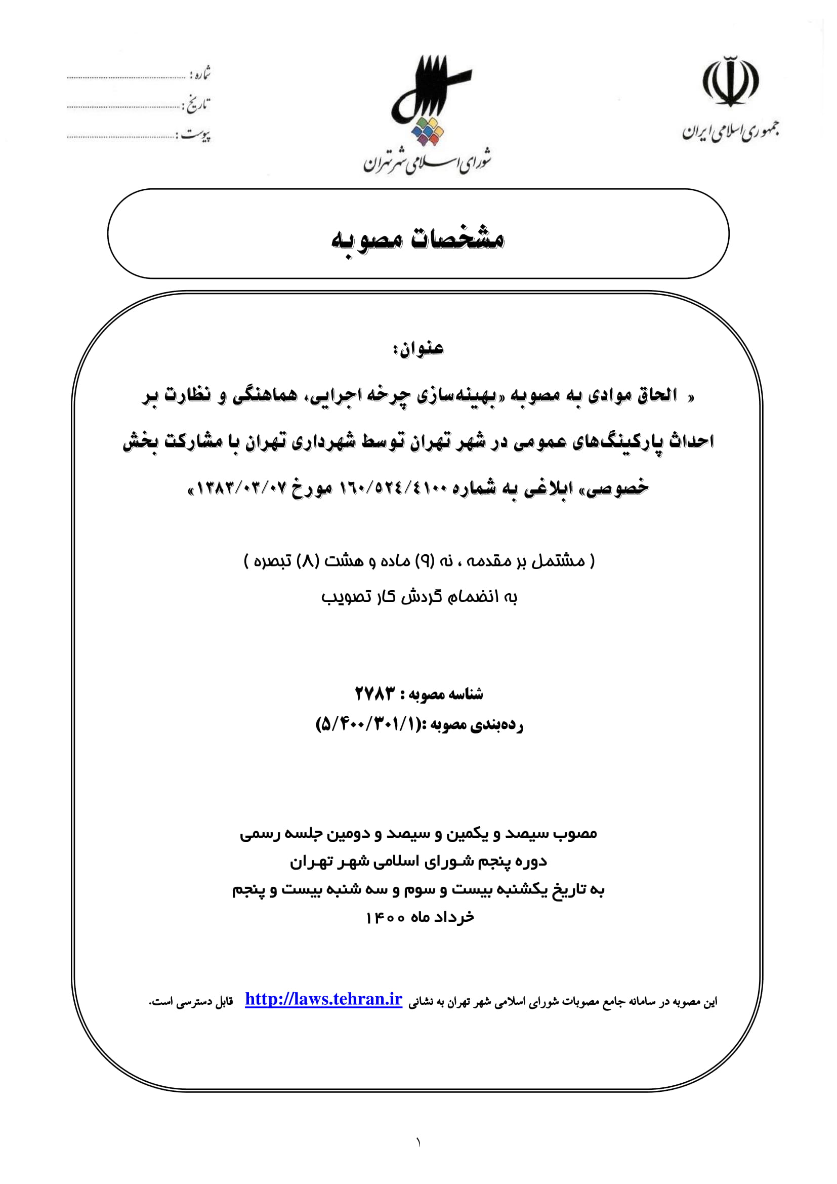 الحاق موادي به مصوبه «بهينهسازي چرخه اجرايي، هماهنگي و نظارت بر احداث پاركينگهاي عمومي در شهر تهران توسط شهرداري تهران با مشاركت بخش خصوصي» ابلاغي به شماره 160/524/4100 مورخ 1383/03/07