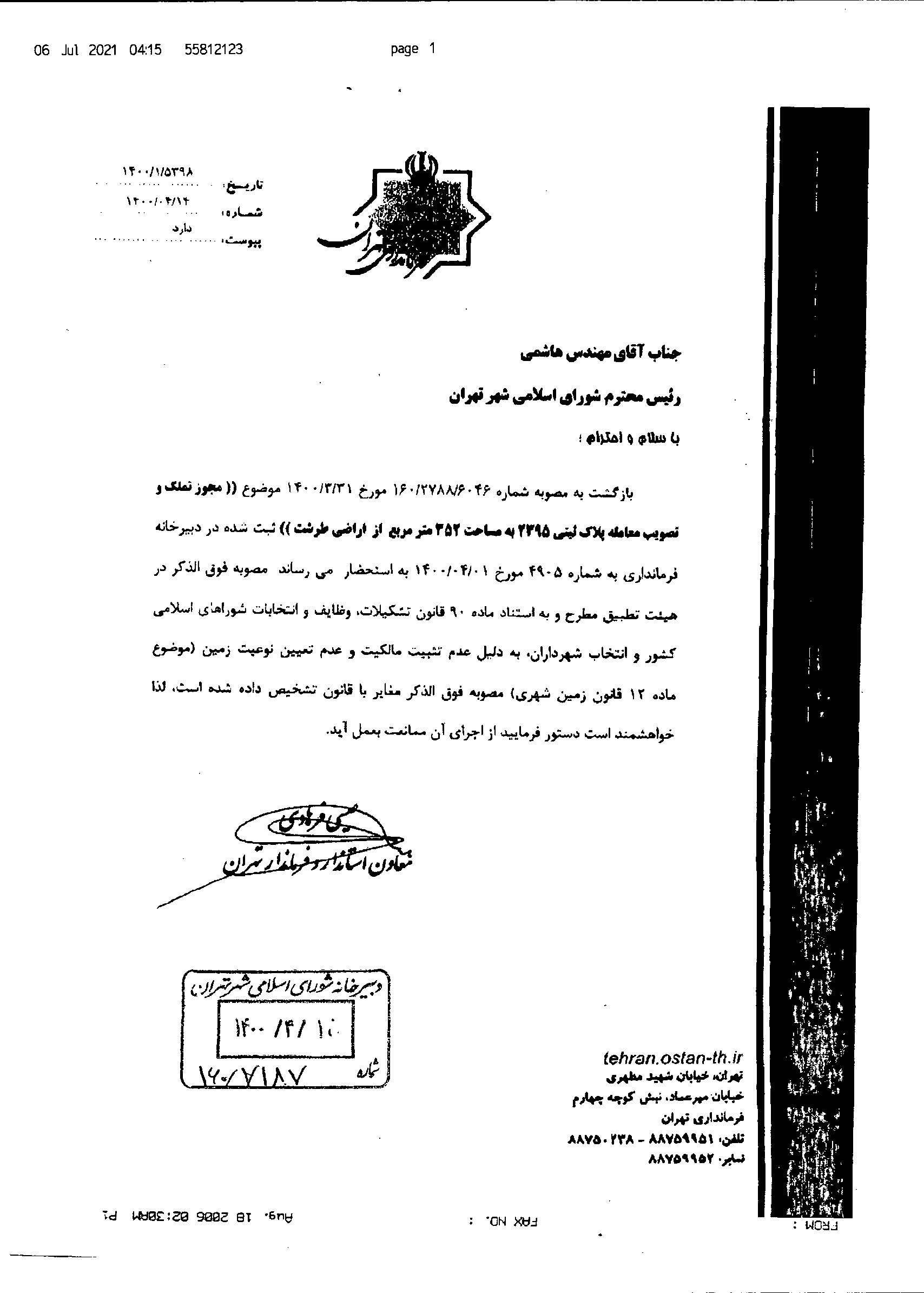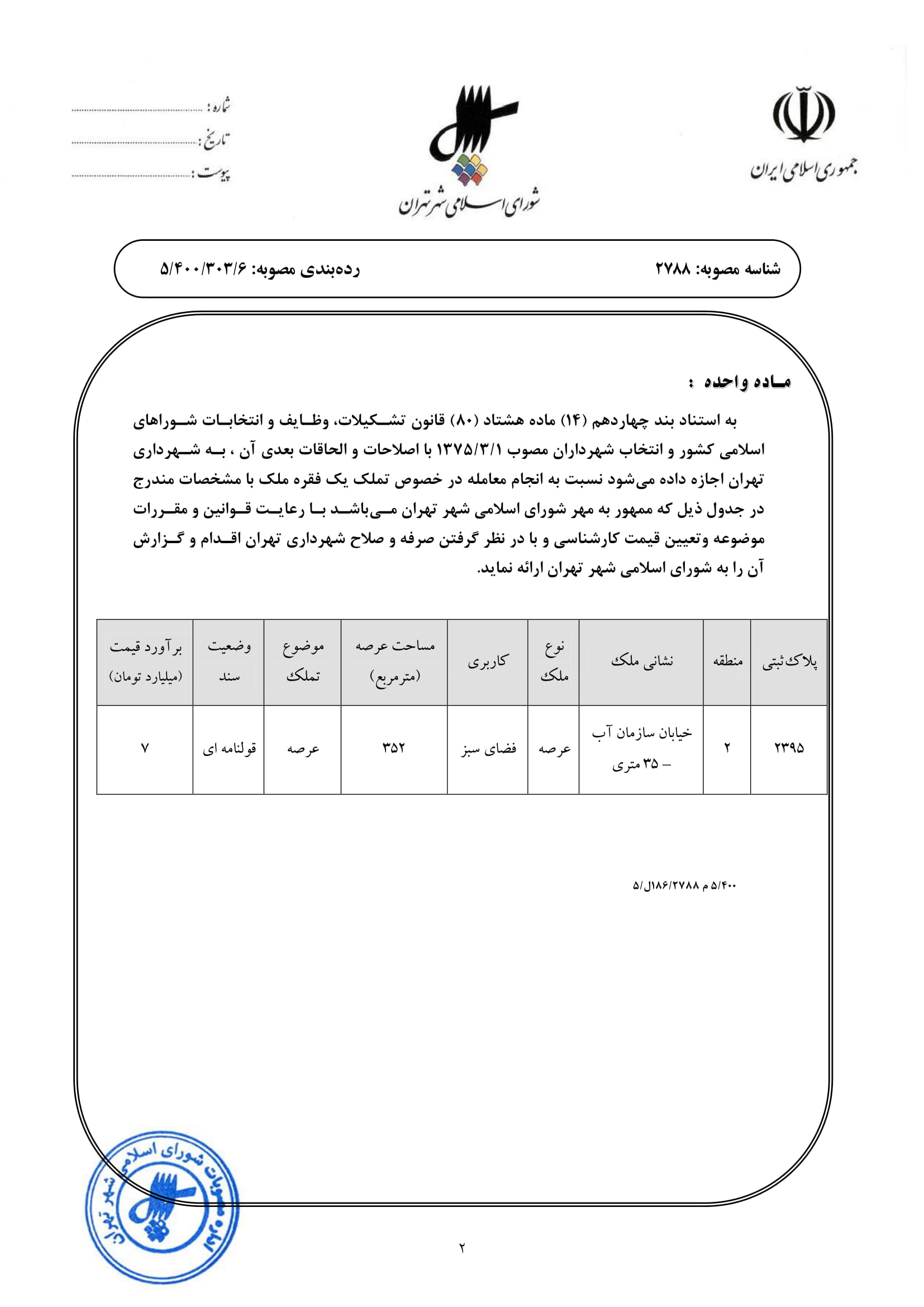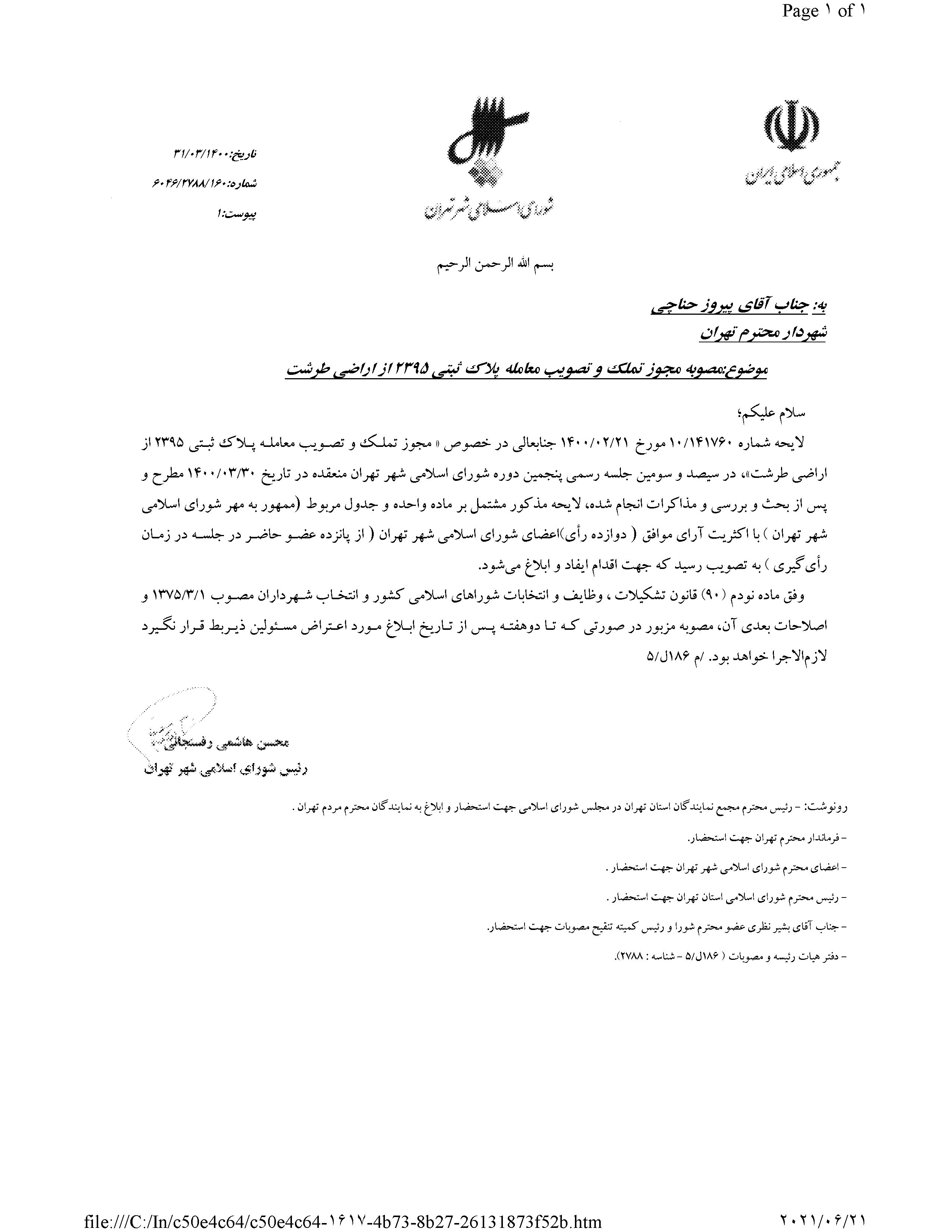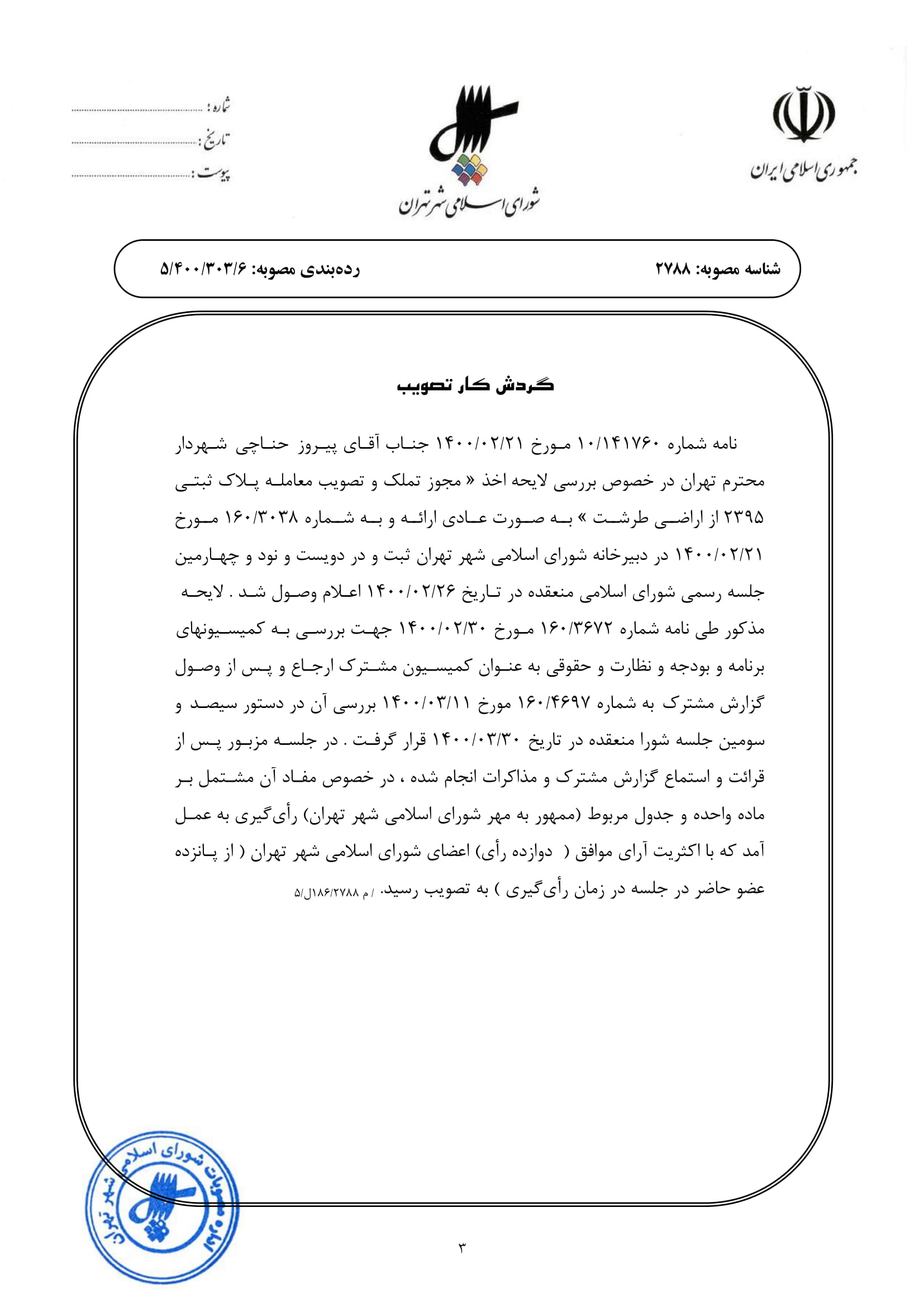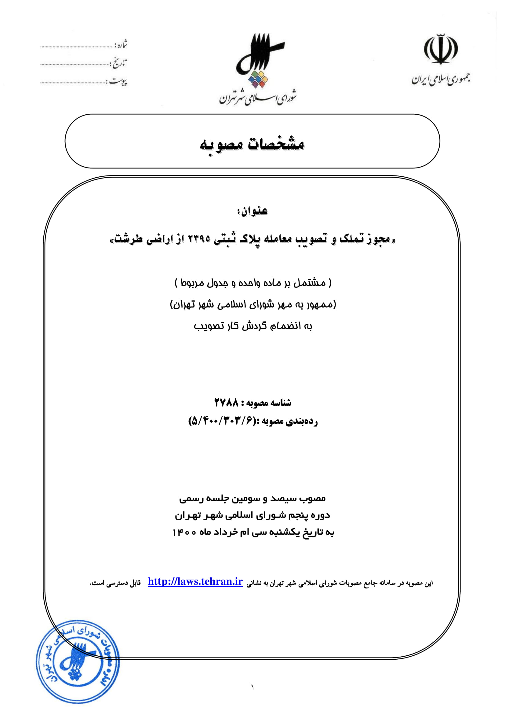 مجوز تملك و تصويب معامله پلاك ثبتي 2395 از اراضي طرشت