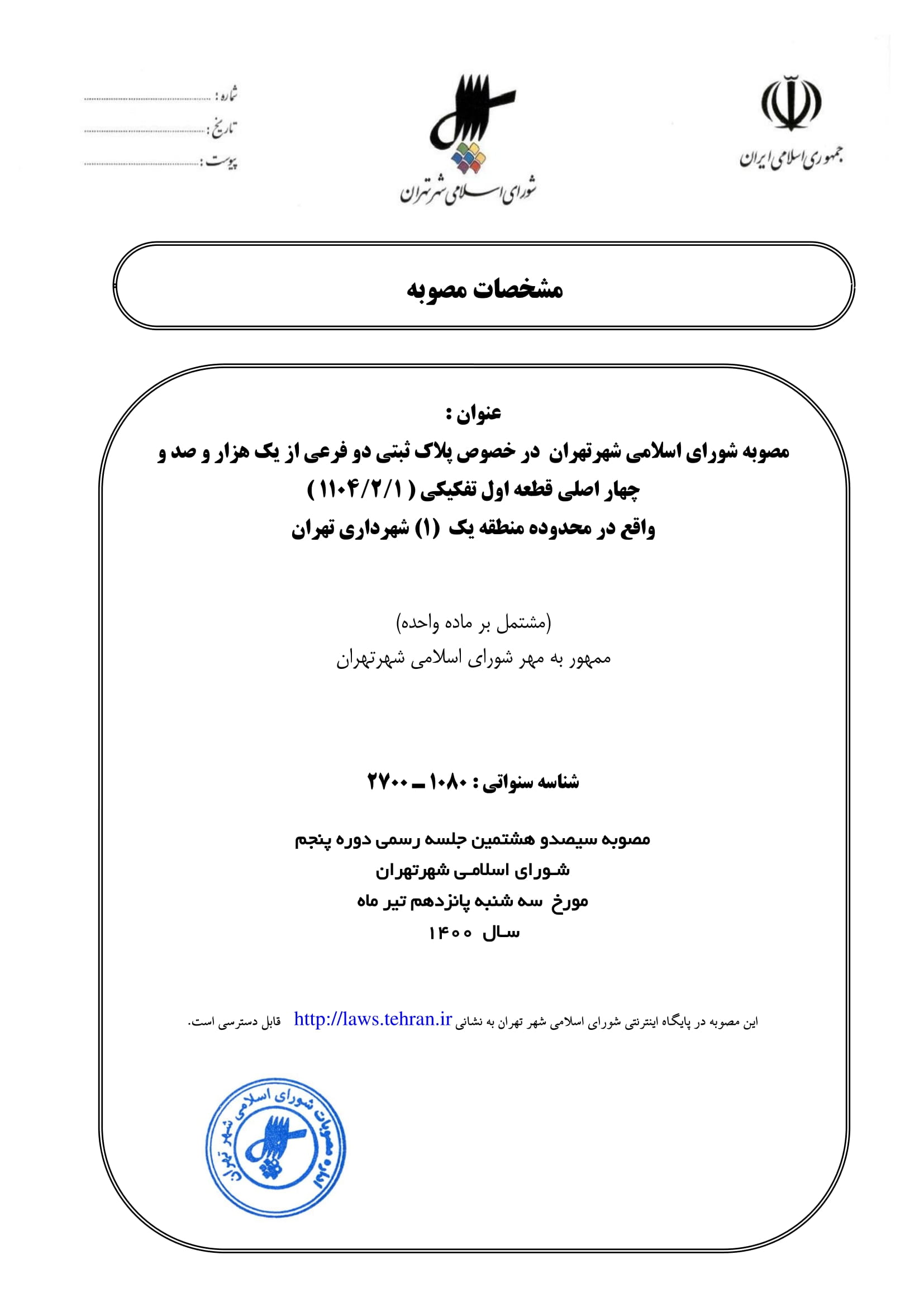 مصوبه شوراي اسلامي شهر تهران در خصوص پلاك ثبتي دو فرعي از يك هزار و صد و چهار اصلي قطعه اول تفكيكي (1104/2/1) واقع در محدوده منطقه يك (1) شهرداري تهران