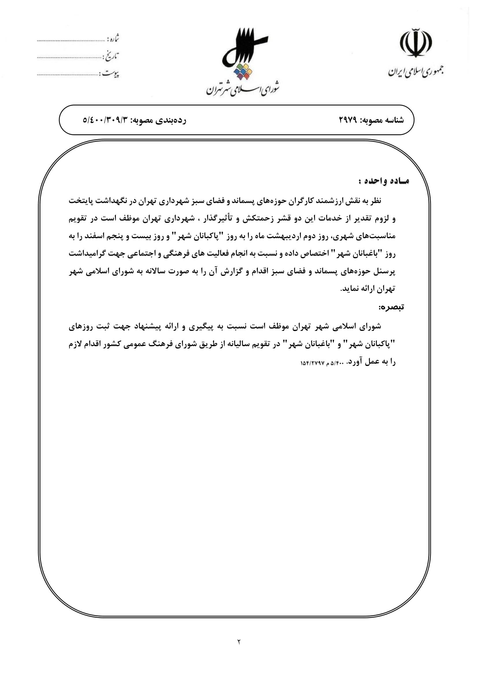 الزام شهرداري تهران به تعيين روز پاكبان و روز باغبان در تقويم شهرداري تهران