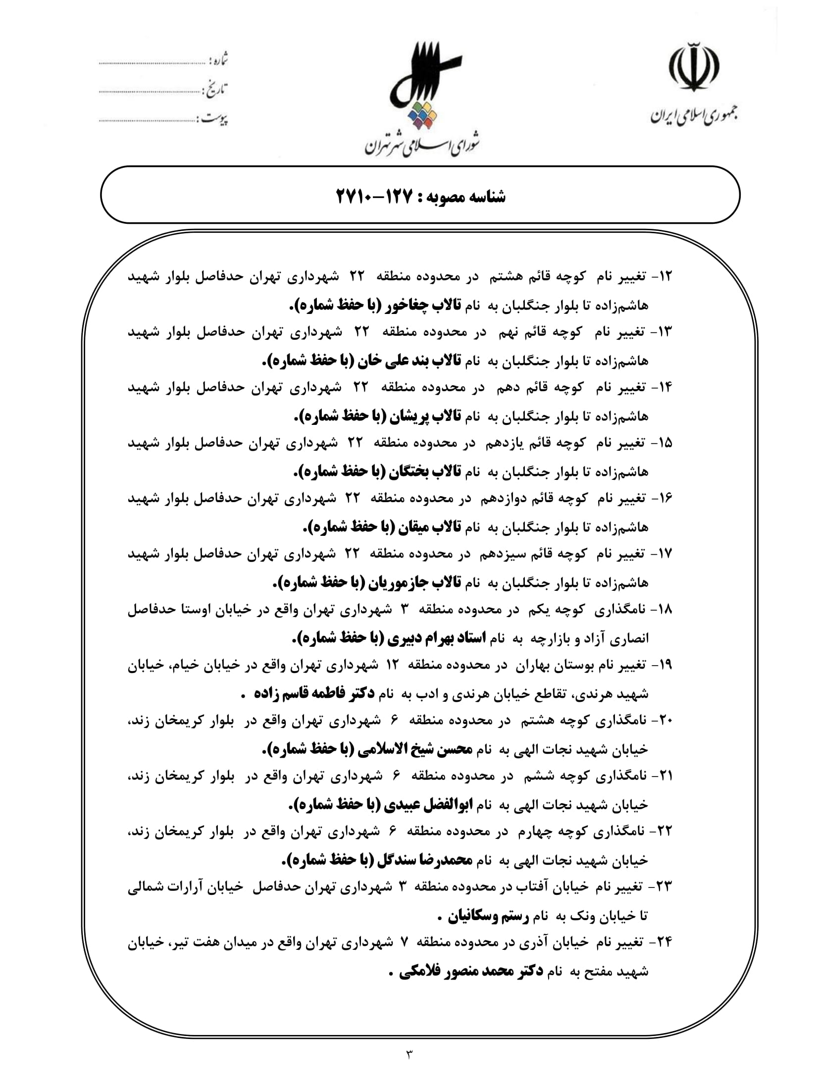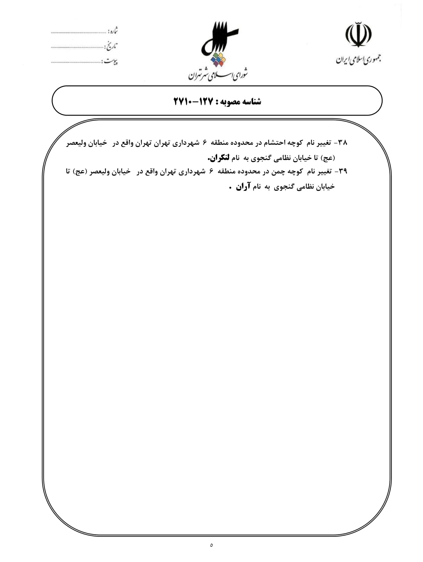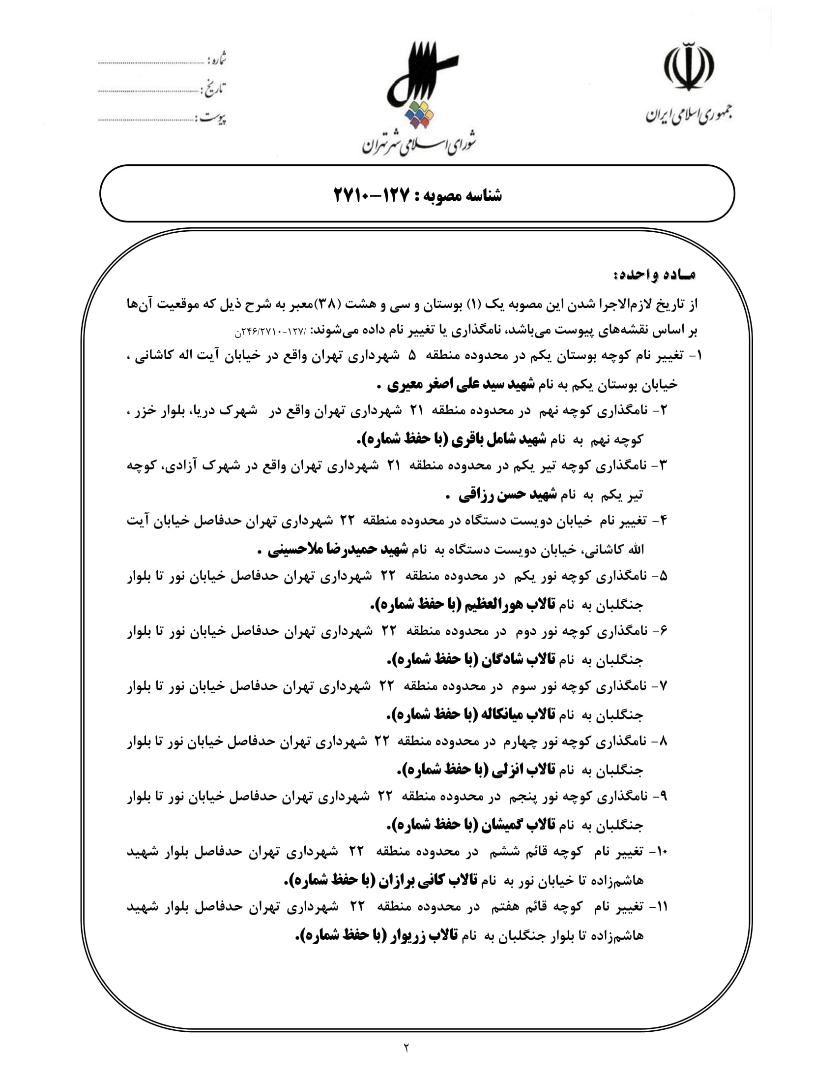 نامگذاري و تغيير نام يك (1) بوستان و سي و هشت (38) معبر عمومي شهر تهران