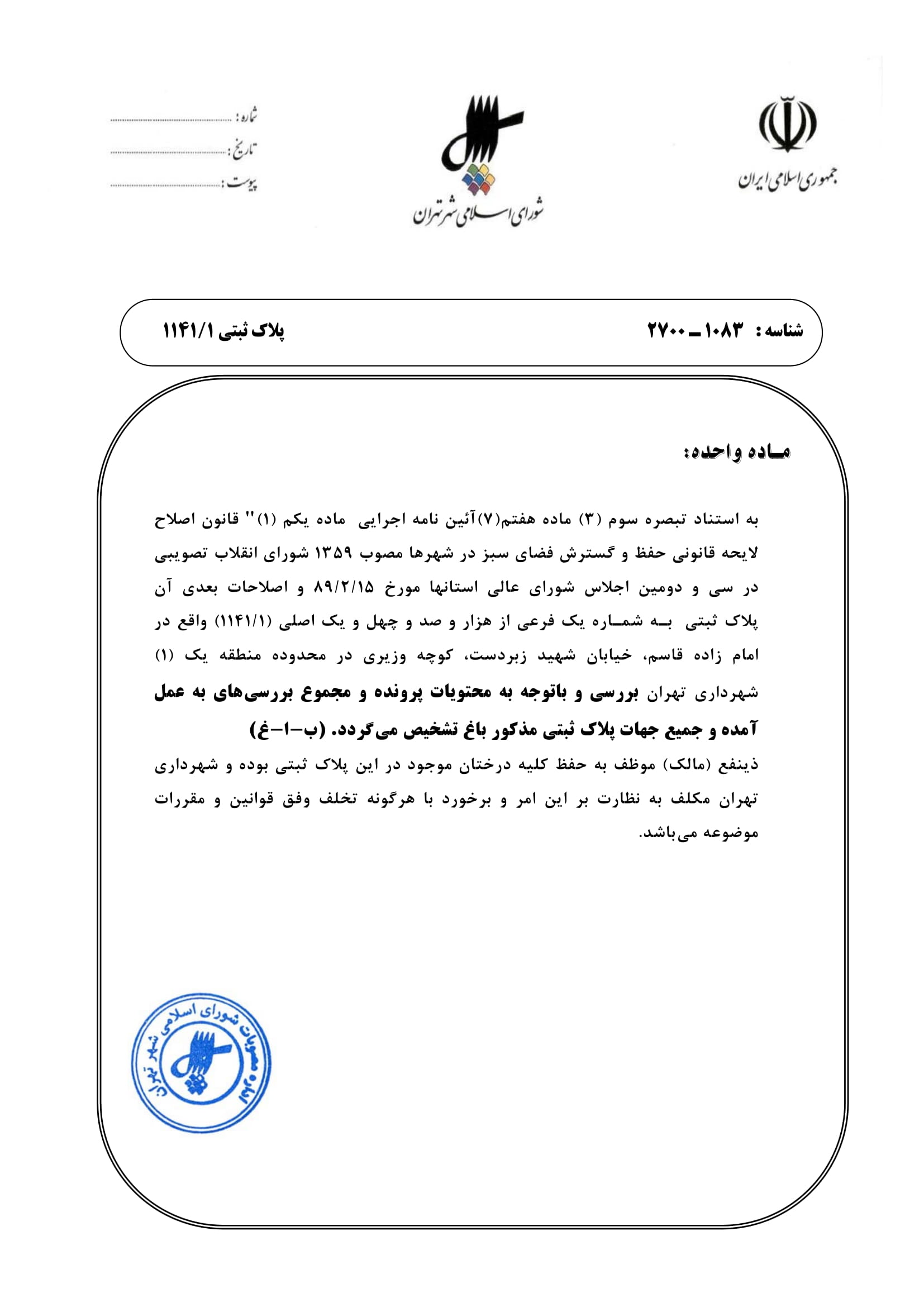 مصوبه شوراي اسلامي شهر تهران در خصوص پلاك ثبتي به شماره يك فرعي از هزار و صد و چهل و يك اصلي (1141/1) واقع در محدوده منطقه يك (1) شهرداري تهران