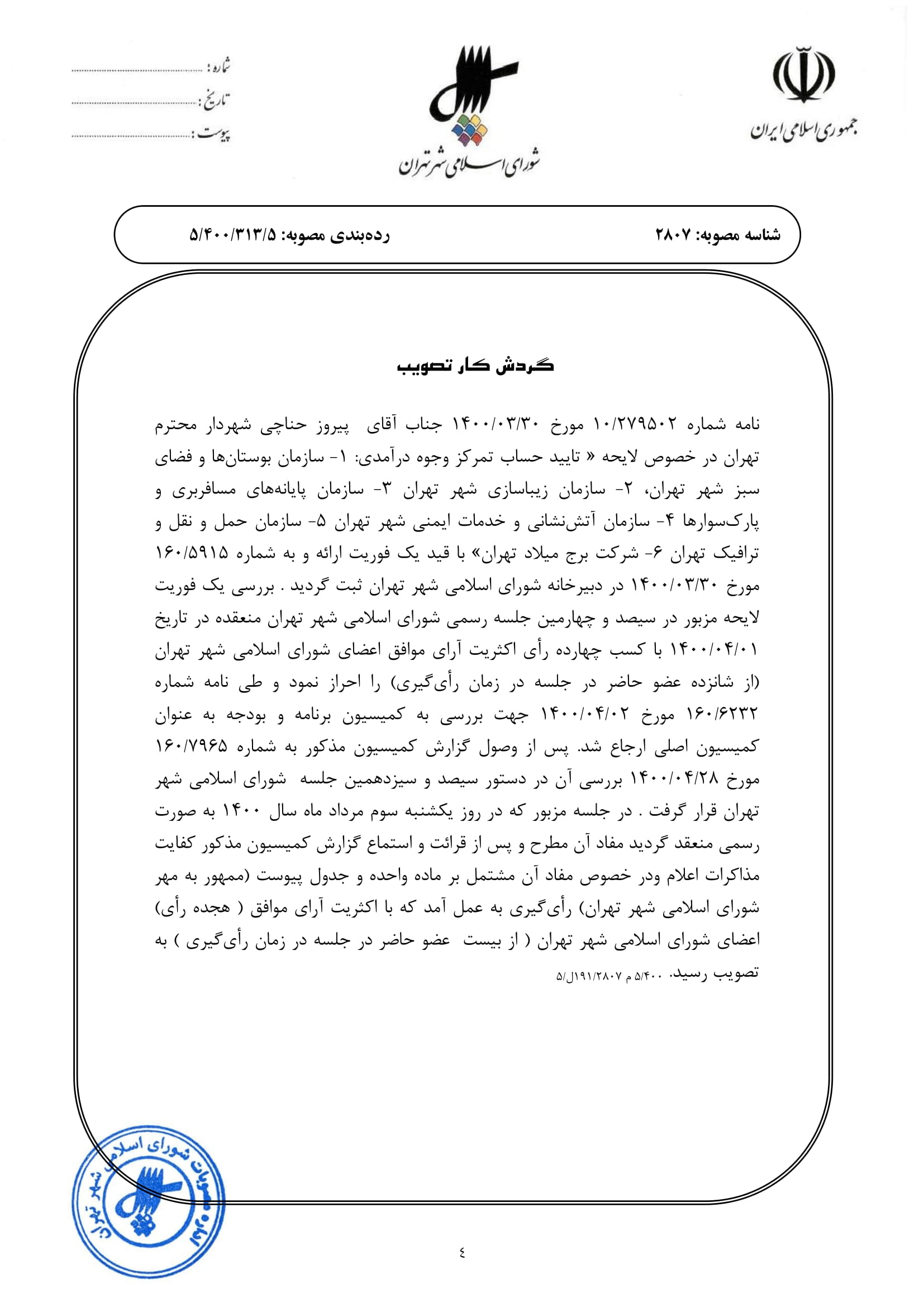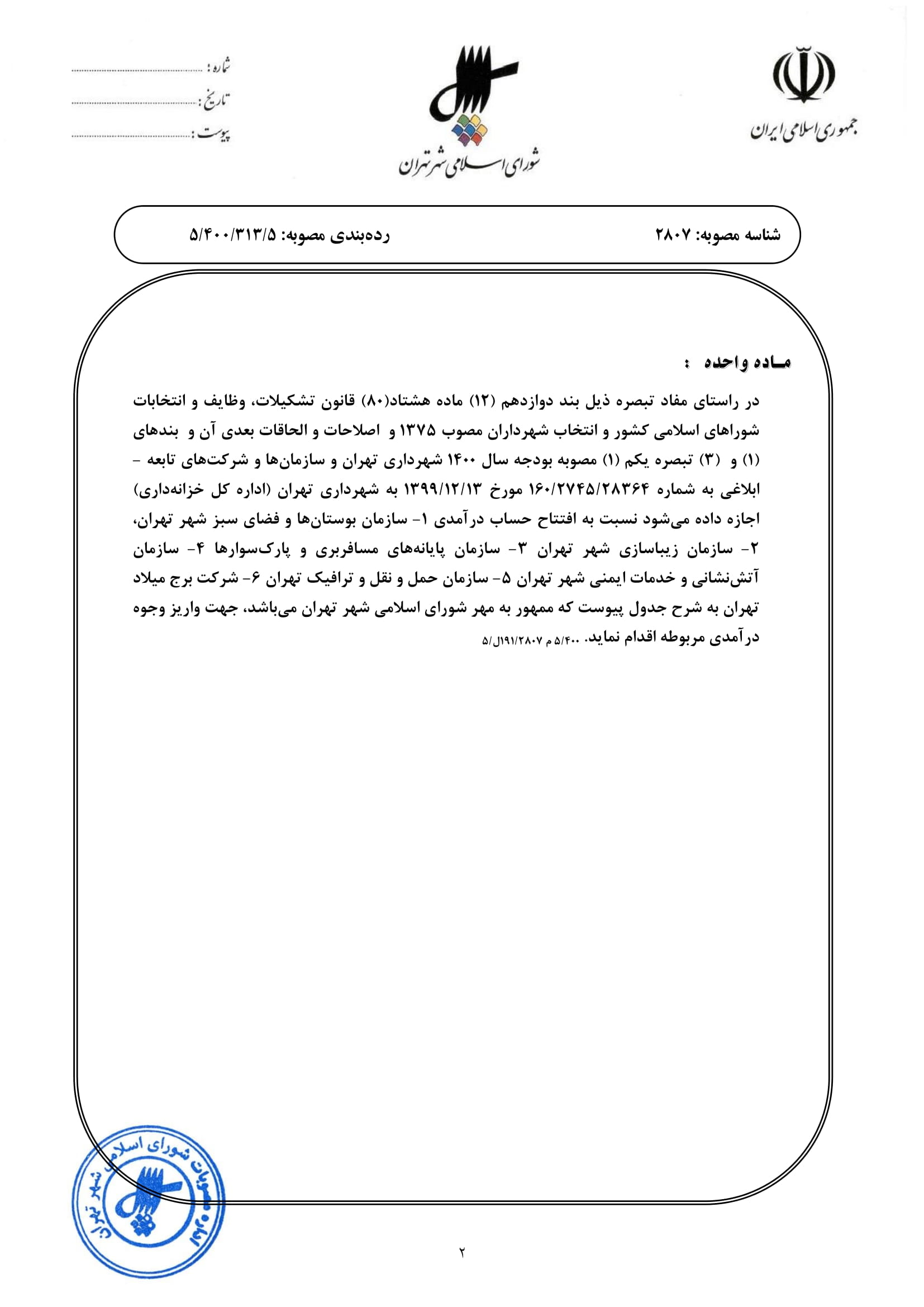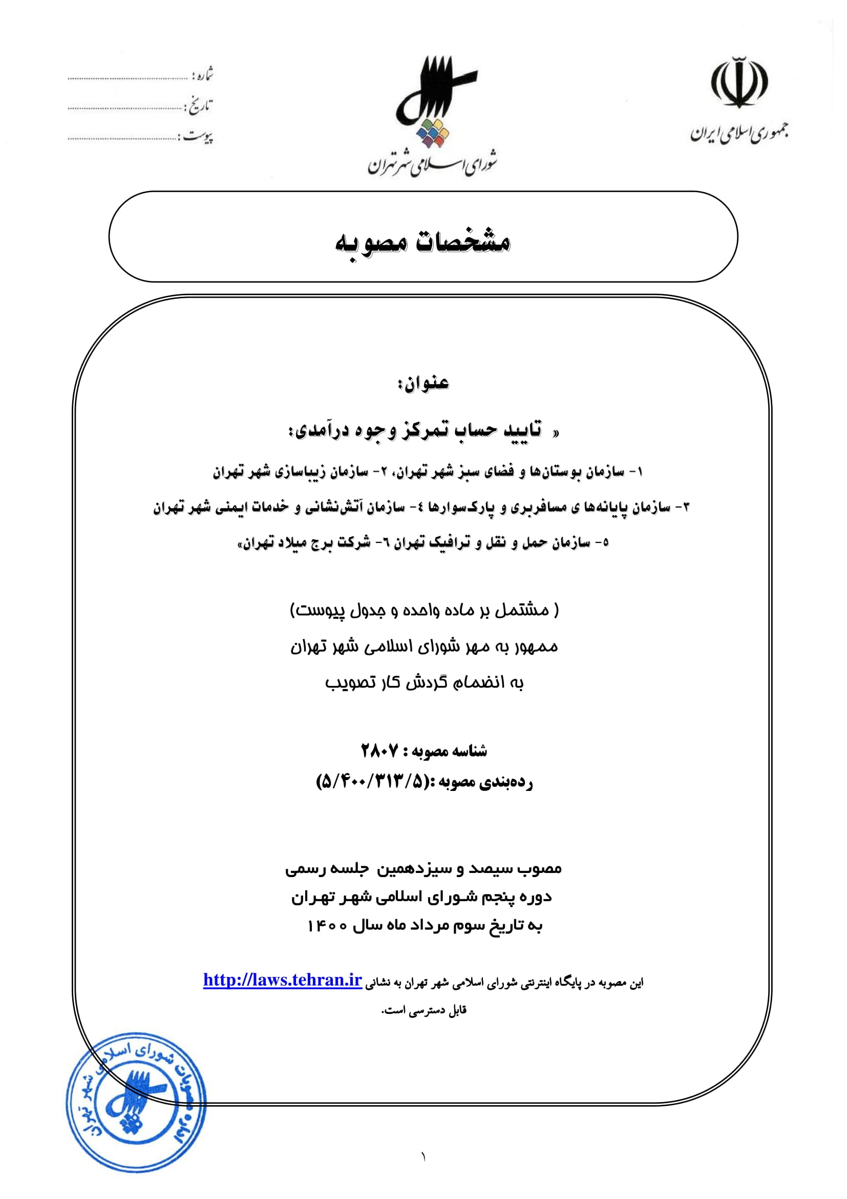 تاييد حساب تمركز وجوه درآمدي: 1- سازمان بوستان‌ها و فضاي سبز شهر تهران، 2- سازمان زيباسازي شهر تهران 3- سازمان پايانه‌هاي مسافربري و پارك‌سوارها 4- سازمان آتش‌نشاني و خدمات ايمني شهر تهران 5- سازمان حمل و نقل و ترافيك تهران 6- شركت برج ميلاد تهران