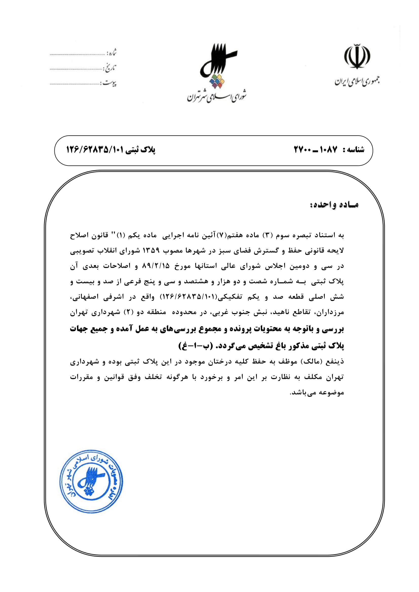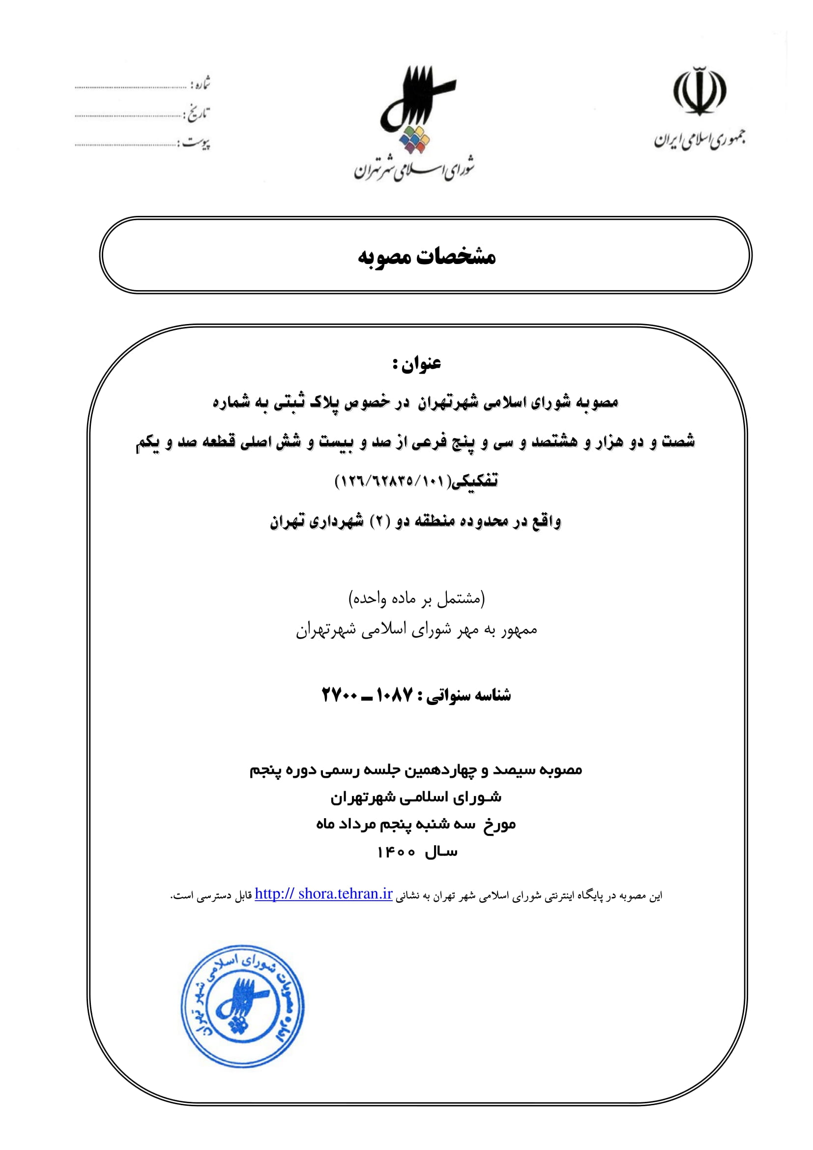 مصوبه شوراي اسلامي شهر تهران در خصوص پلاك ثبتي به شماره شصت و دو هزار و هشتصد و سي و پنج فرعي از صد و بيست و شش اصلي قطعه صد و يكم تفكيكي (126/62835/101) واقع در محدوده منطقه دو (2) شهرداري تهران