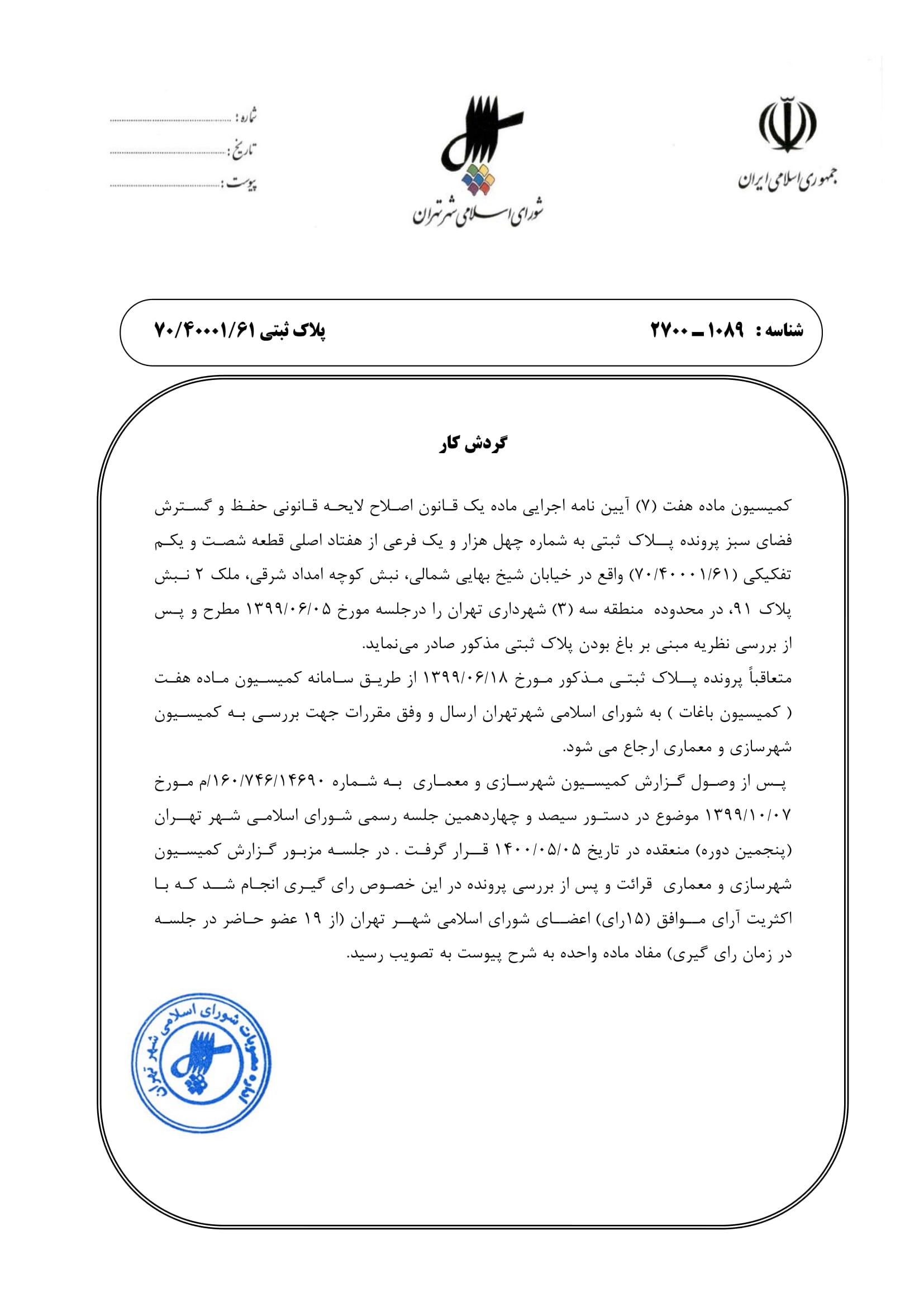 مصوبه شوراي اسلامي شهر تهران در خصوص پلاك ثبتي به شماره چهل هزار و يك فرعي از هفتاد اصلي قطعه شصت و يكم تفكيكي (70/40001/61) واقع در محدوده منطقه سه (3) شهرداري تهران