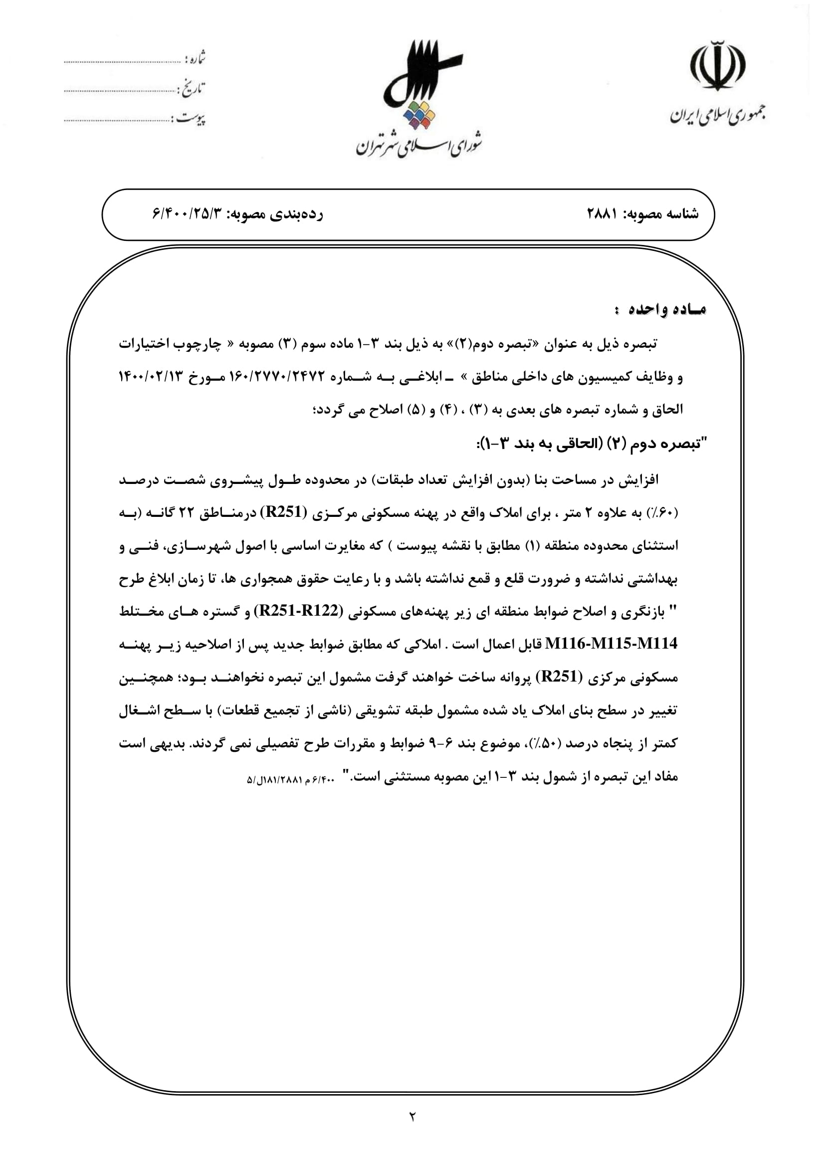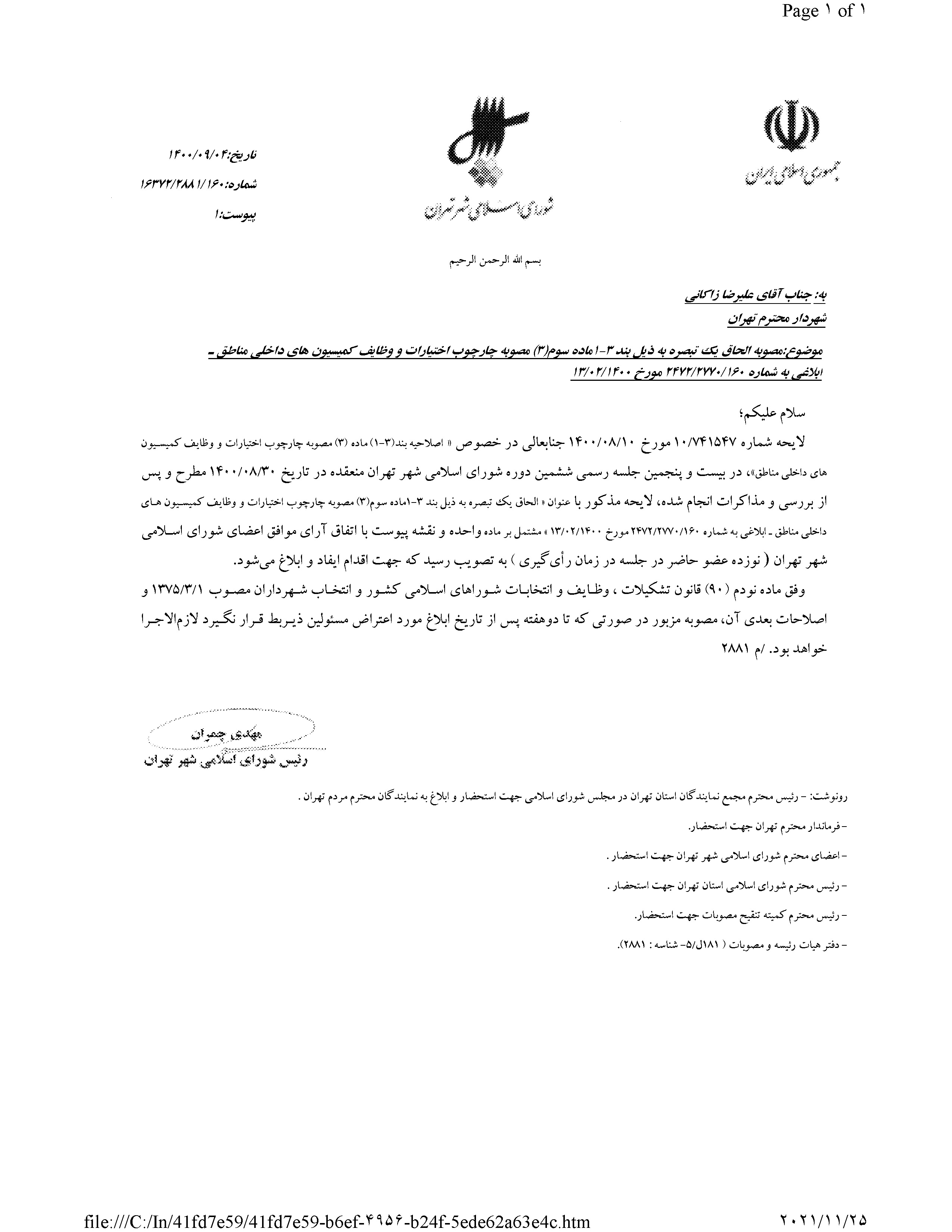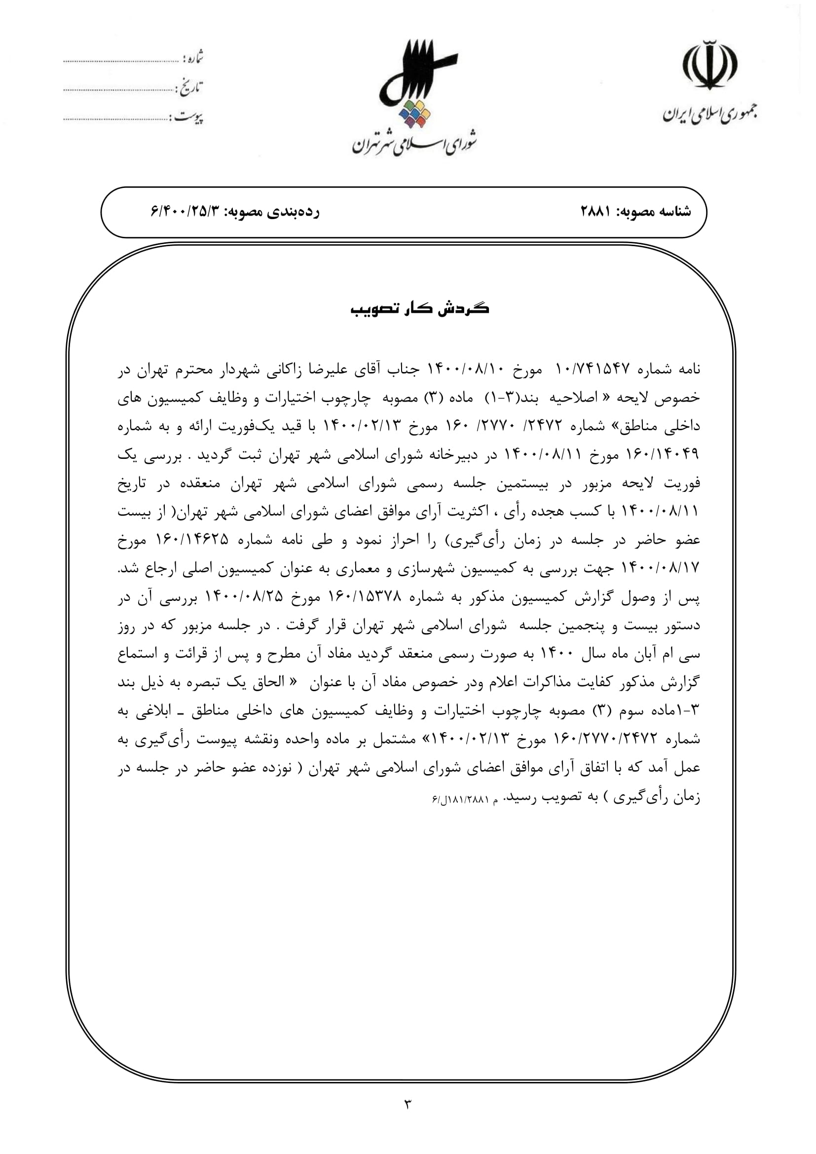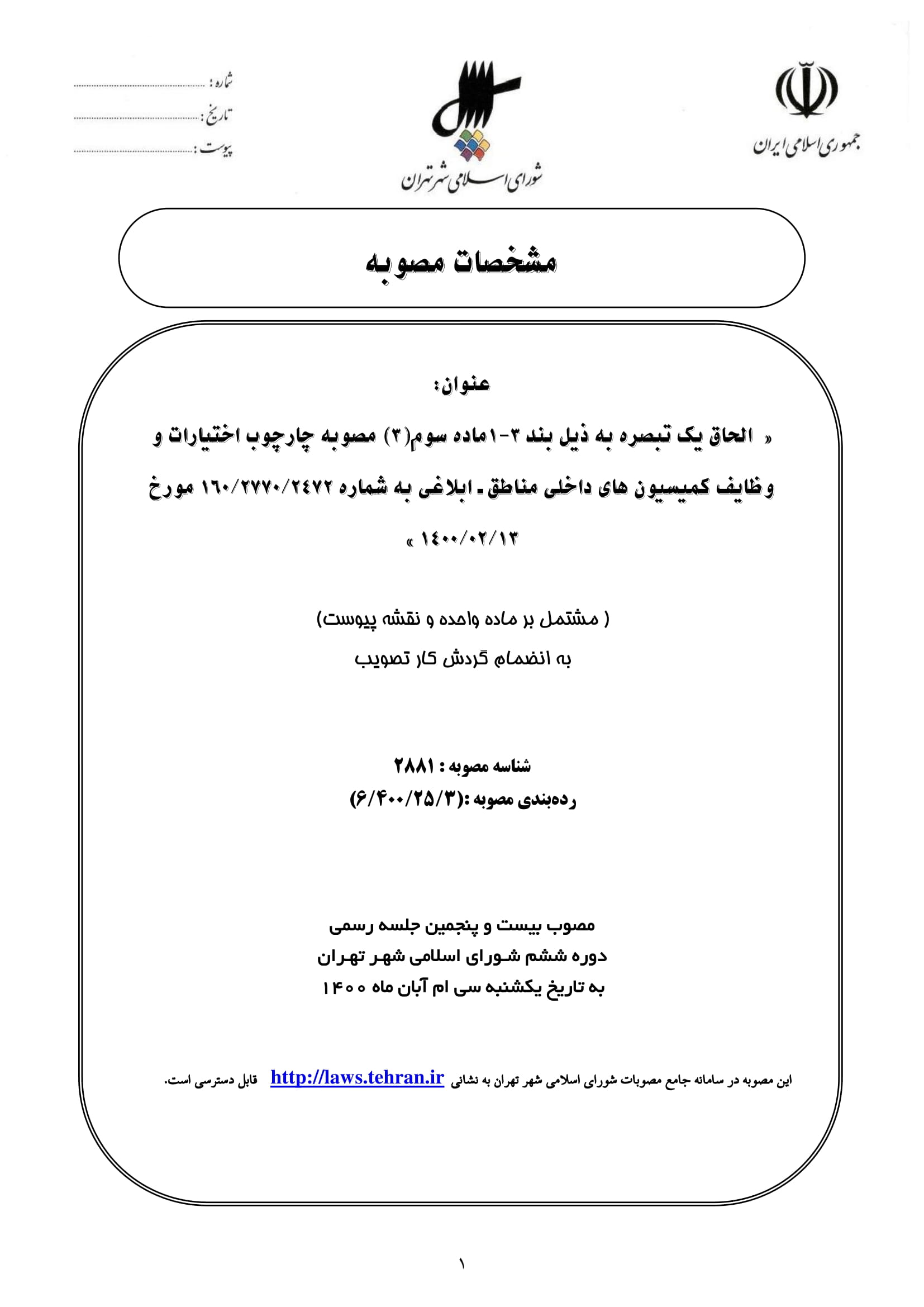 الحاق يك تبصره به ذيل بند 3-1 ماده سوم (3) مصوبه چارچوب اختيارات و وظايف كميسيونهاي داخلي مناطق- ابلاغي به شماره 160/2770/2472 مورخ 1400/02/13