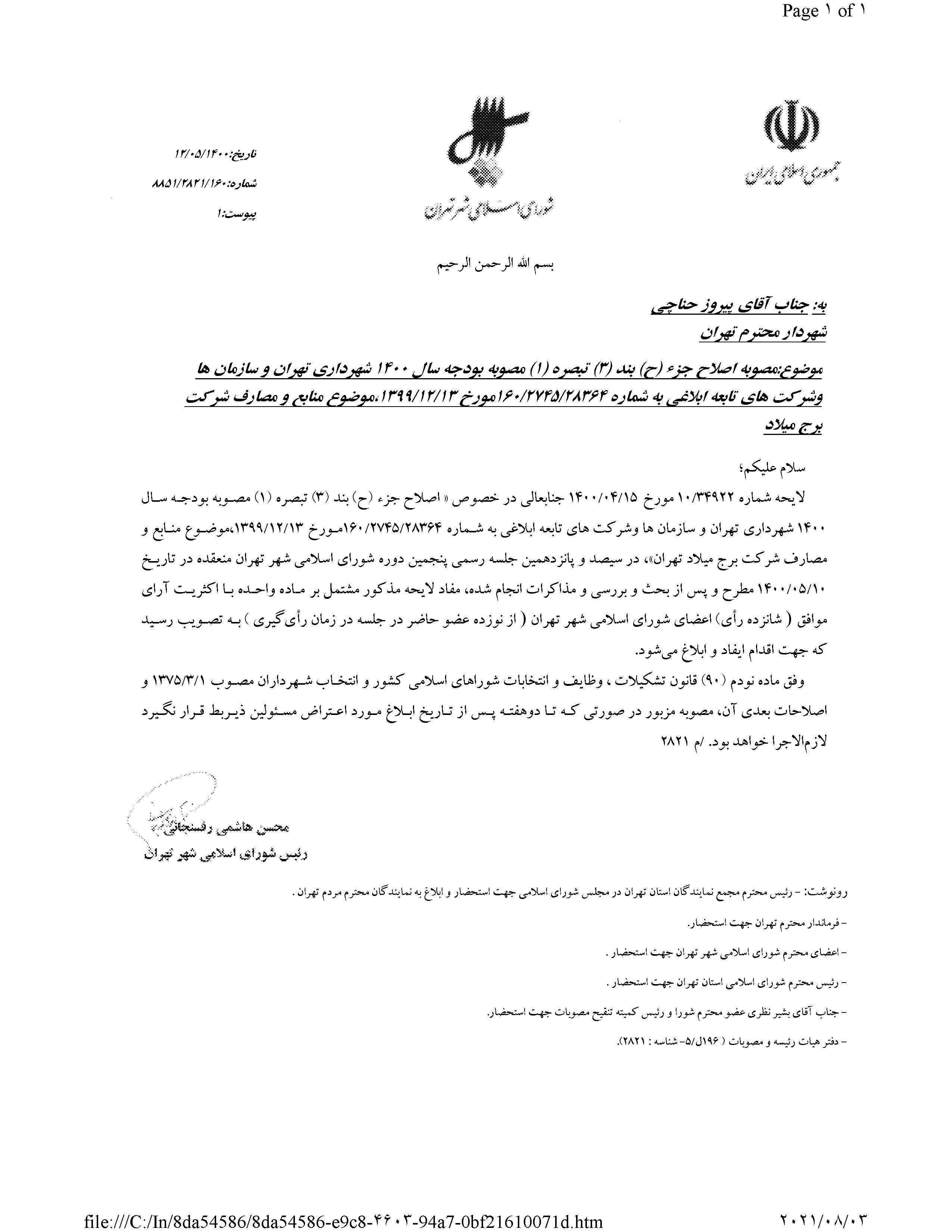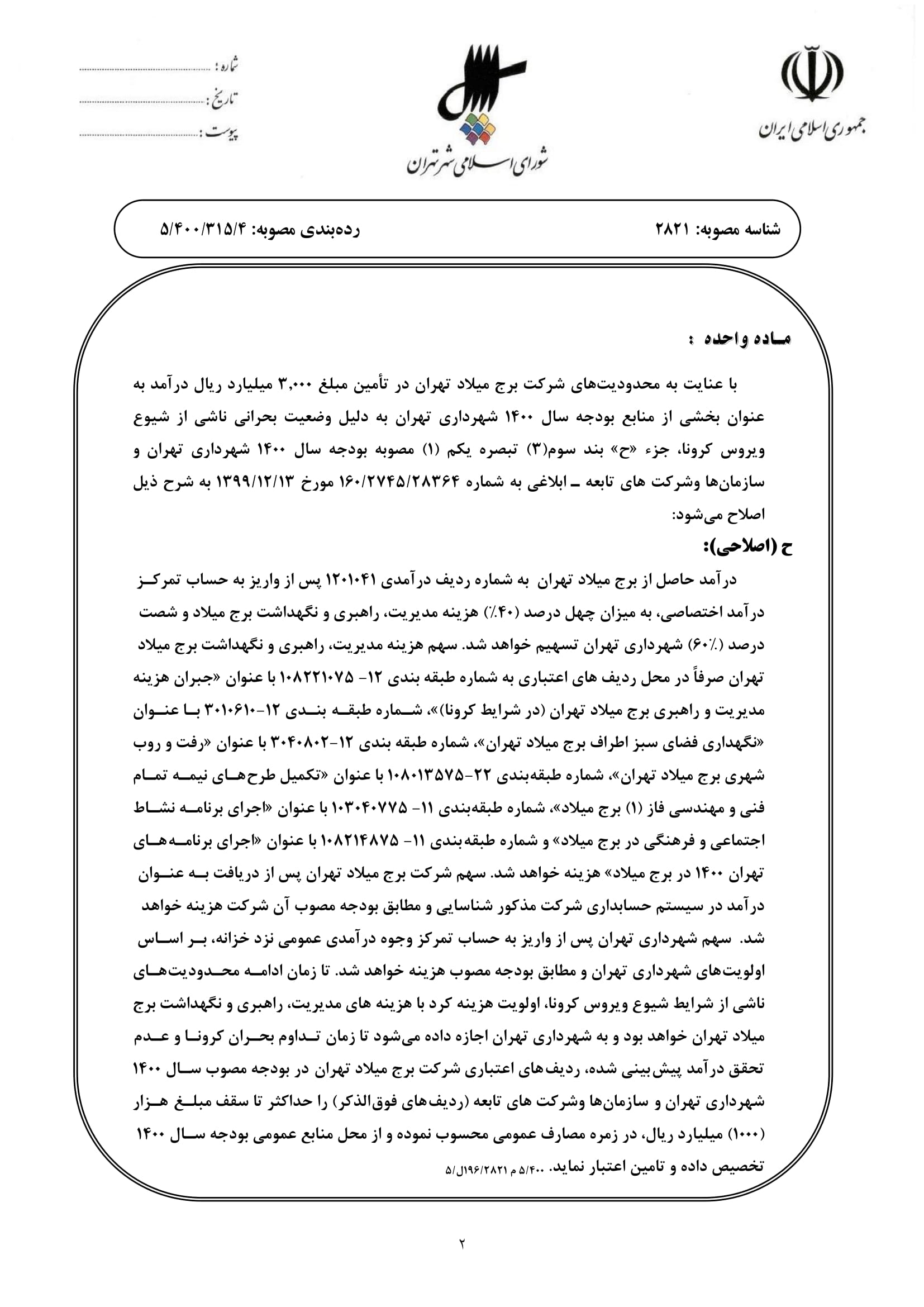 اصلاح جزء (ح) بند سوم (3) تبصره يكم (1) مصوبه بودجه سال 1400 شهرداري تهران و سازمانها و شركتهاي تابعه ابلاغي به شماره 160/2745/28364 مورخ 1399/12/13، موضوع منابع و مصارف شركت برج ميلاد تهران