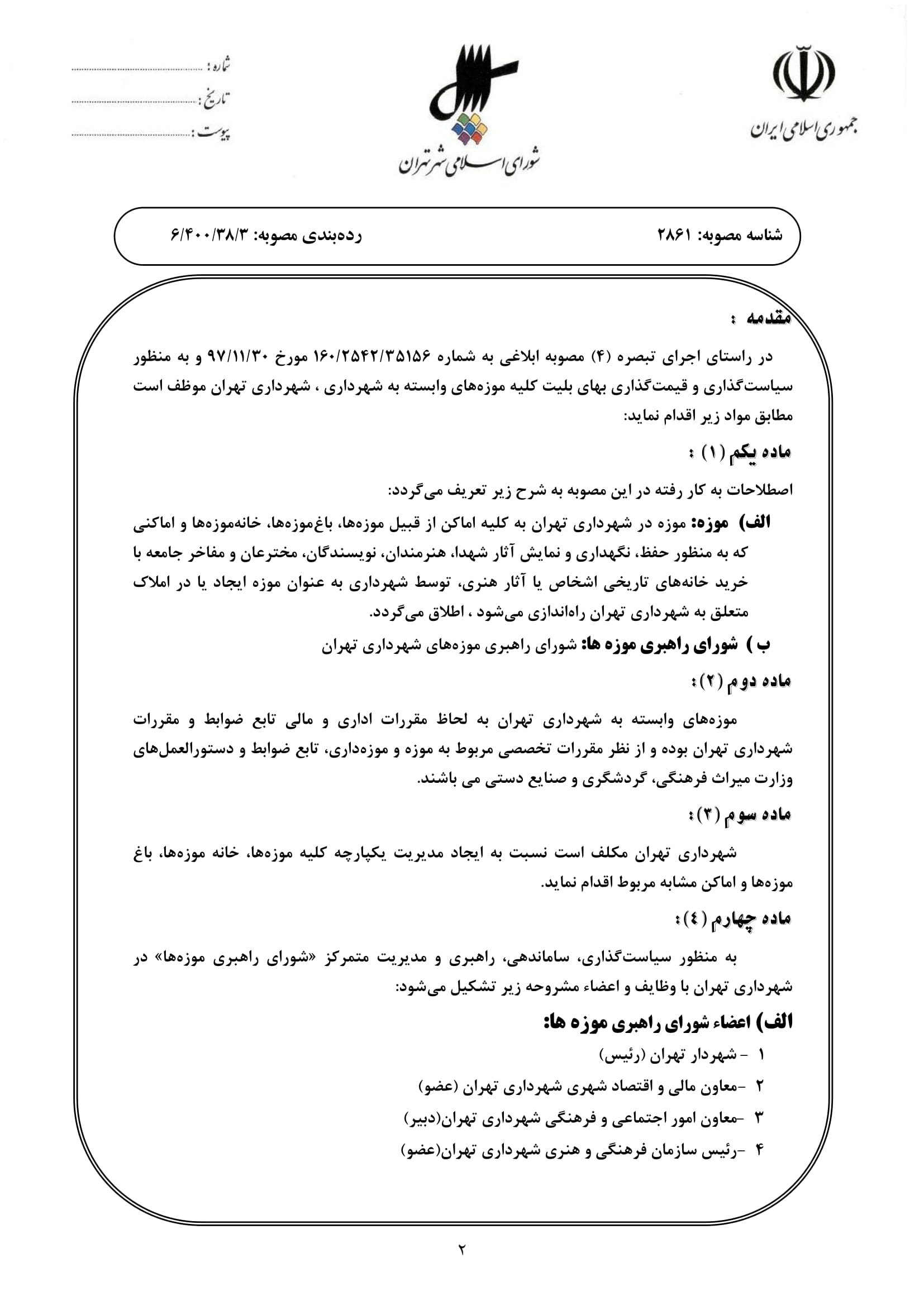 بهاي خدمات استفاده از مراكز فرهنگي - موزههاي تحت مالكيت شهرداري تهران