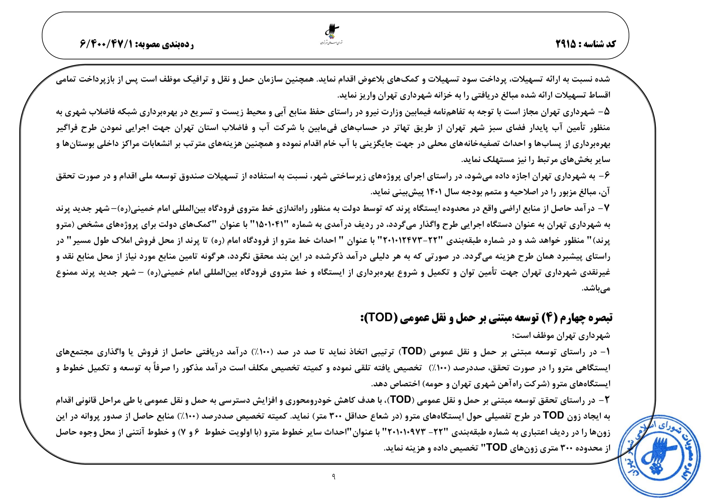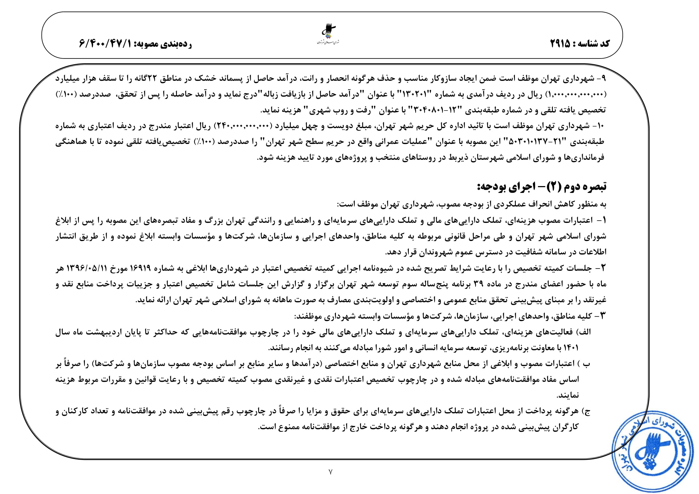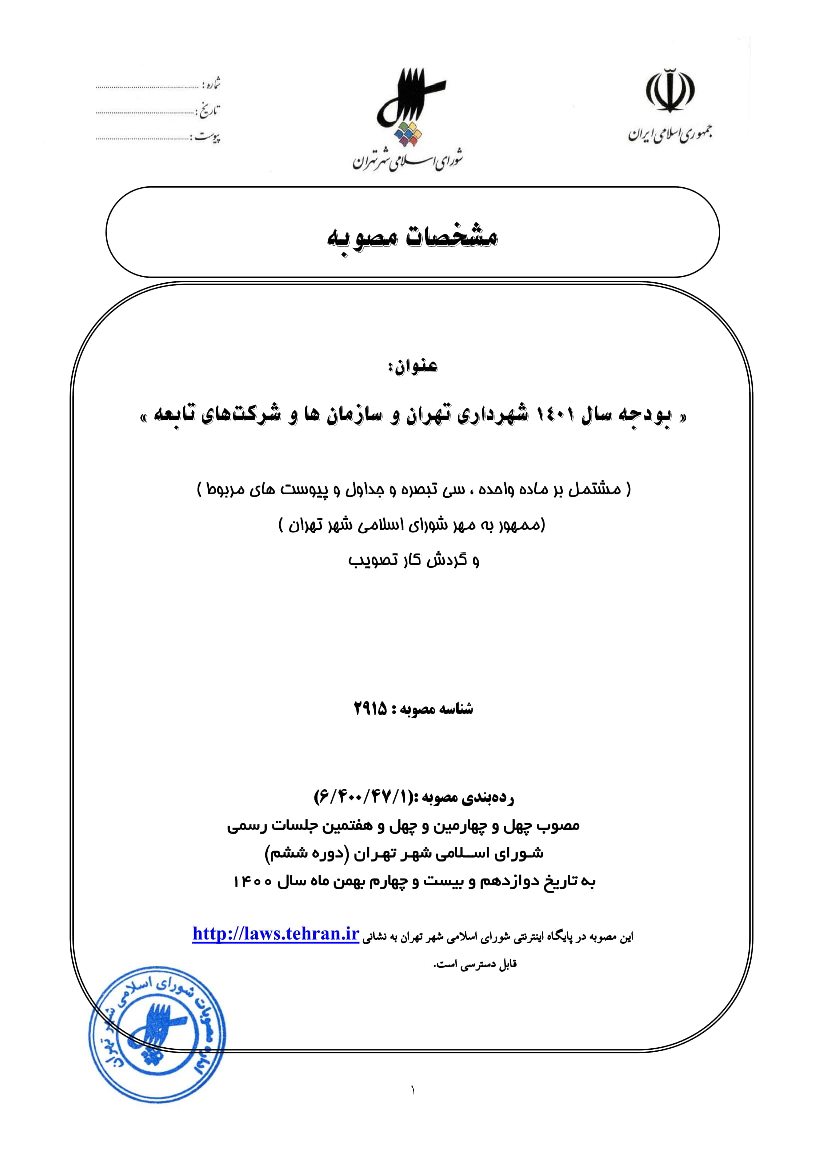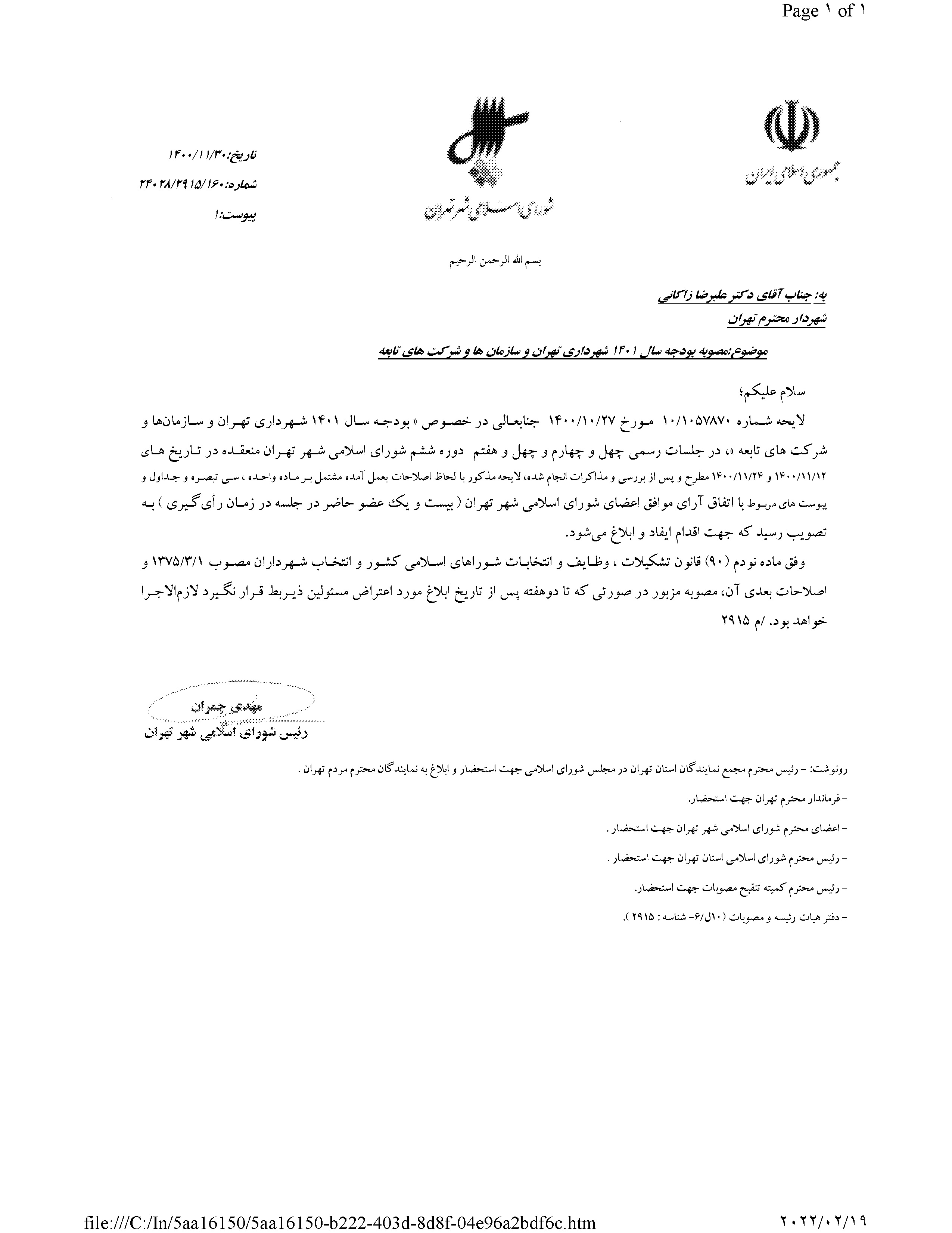 بودجه سال 1401 شهرداري تهران و سازمان‌ها و شركت‌هاي تابعه