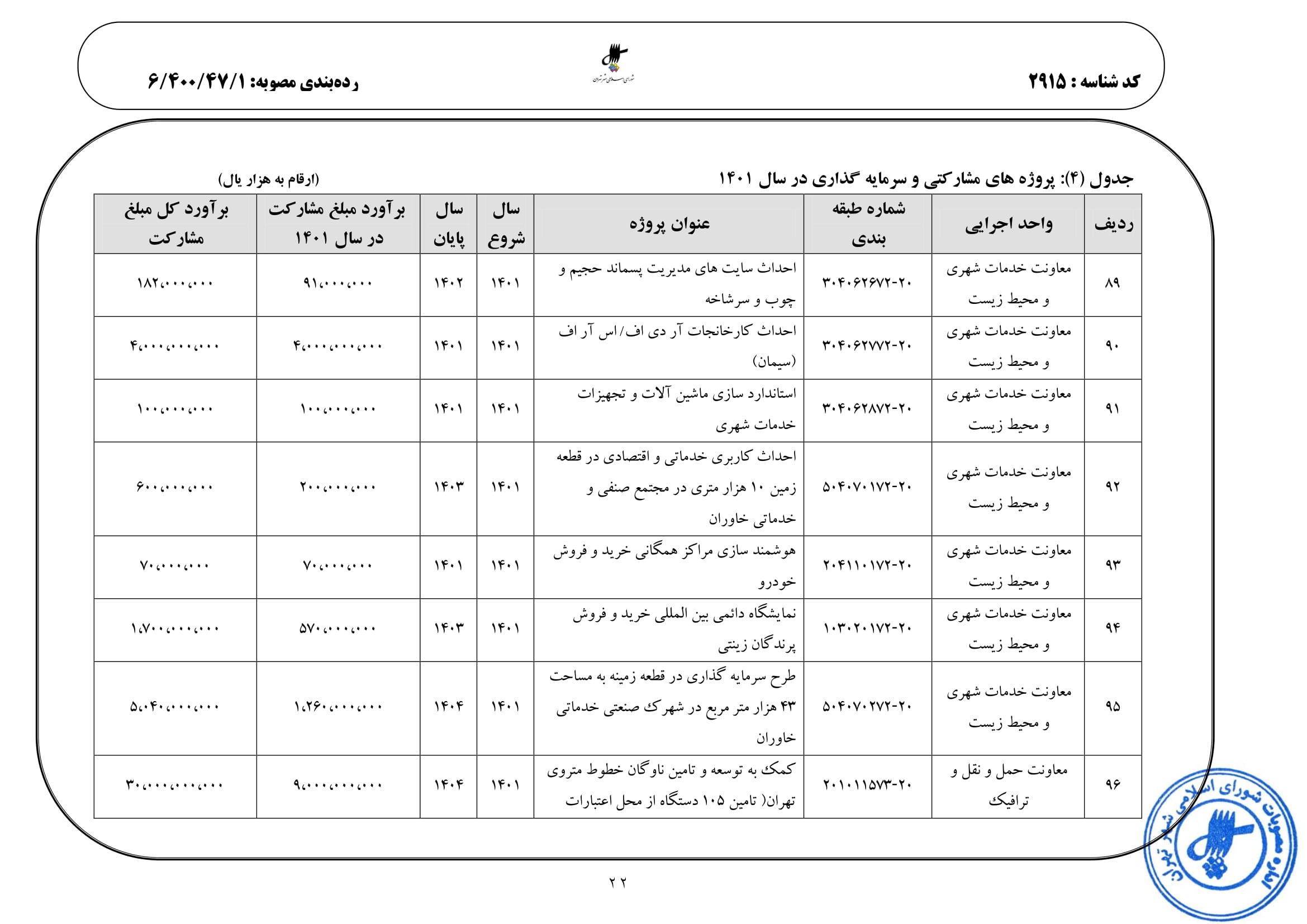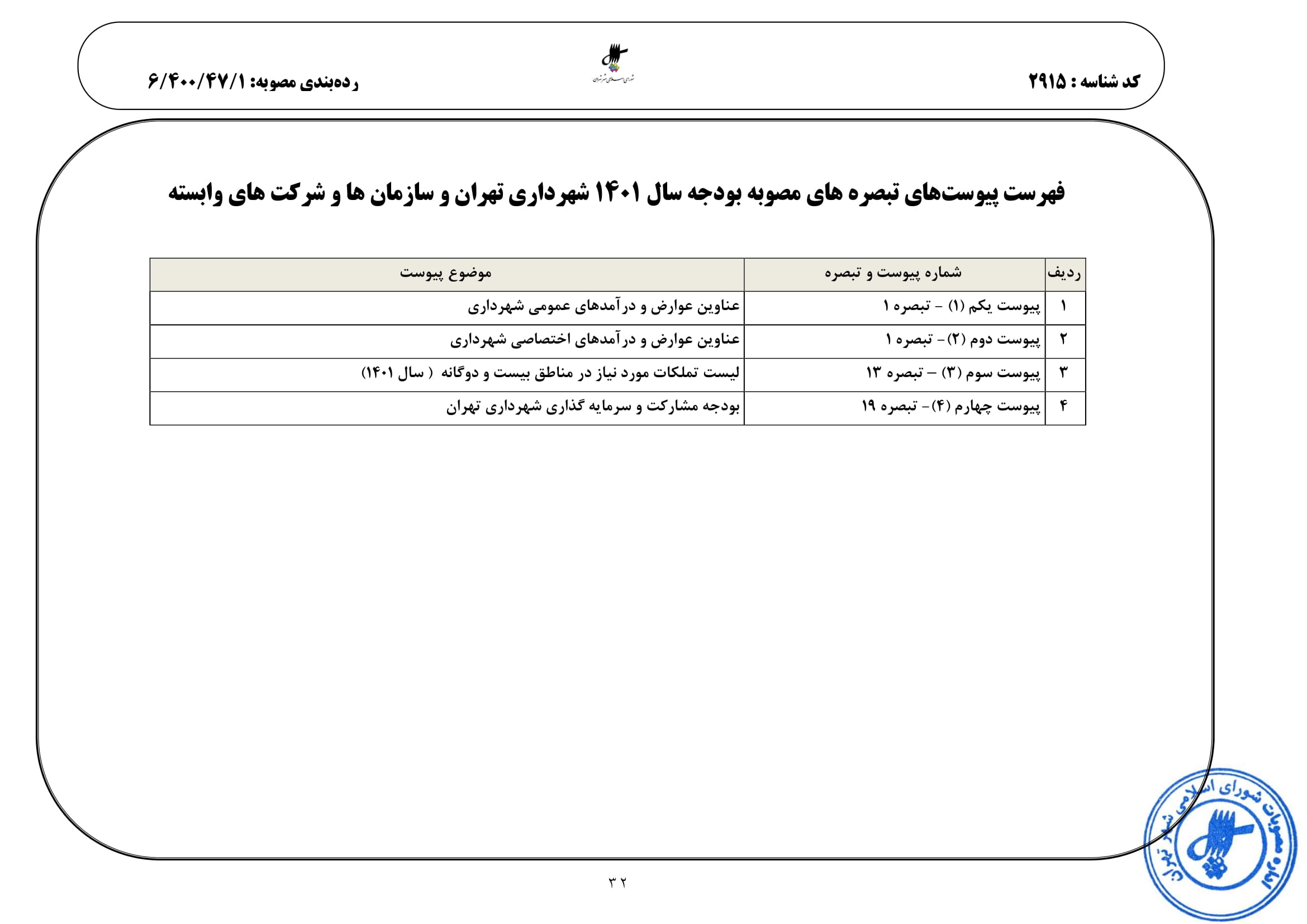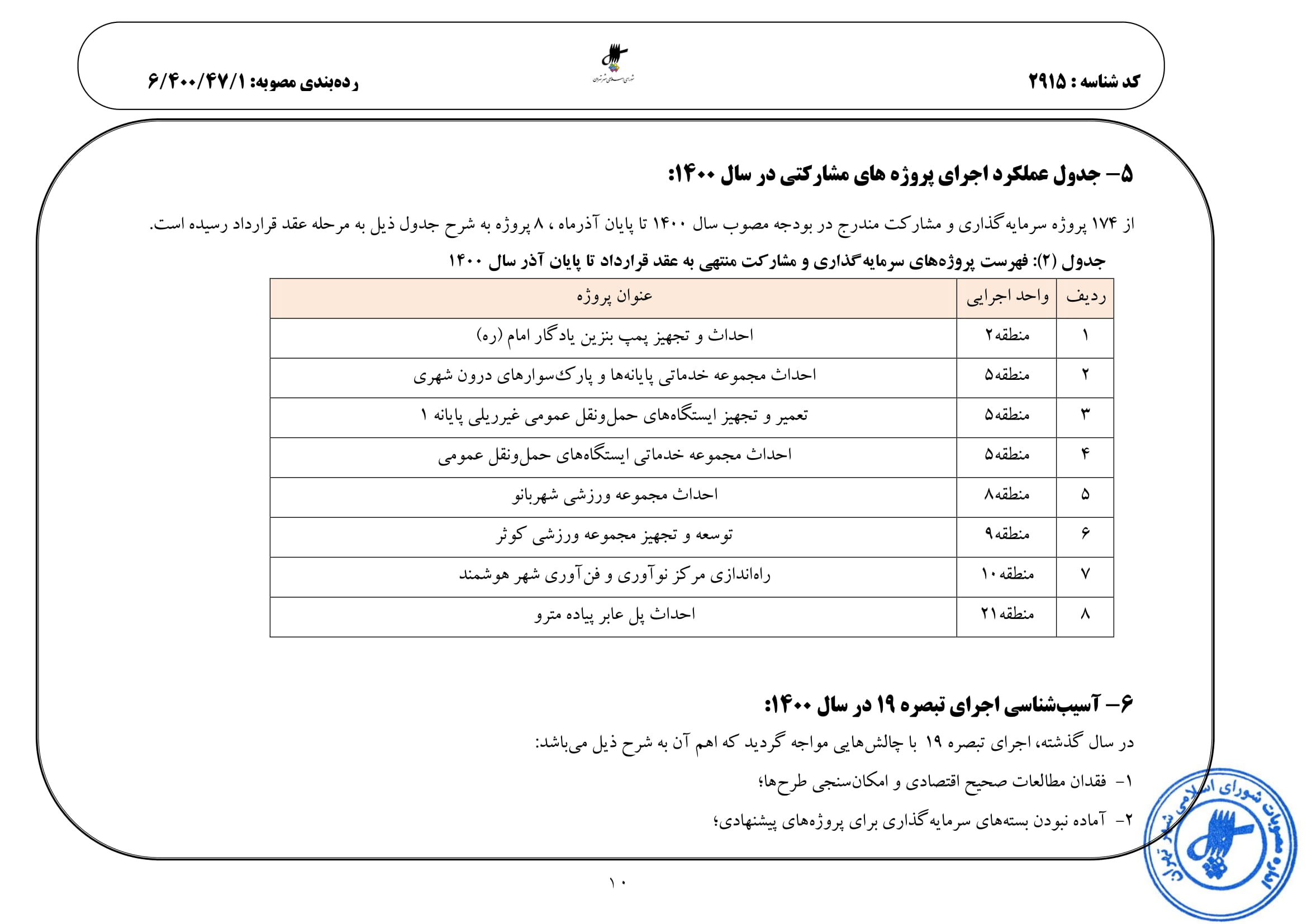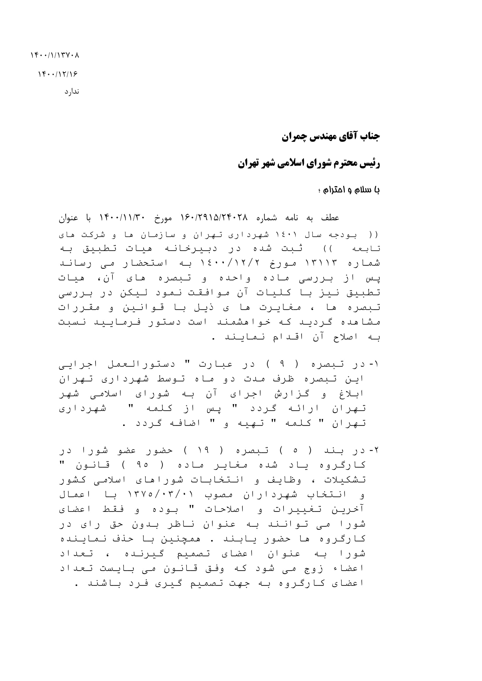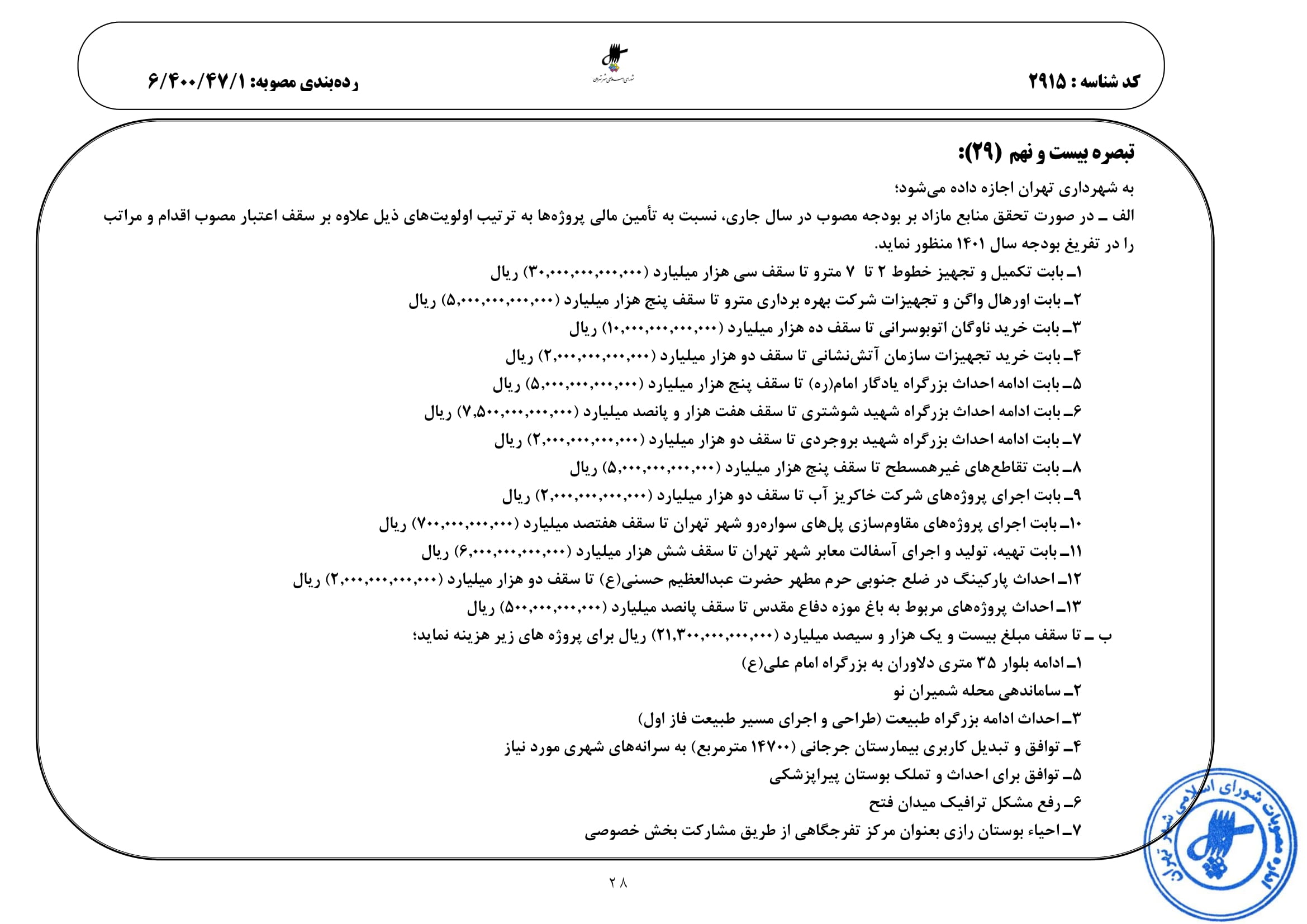 بودجه سال 1401 شهرداري تهران و سازمان‌ها و شركت‌هاي تابعه