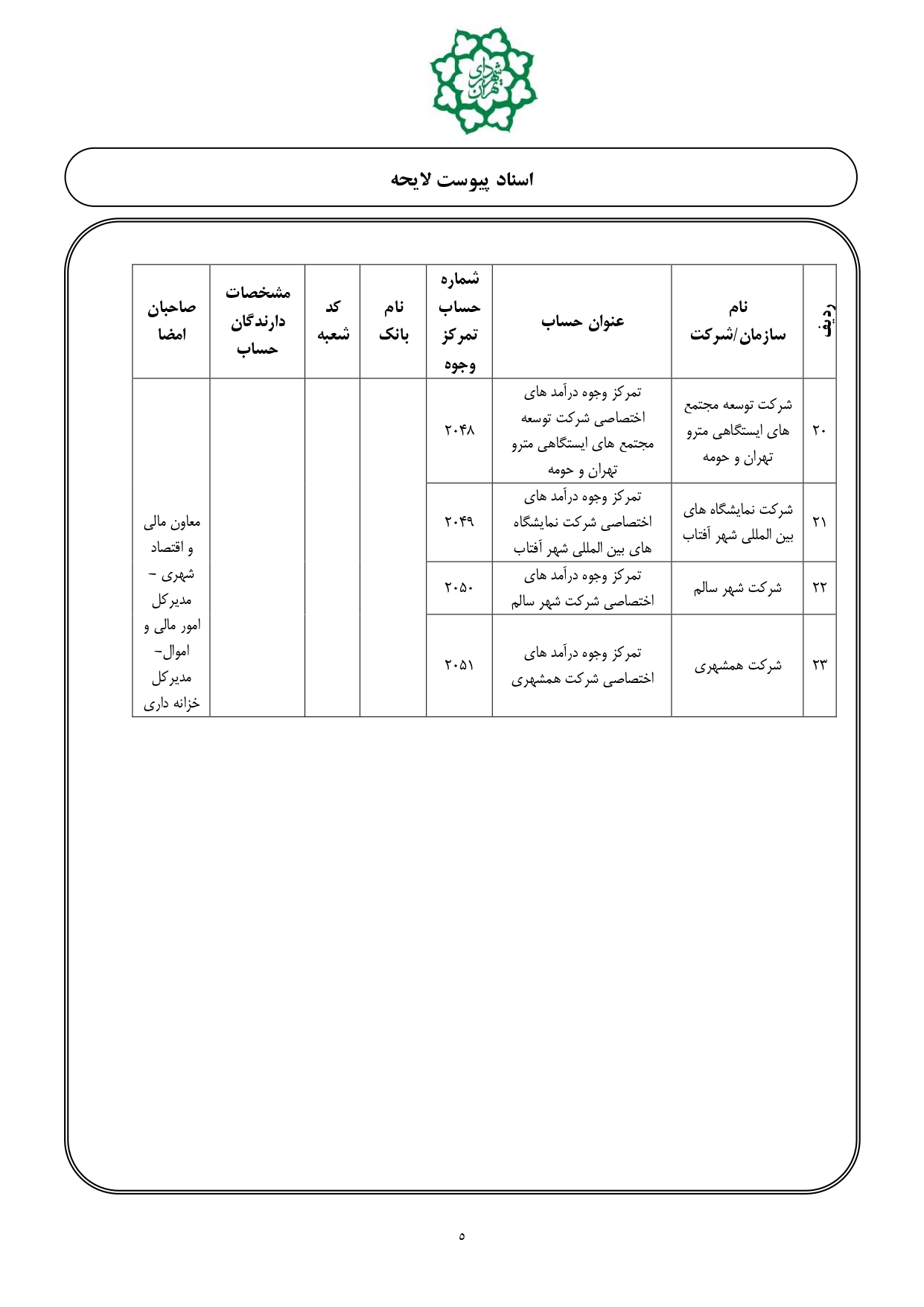 تأييد حساب تمركز وجوه درآمدي بيست و سه (23) سازمان و شركت شهرداري تهران