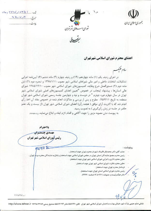 تعيين اعضاي كميسيونهاي اصلي شوراي اسلامي شهر تهران (دوره چهارم - سال چهارم)