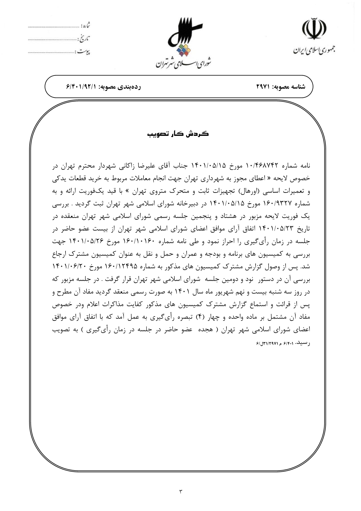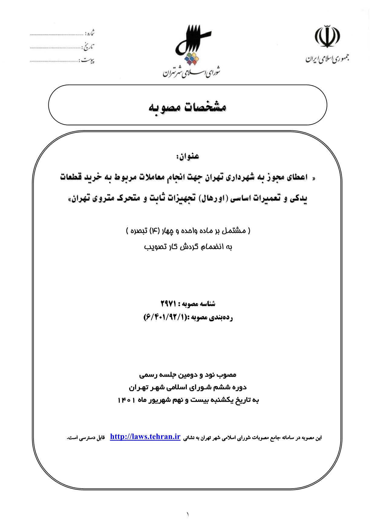 اعطاي مجوز به شهرداري تهران جهت انجام معاملات مربوط به خريد قطعات يدكي و تعميرات اساسي (اورهال) تجهيزات ثابت و متحرك متروي تهران