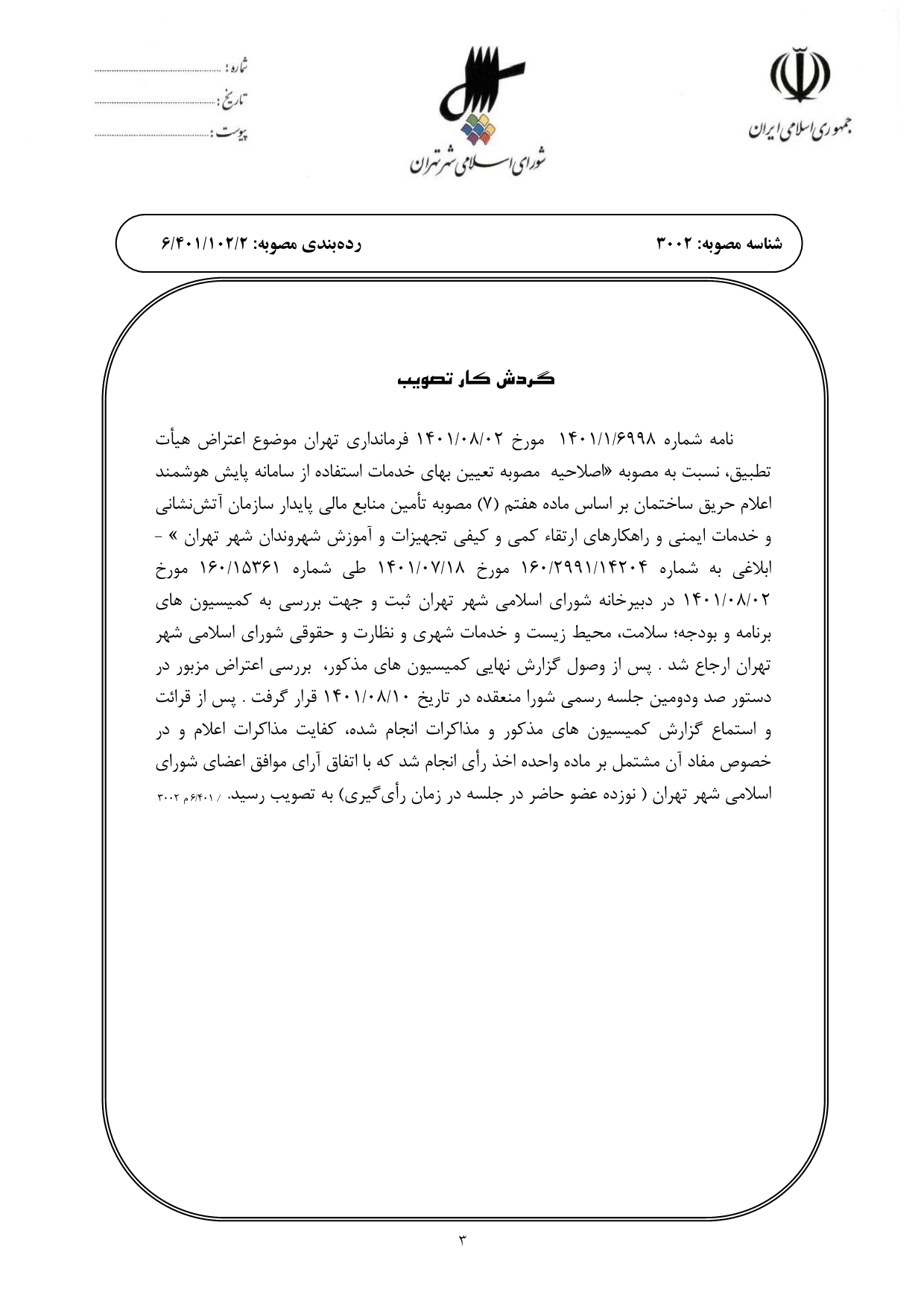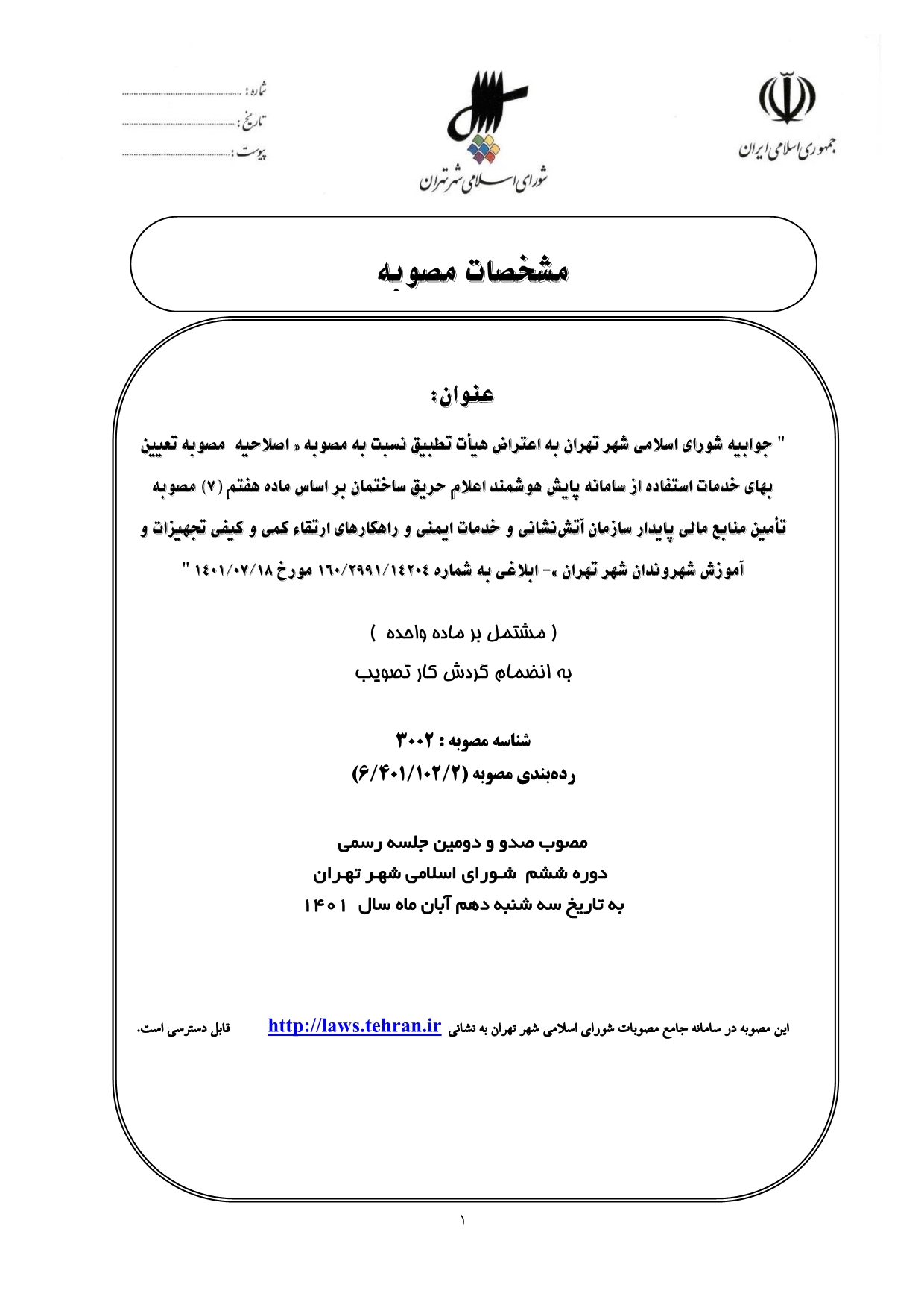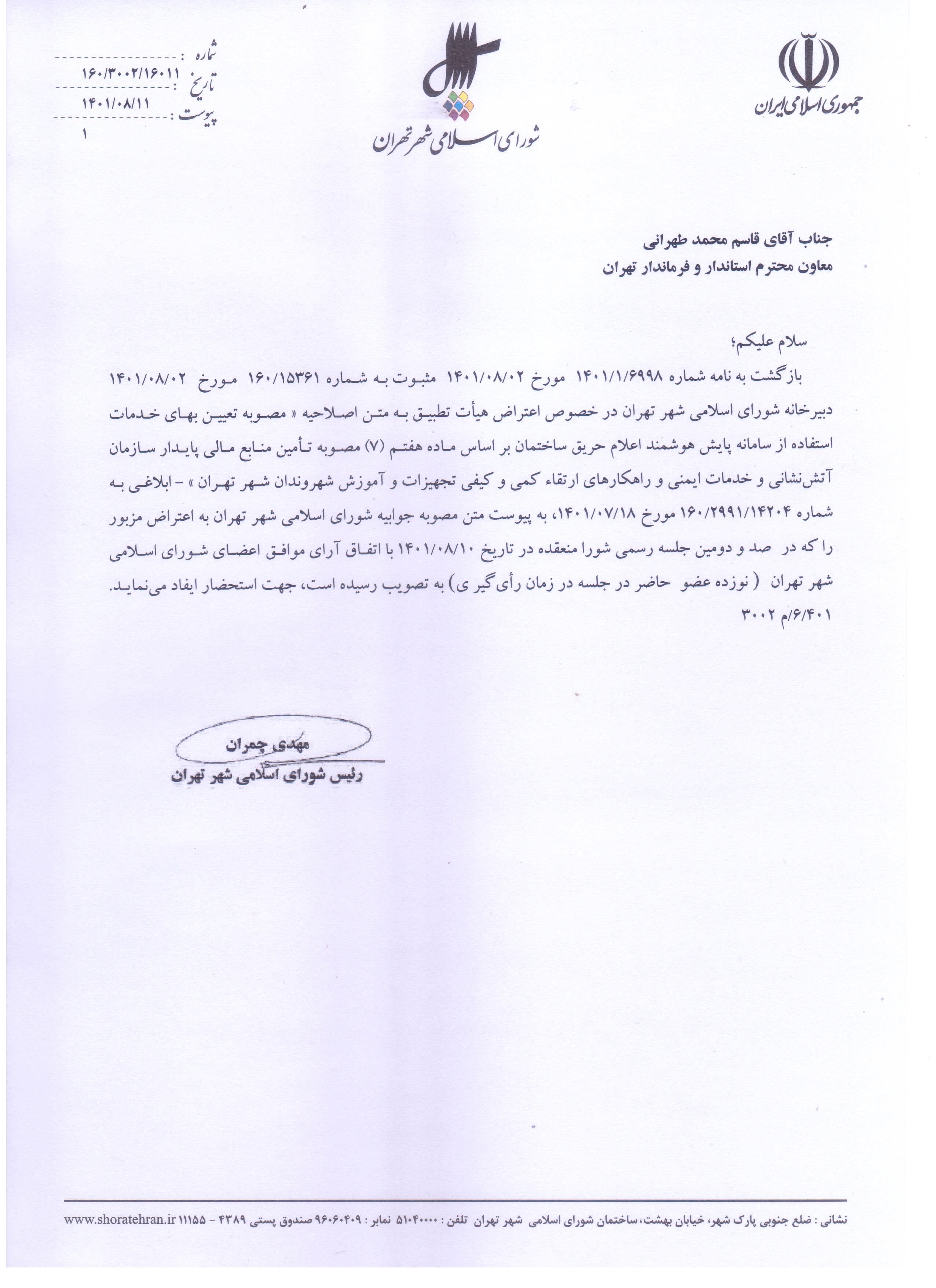 جوابيه شوراي اسلامي شهر تهران به اعتراض هيأت تطبيق نسبت به مصوبه «اصلاحيه تعيين بهاي خدمات استفاده از سامانه پايش هوشمند اعلام حريق ساختمان بر اساس ماده هفتم (7) مصوبه تأمين منابع مالي پايدار سازمان آتشنشاني و خدمات ايمني و راهكارهاي ارتقاي كمي و كيفي تجهيزات و آموزش شهروندان شهر تهران» ابلاغي به شماره 160/2991/14204 مورخ 1401/07/18