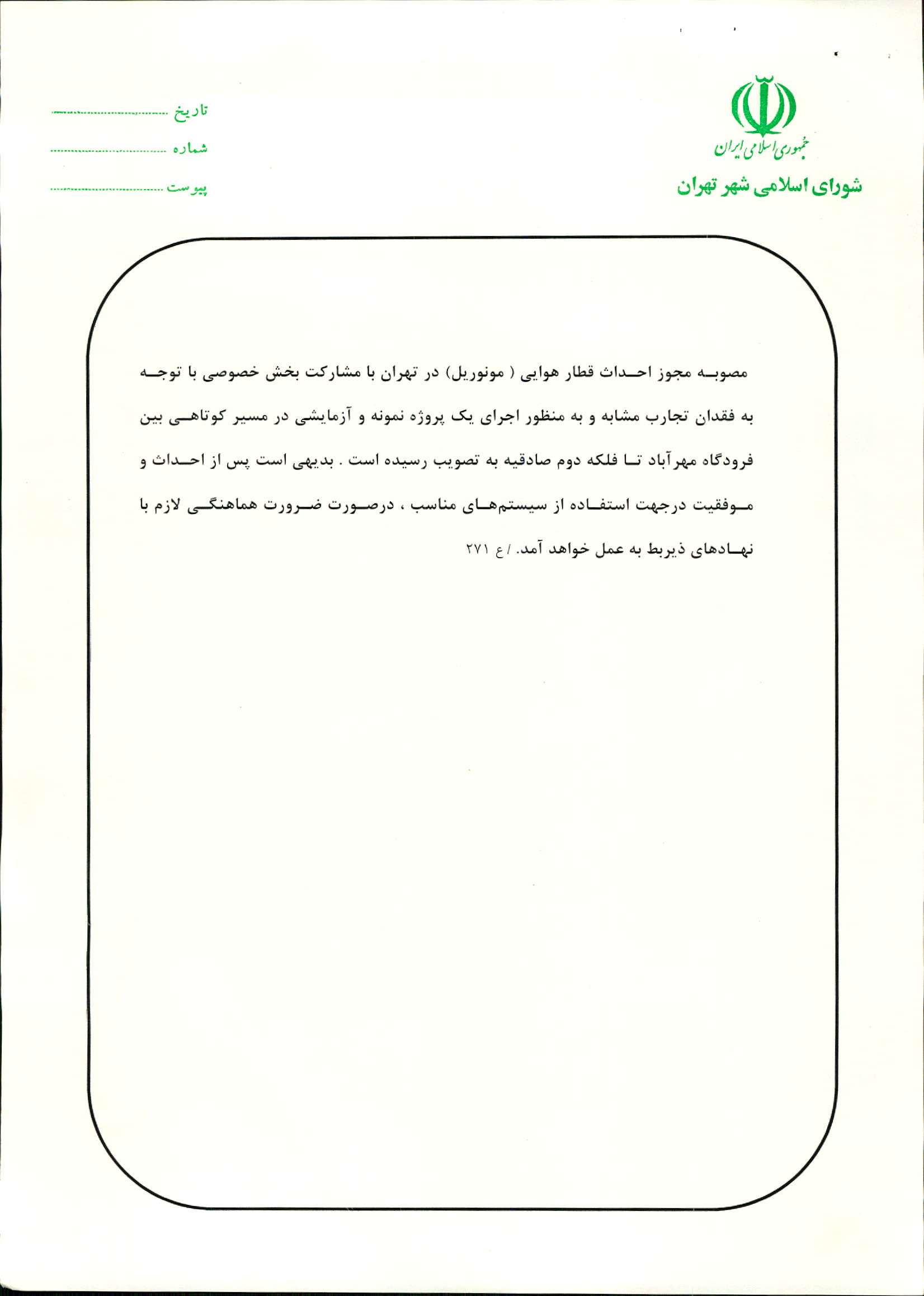 جوابيه به اعتراض شماره 1/9632 به تاريخ 82/12/26 فرمانداري تهران به متن مصوبه مجوز احداث قطار هوايي (مونوريل) در تهران با مشاركت بخش خصوصي- تصويبي در پنجاه و دومين جلسه رسمي- علني- فوق العاده شورا( دوره دوم) به تاريخ 82/12/17- ابلاغي به شماره 160/485/16806 به تاريخ 82/11/21